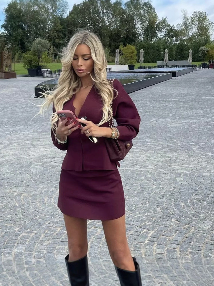 2025 Women's Winter New Simple 8 Color V-Neck Knitting Cardigan Jacket + Short Skirt Set