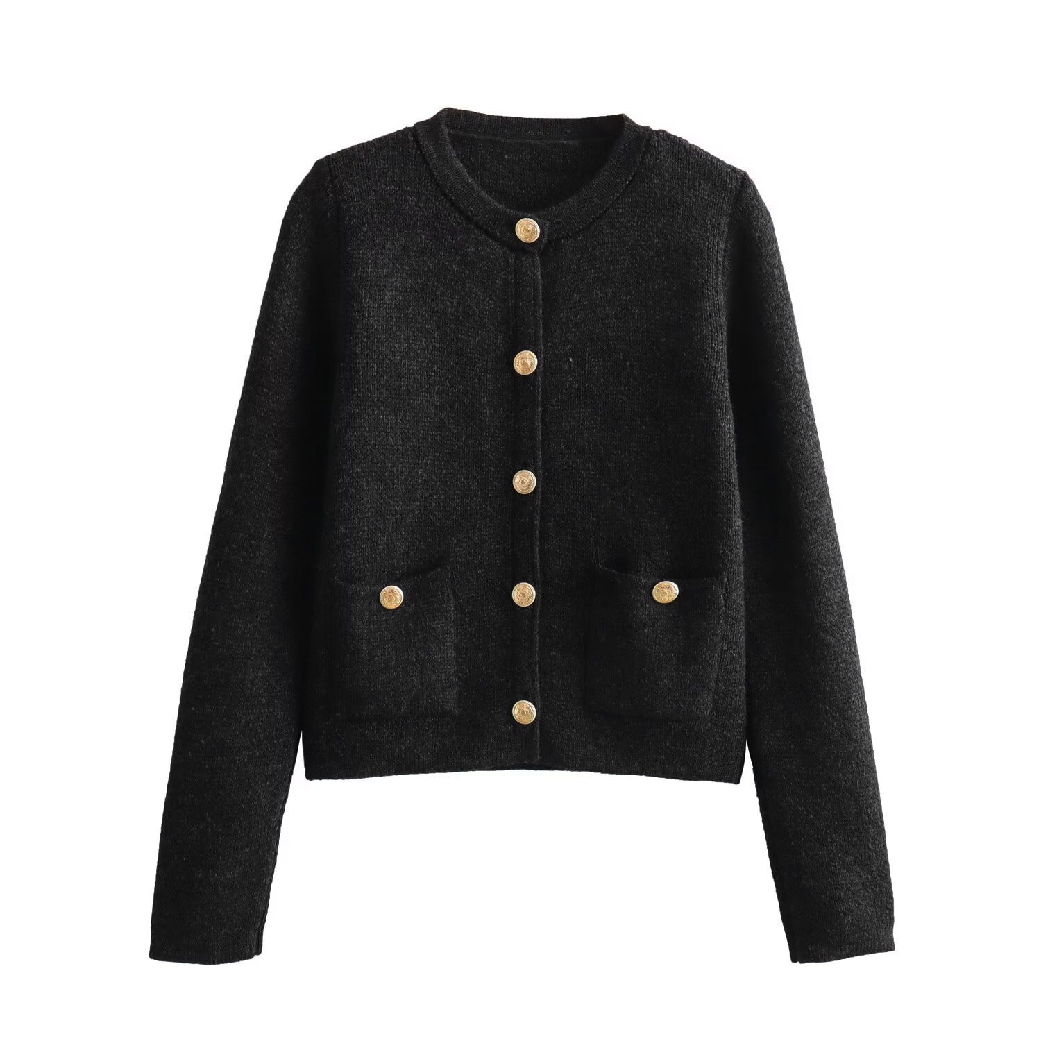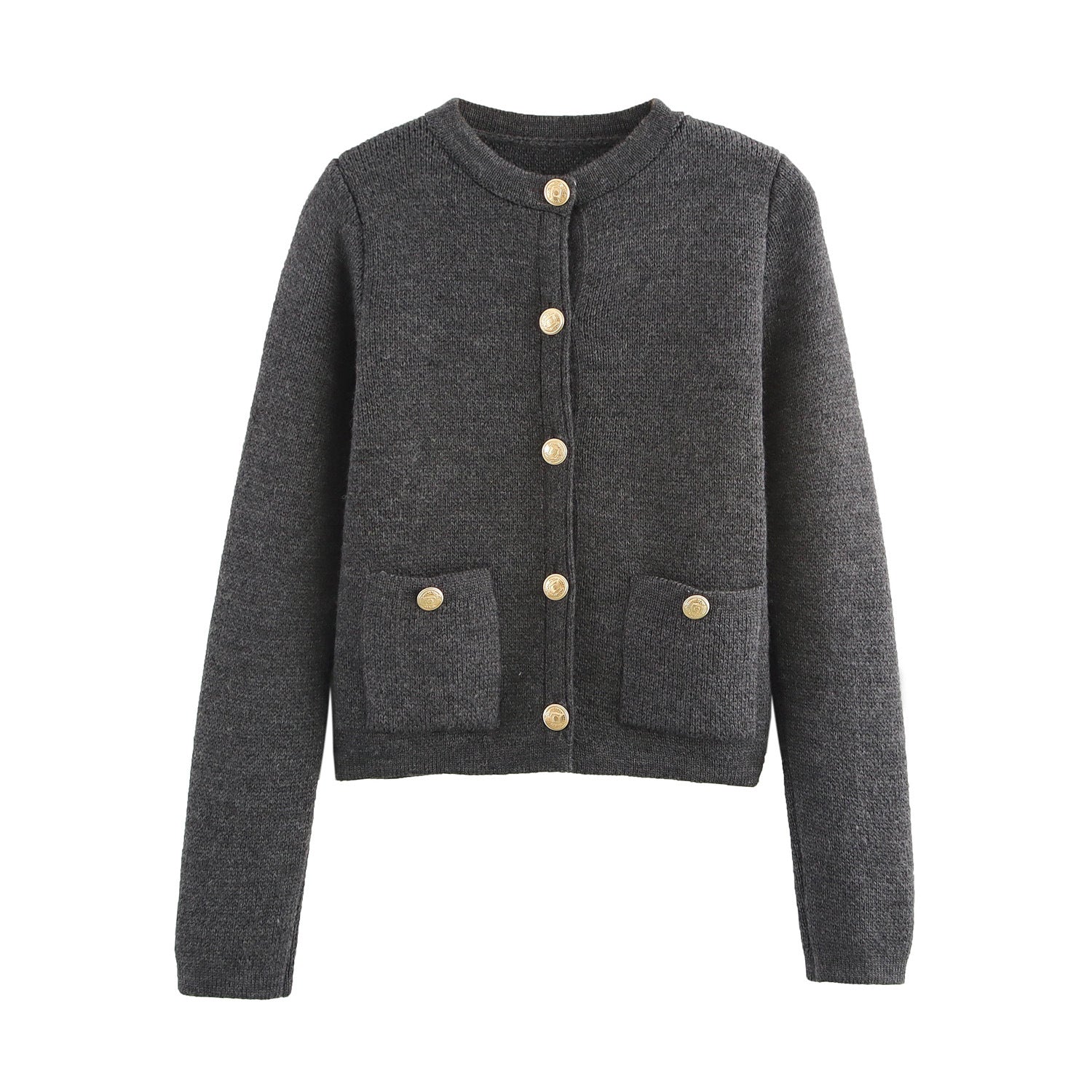 Golden Buckle-Repair Knitted Cardigan 2025 Spring Collar Bag Long-Sleeved Women's Sweater Coat