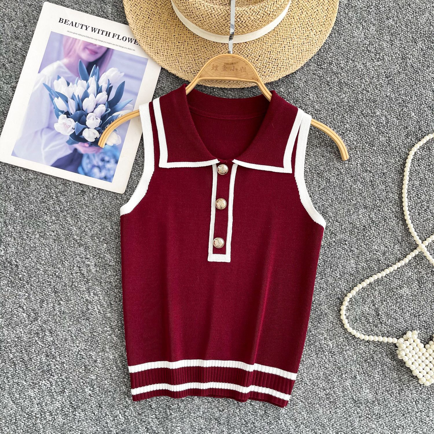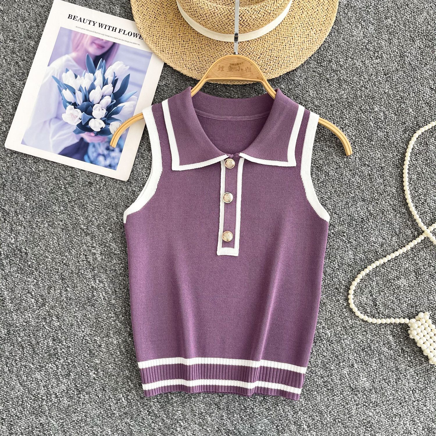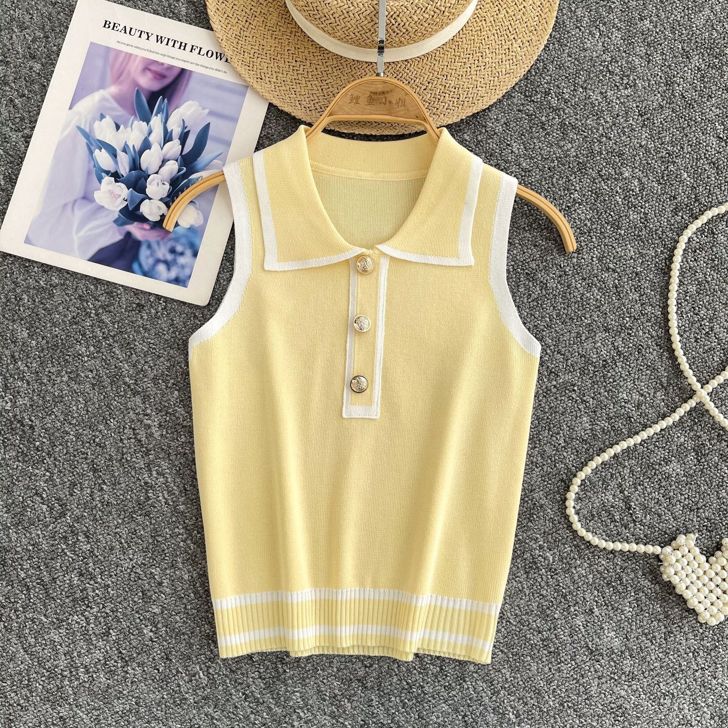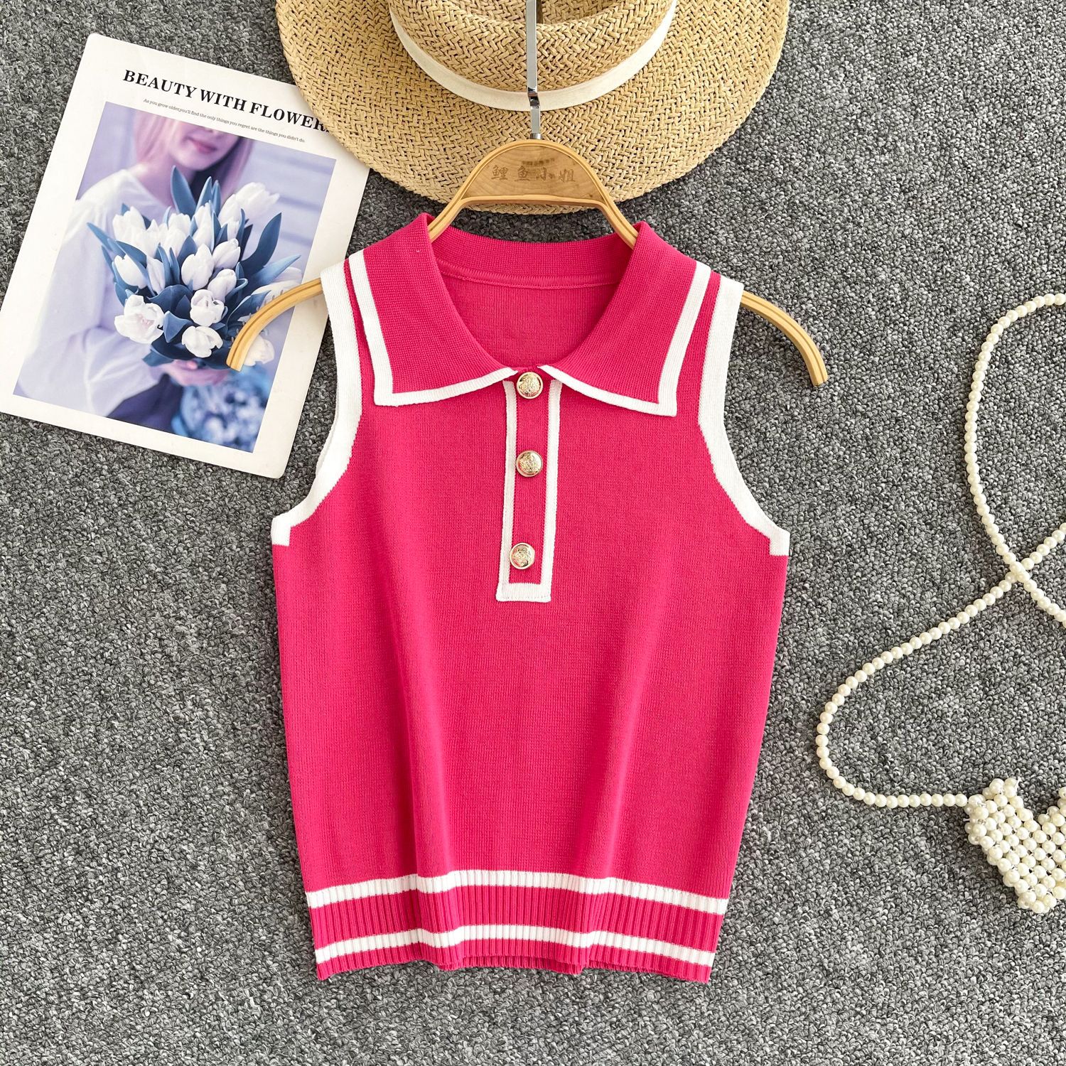 Minimalist Style Striped Knitted Sleeveless Vest Women's Summer Collar Slimming Design Chic Beautiful Little Man Top