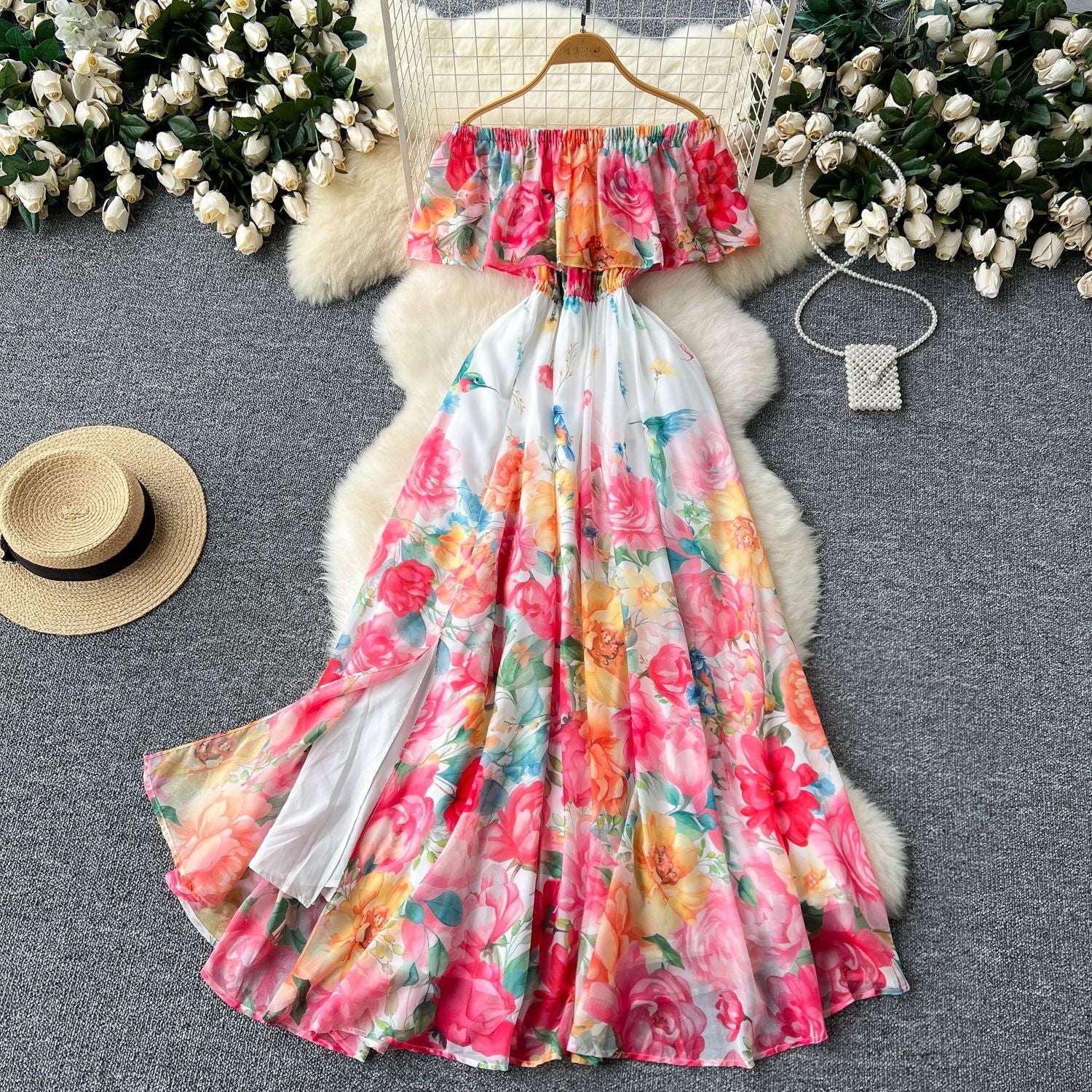 One-Word Shoulder Lotus Leaf Side Waist Dress Female Design Feel In The Pendant Pendant Print Chiffon Dress