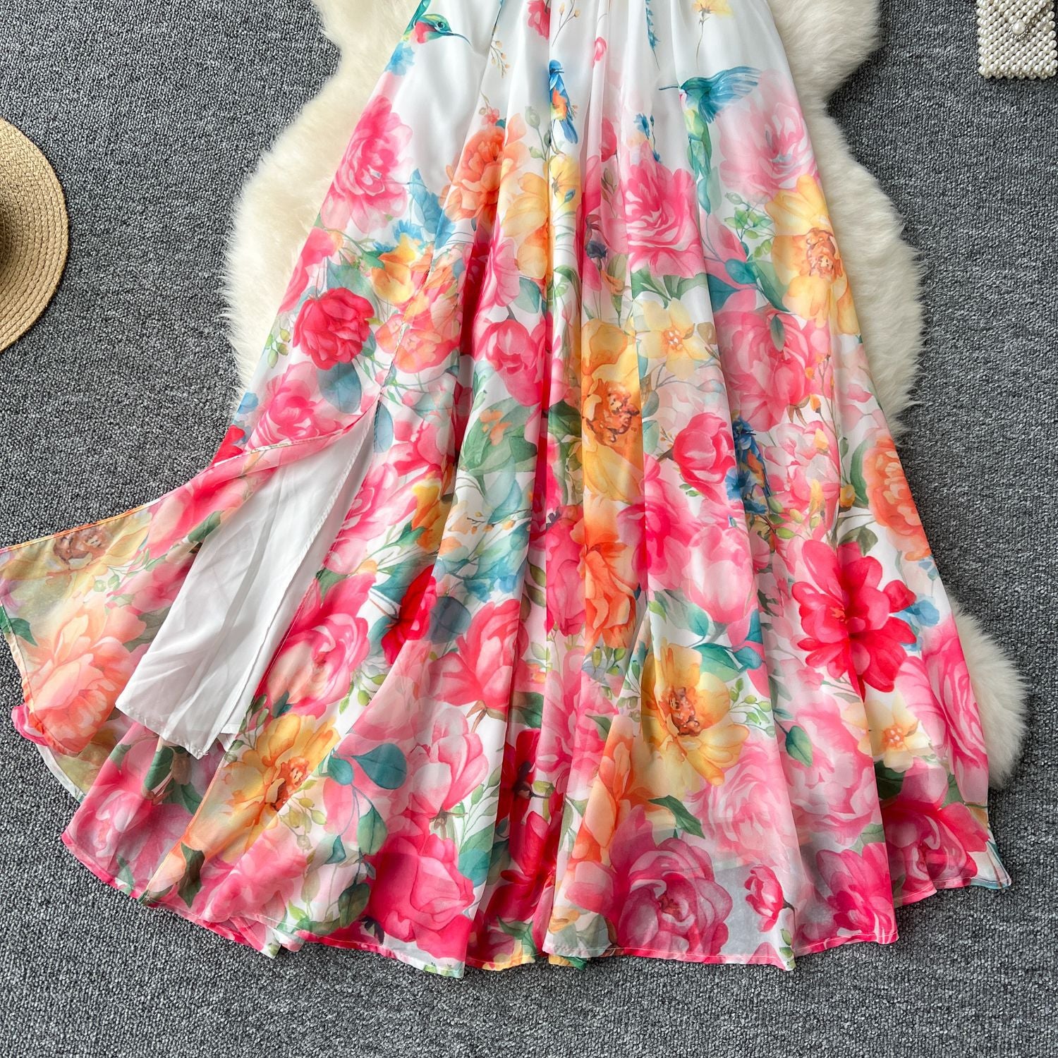 2025 Summer Dress New Niche Light Familiar Wind V To Receive Waist Thin Temperament French Pressure Folding Printing Chiffon Dress