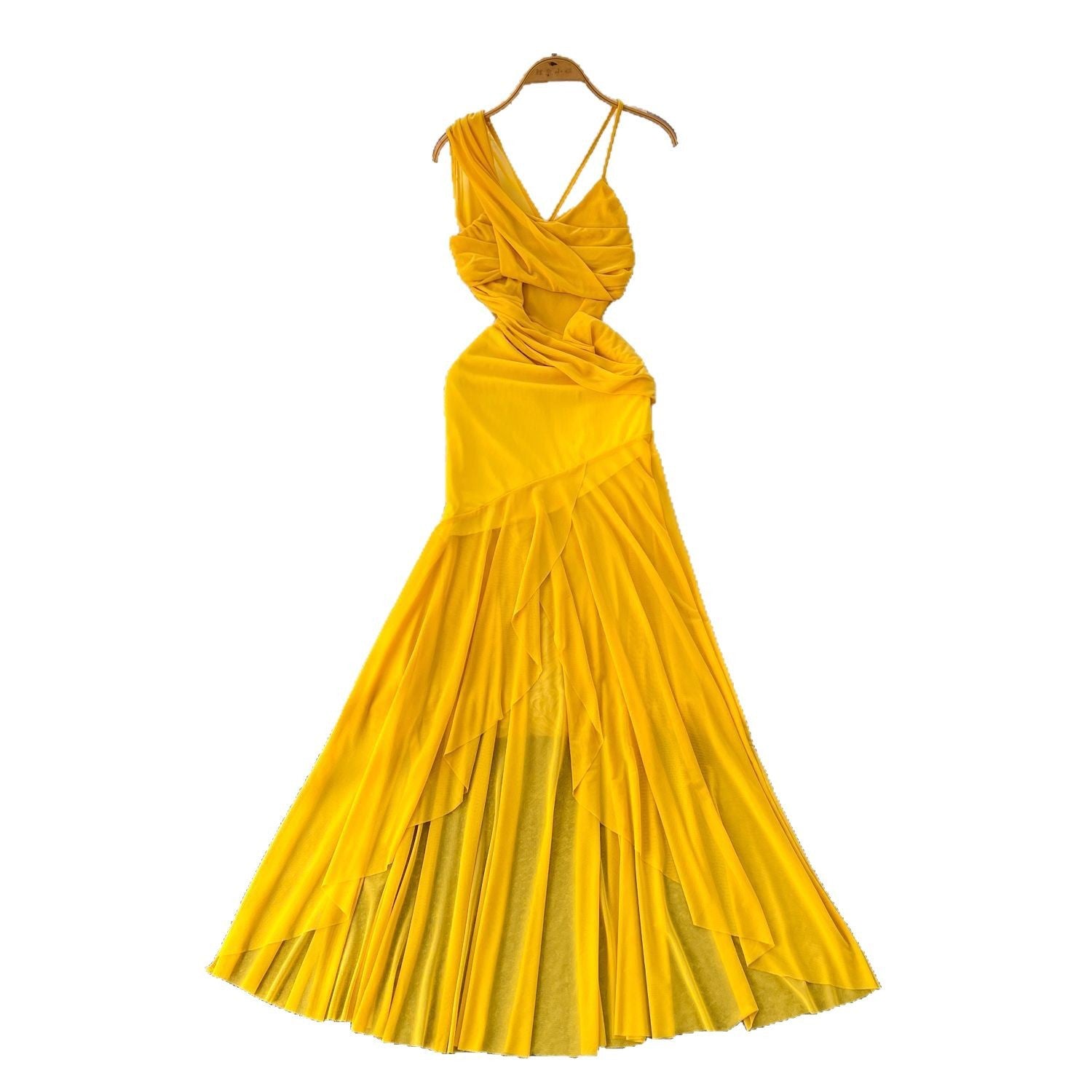 Yellow Dress Women's Holiday Dress 2025 New Heart Machine Shoulder Slings Irregular Bagged Dress