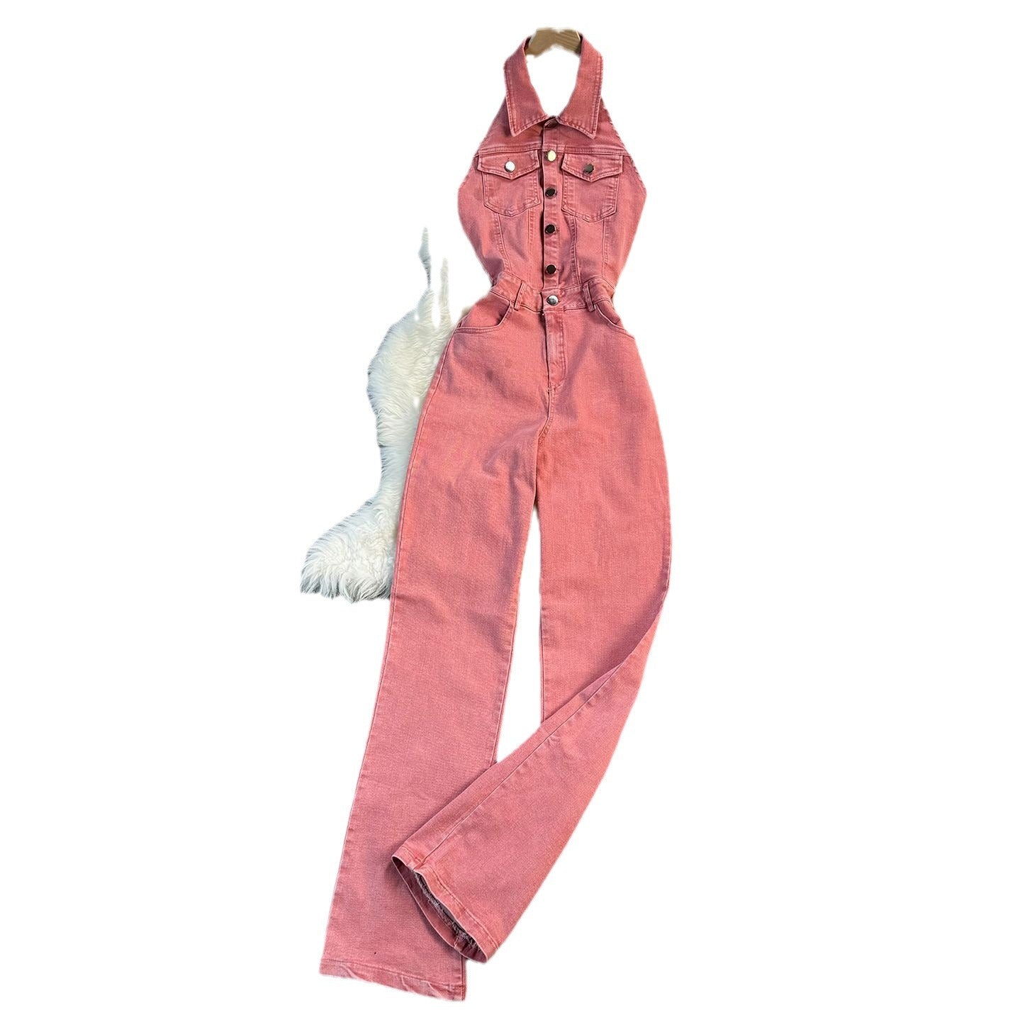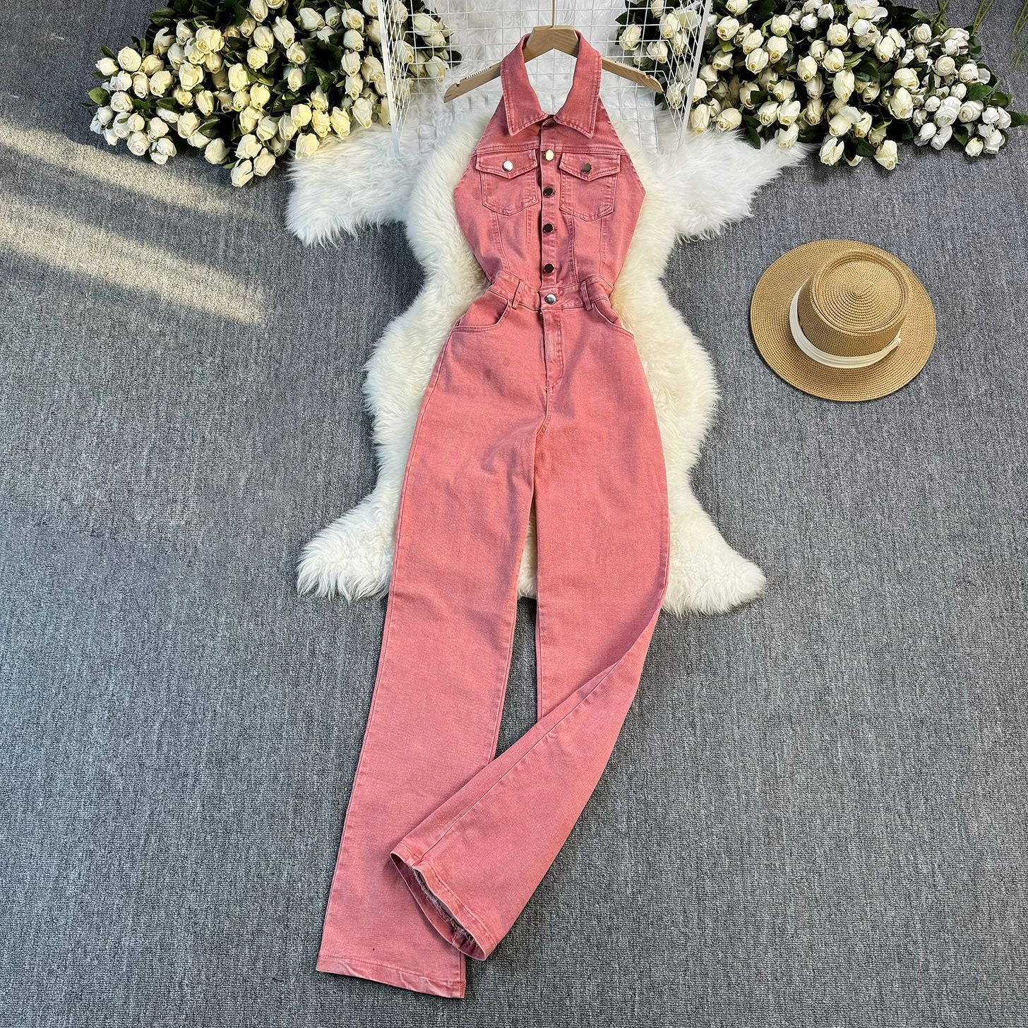 Summer Denim Panties Femininity Hanging Neck Sleeveless Backs High Waist Slimmed Denim Jumpsuit
