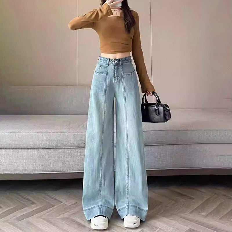 Wash Blue High-Waisted Broad-Legged Jeans Women Spring And Autumn New Loose Meat Masking Display Lean Vertical Tube Drag Long Pants