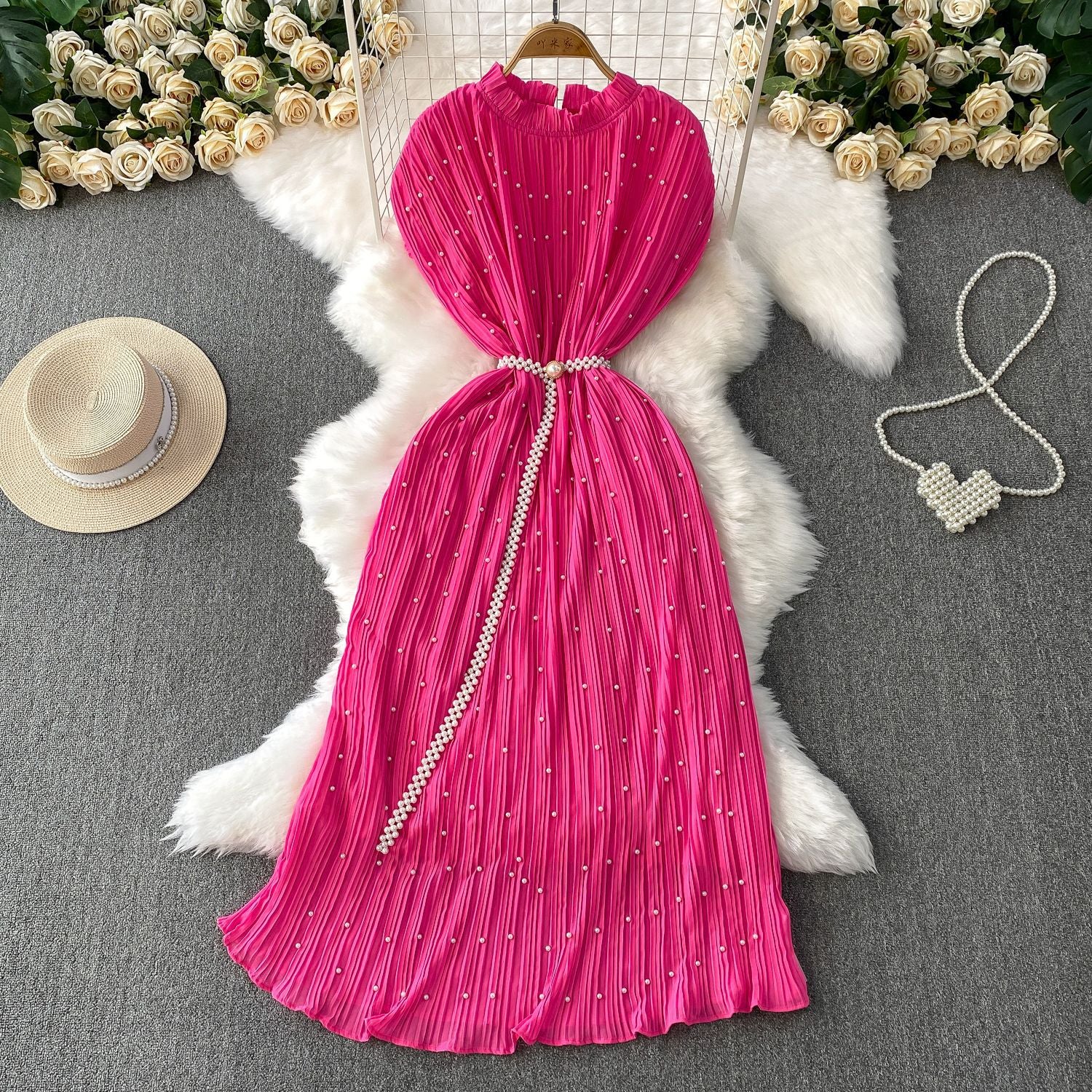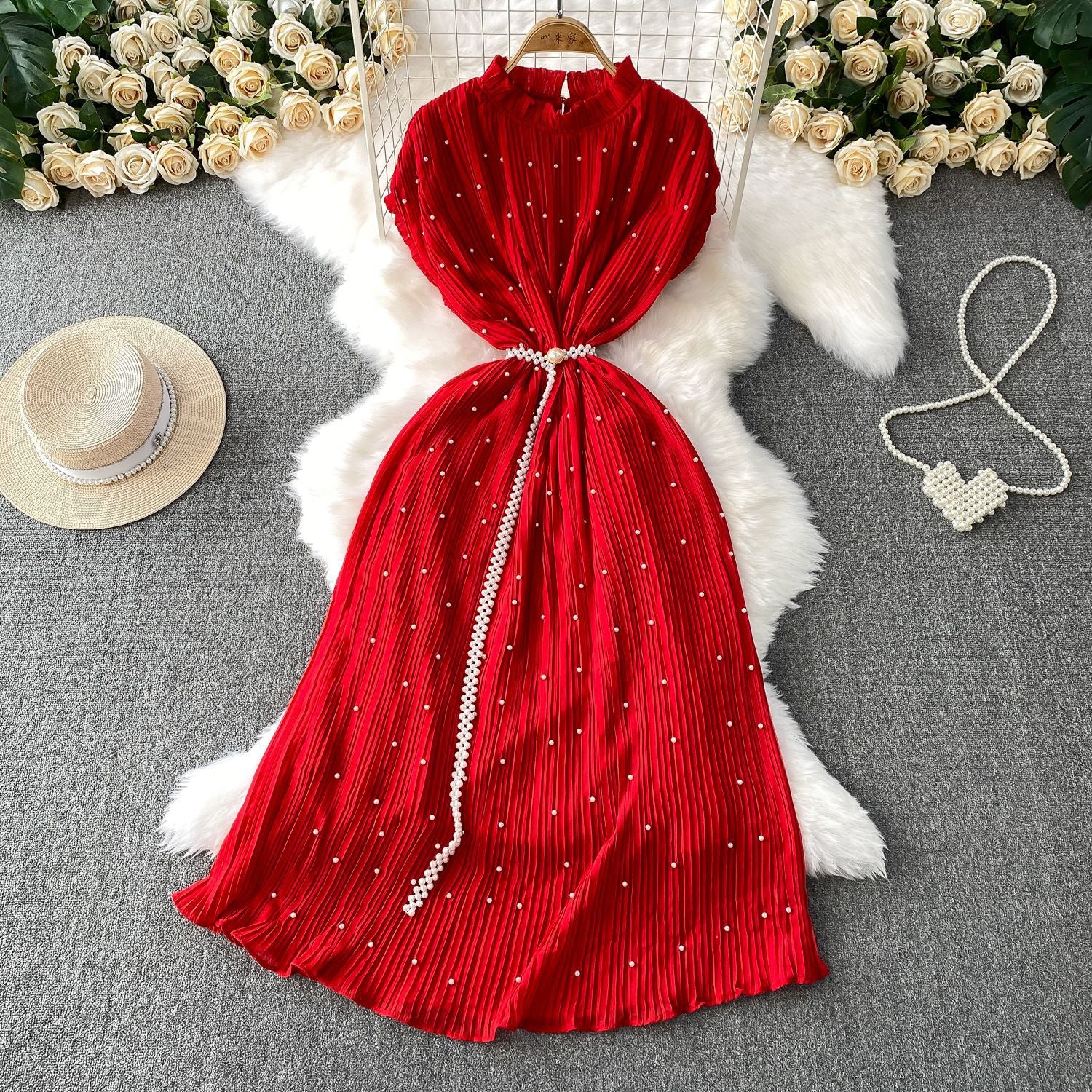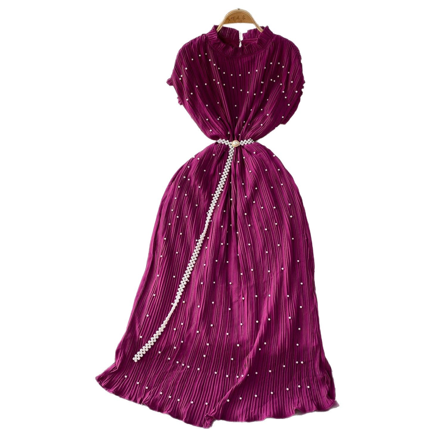 Famous Temperament Heavy Industry Pearl Wood Ear Round Collar Dress Women's Summer New Waist Thin 100 Folded Long Skirt