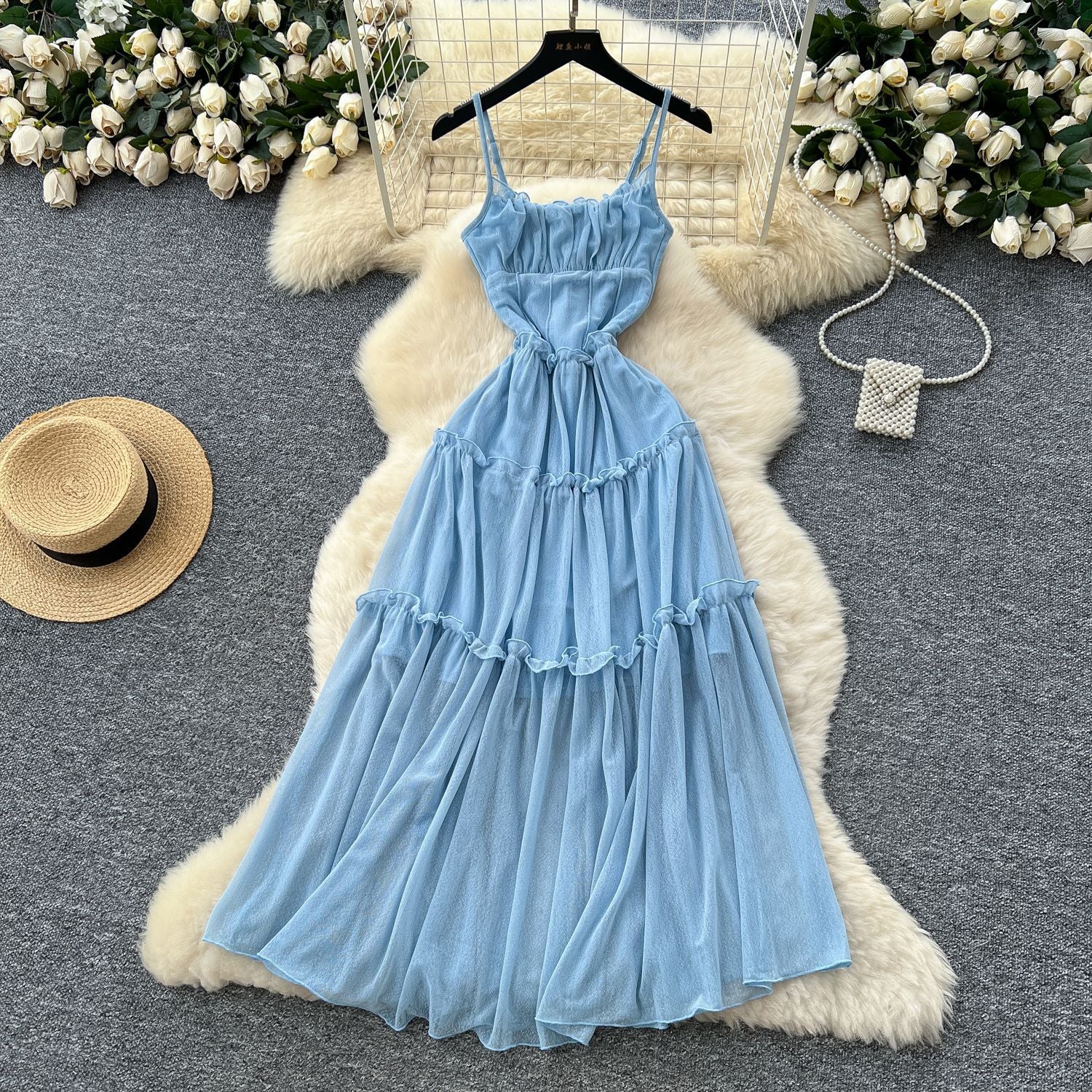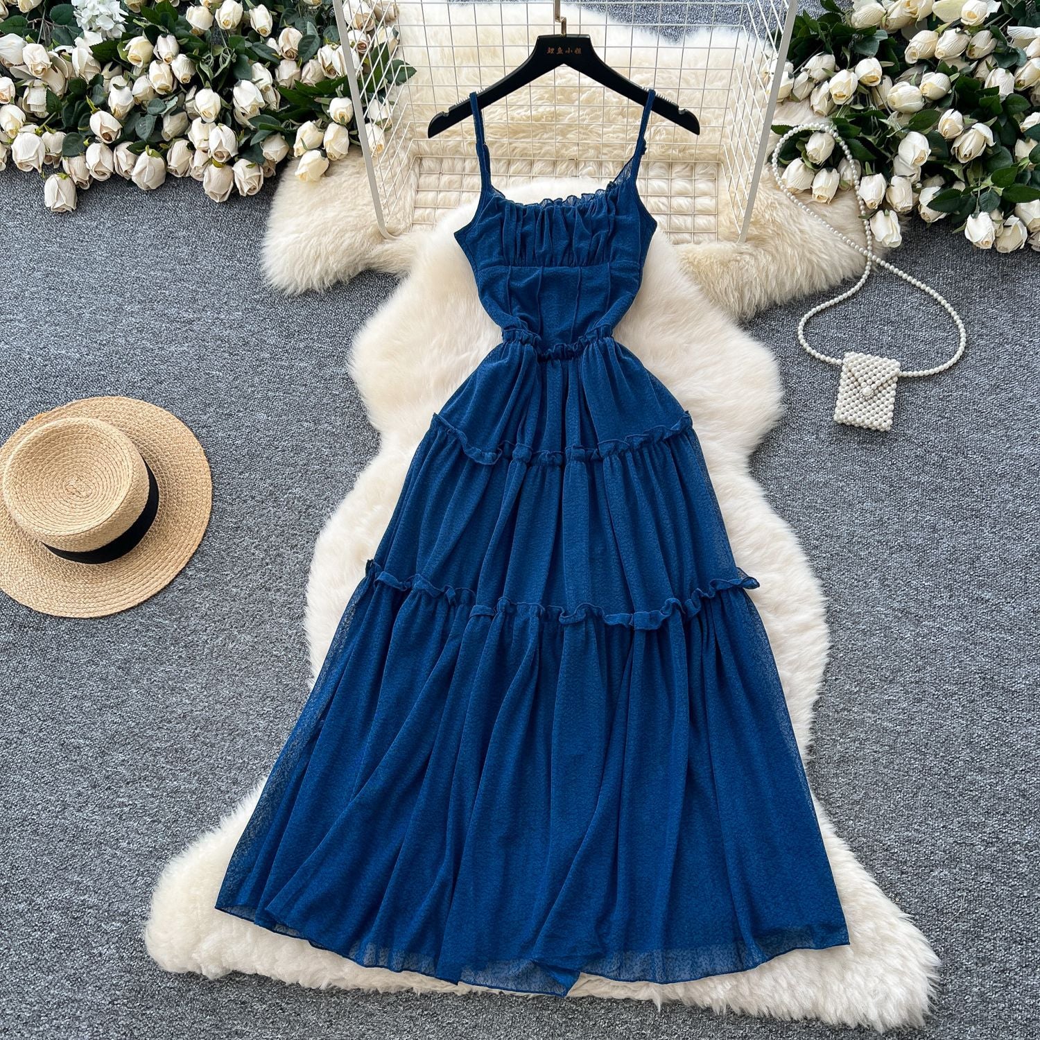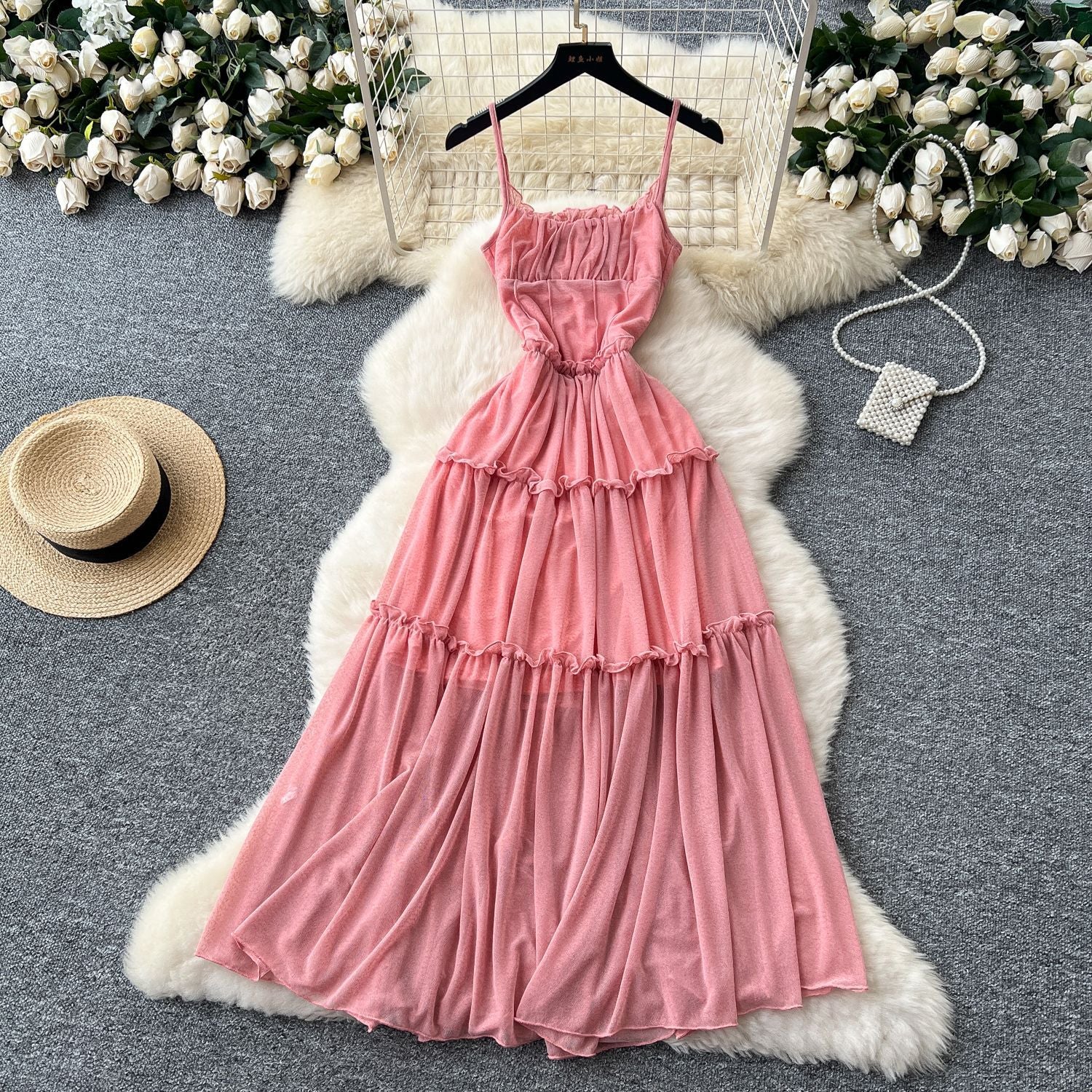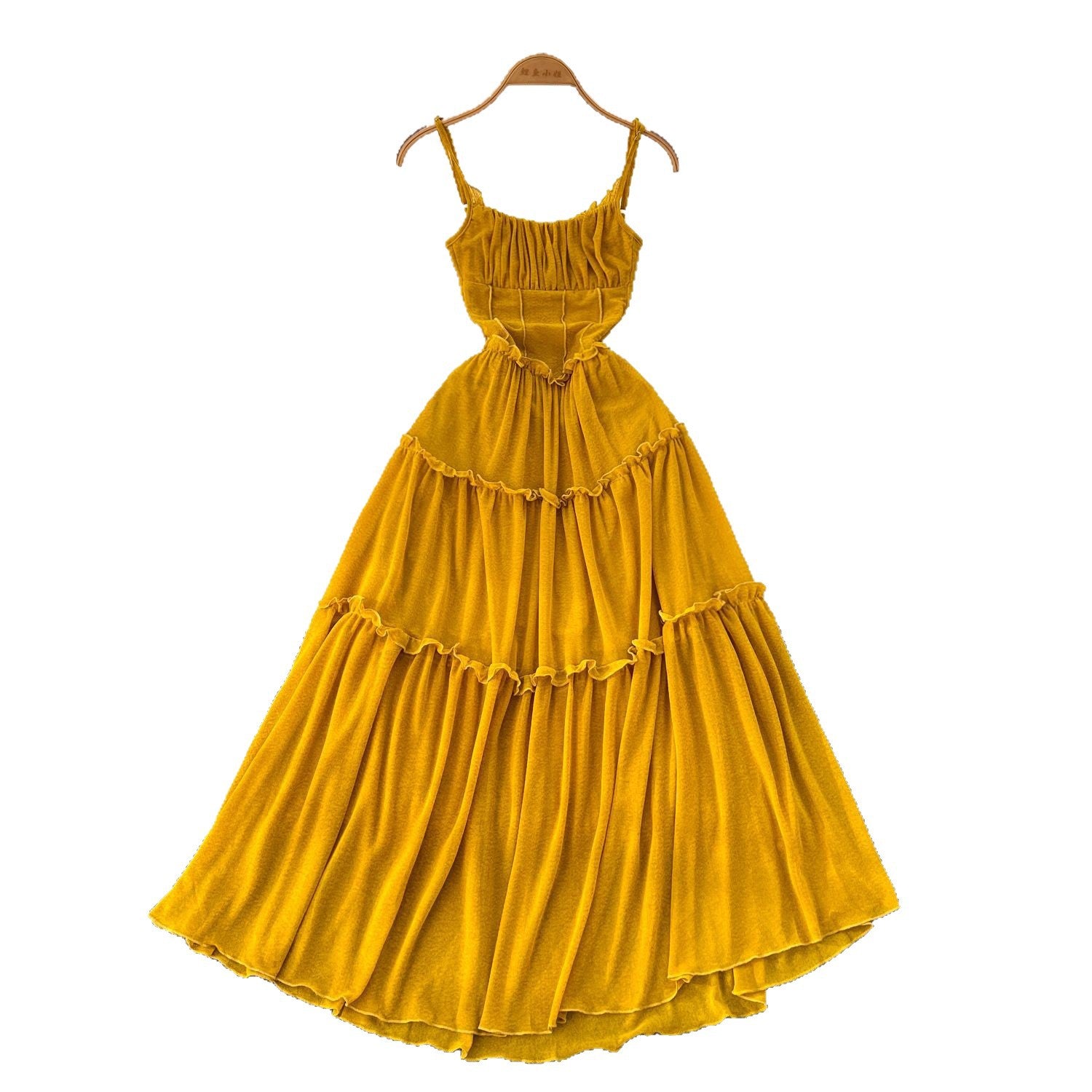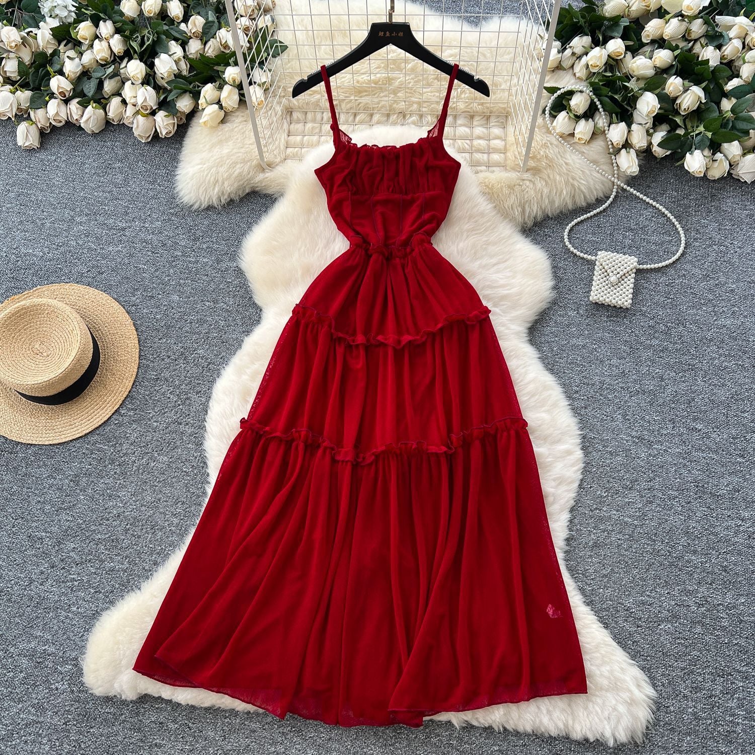 French Tea Break Retro Sling Dress Women's Holiday Wind To Show Thin Folds Design Long Skirt