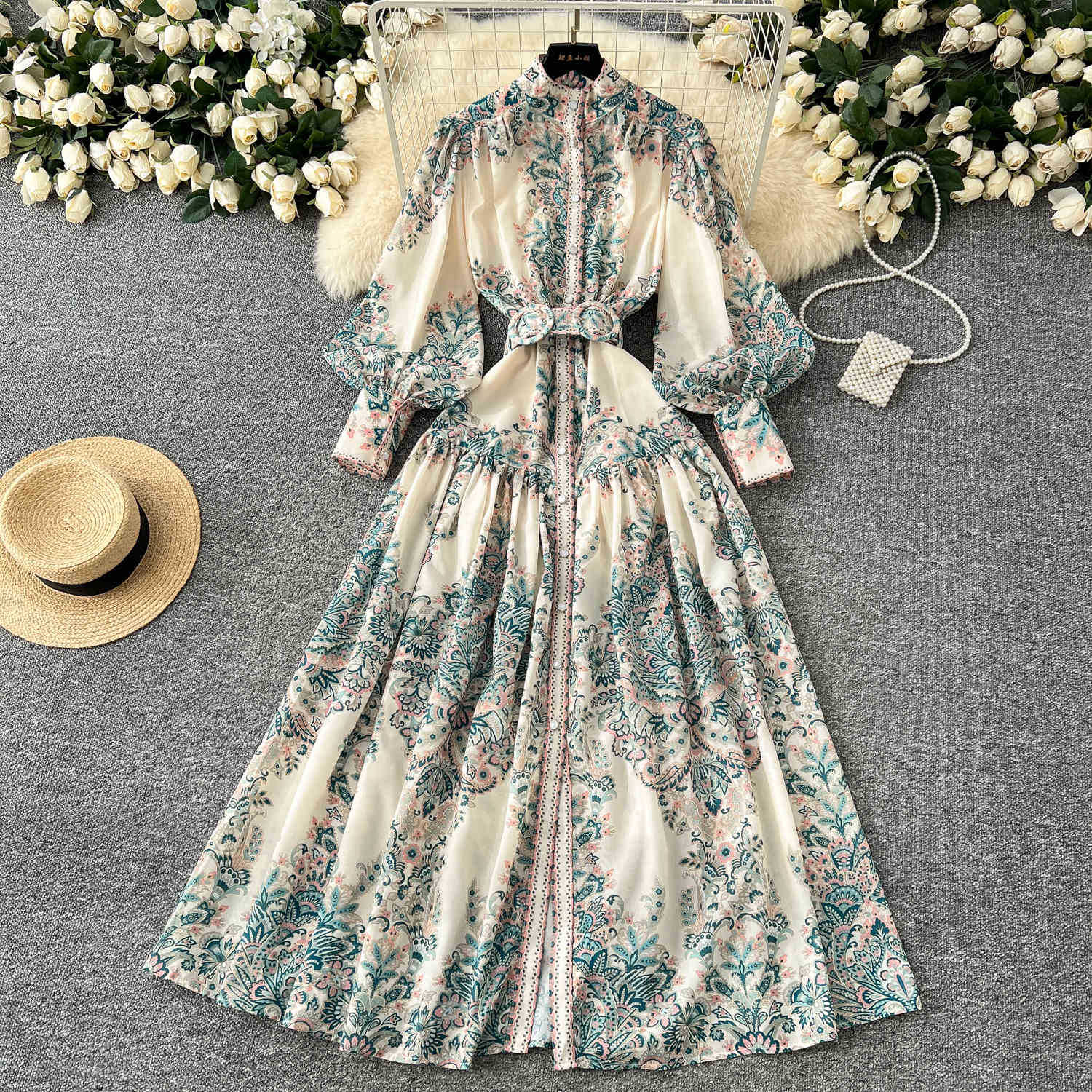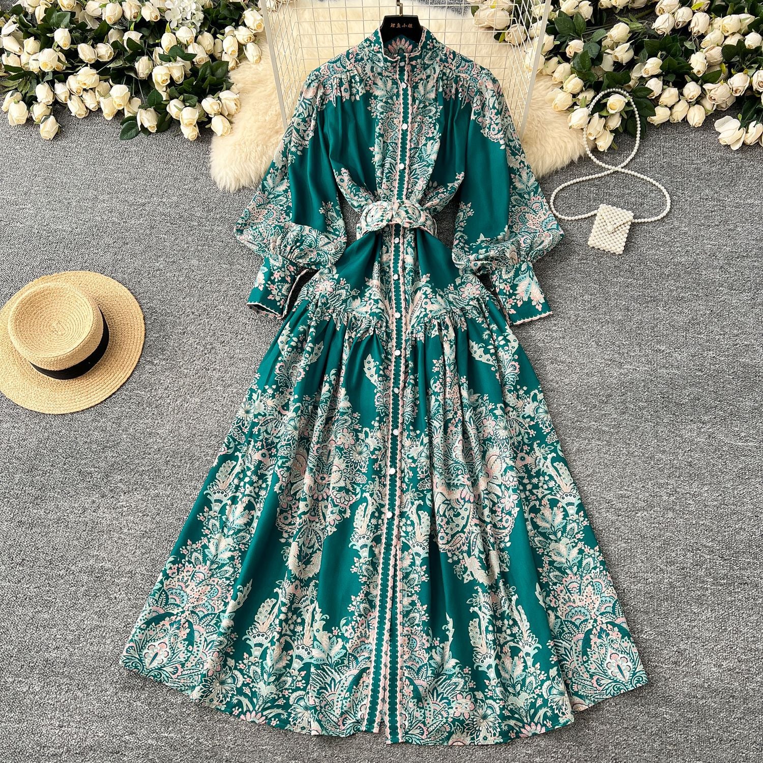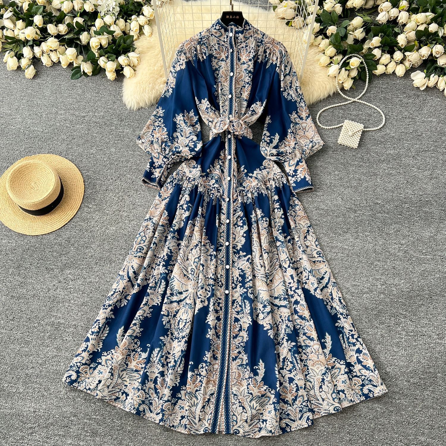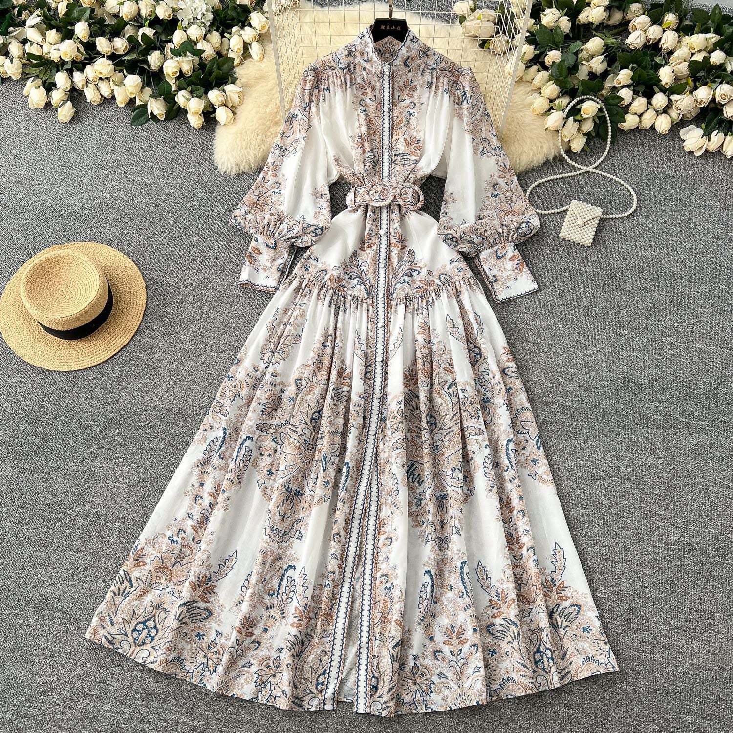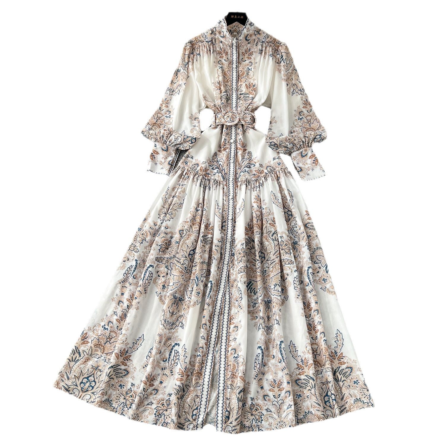 Holiday Style Dress Women's Spring Court Collar Lantern Sleeves To Close The Waist Single Buckle Printing Folded Long Skirt