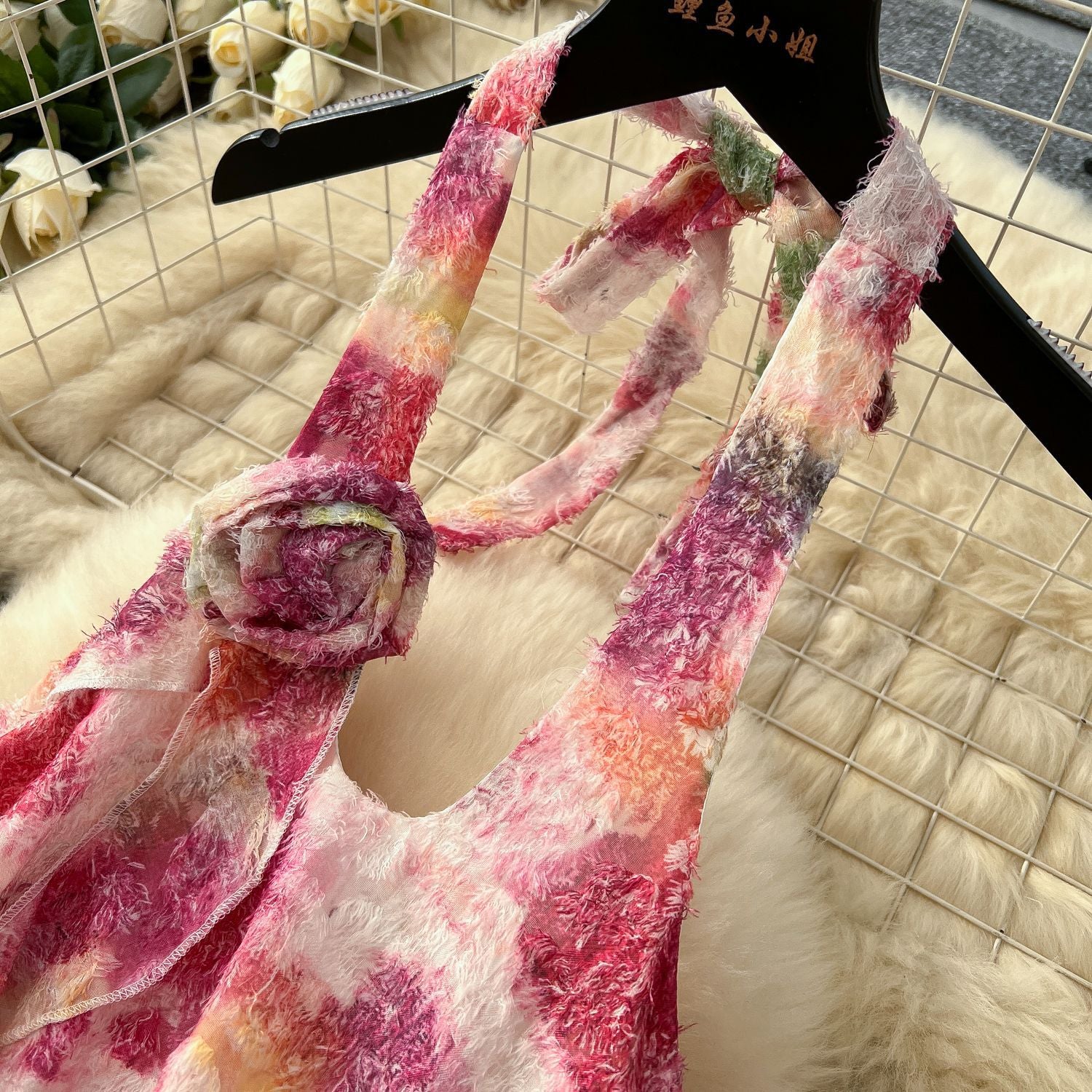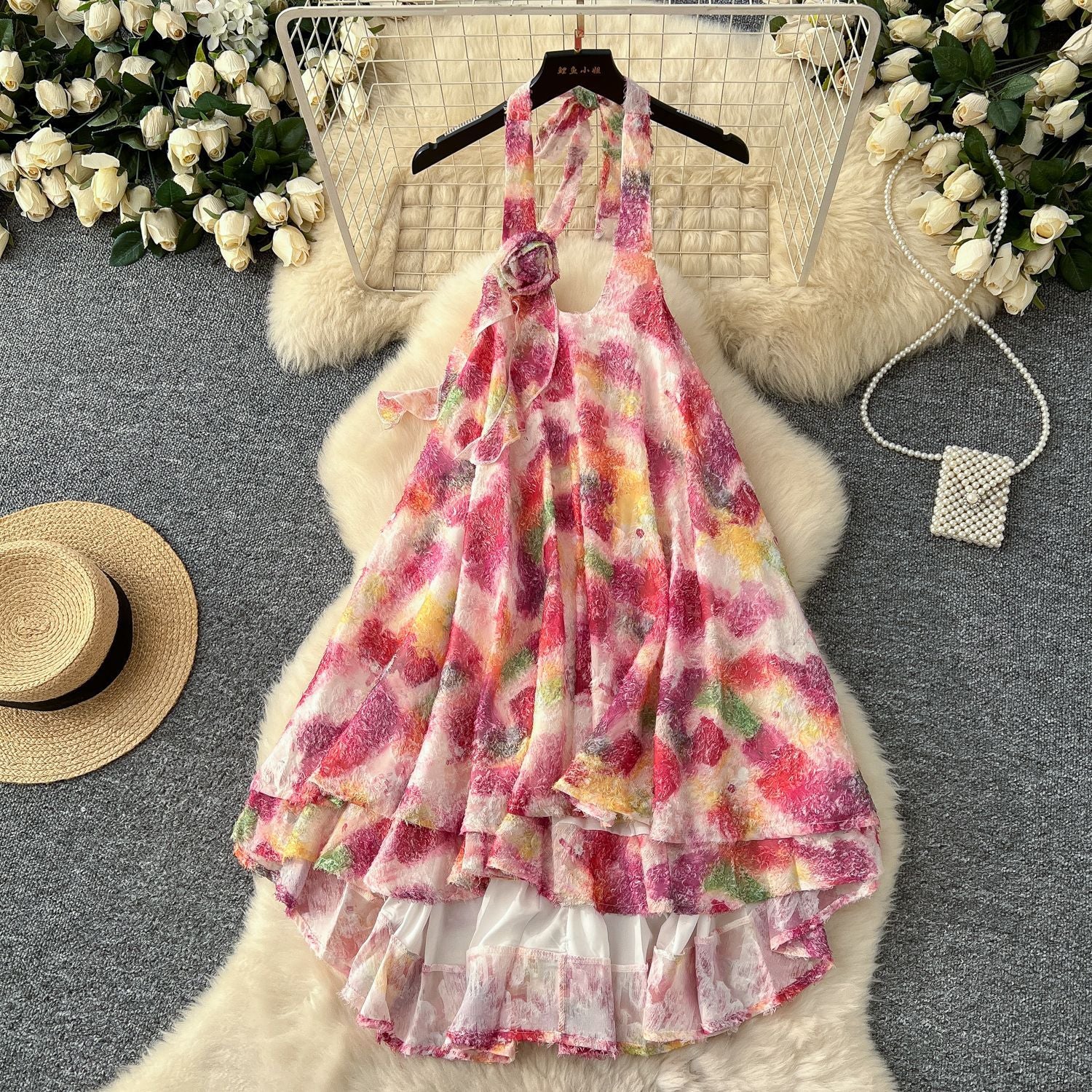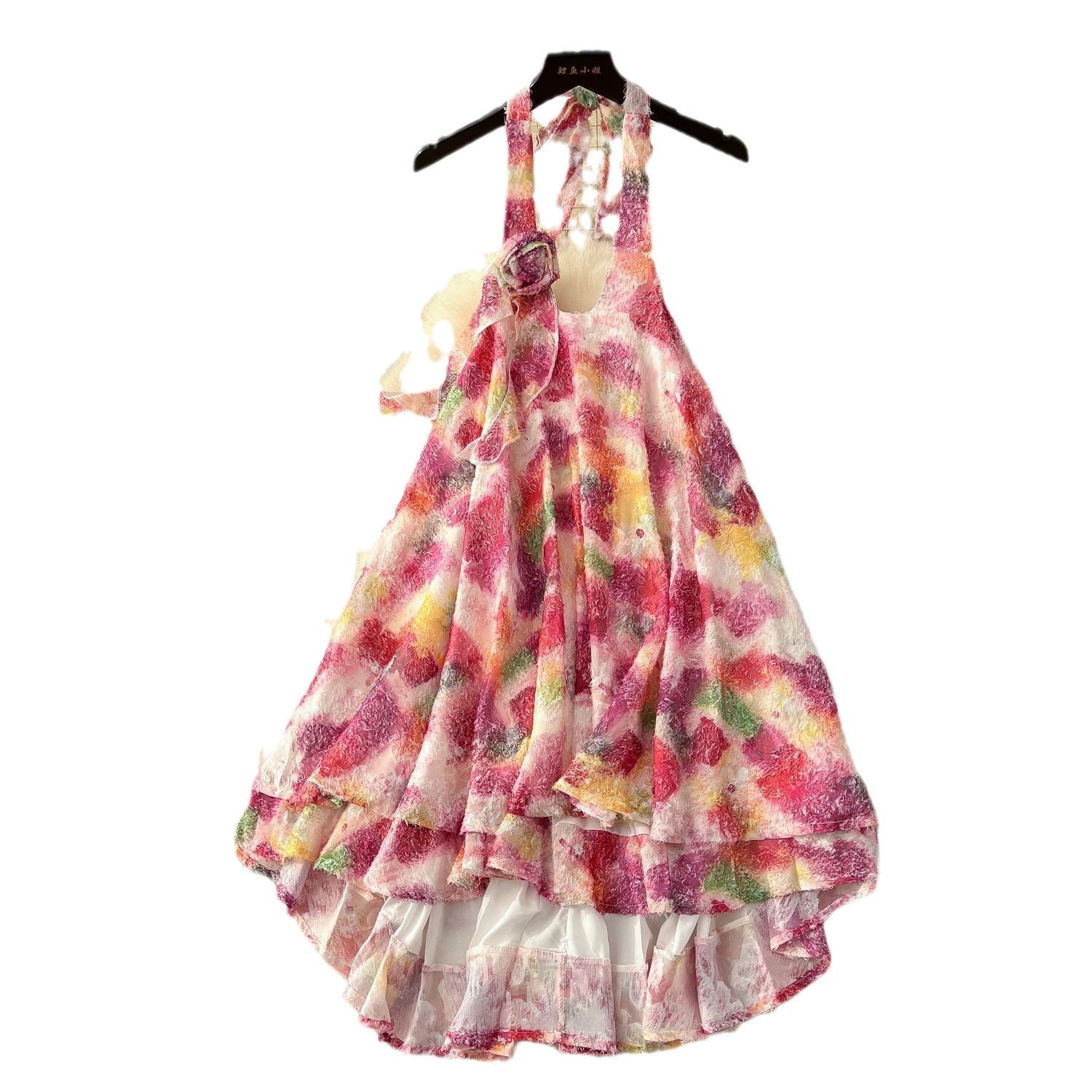 Summer Three-Dimensional Flowers Hanging Neck Slings Loose Short A-Shaped Dress Women's Lotus Leaf Side Vacation Skirt