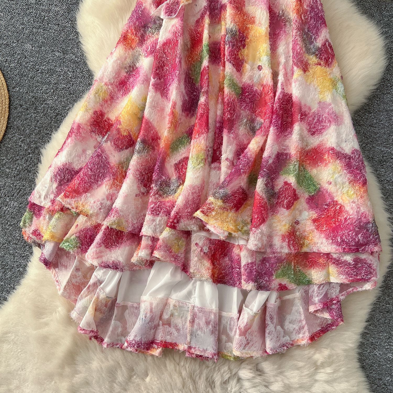 2025 Summer Dress New Niche Light Familiar Wind V To Receive Waist Thin Temperament French Pressure Folding Printing Chiffon Dress