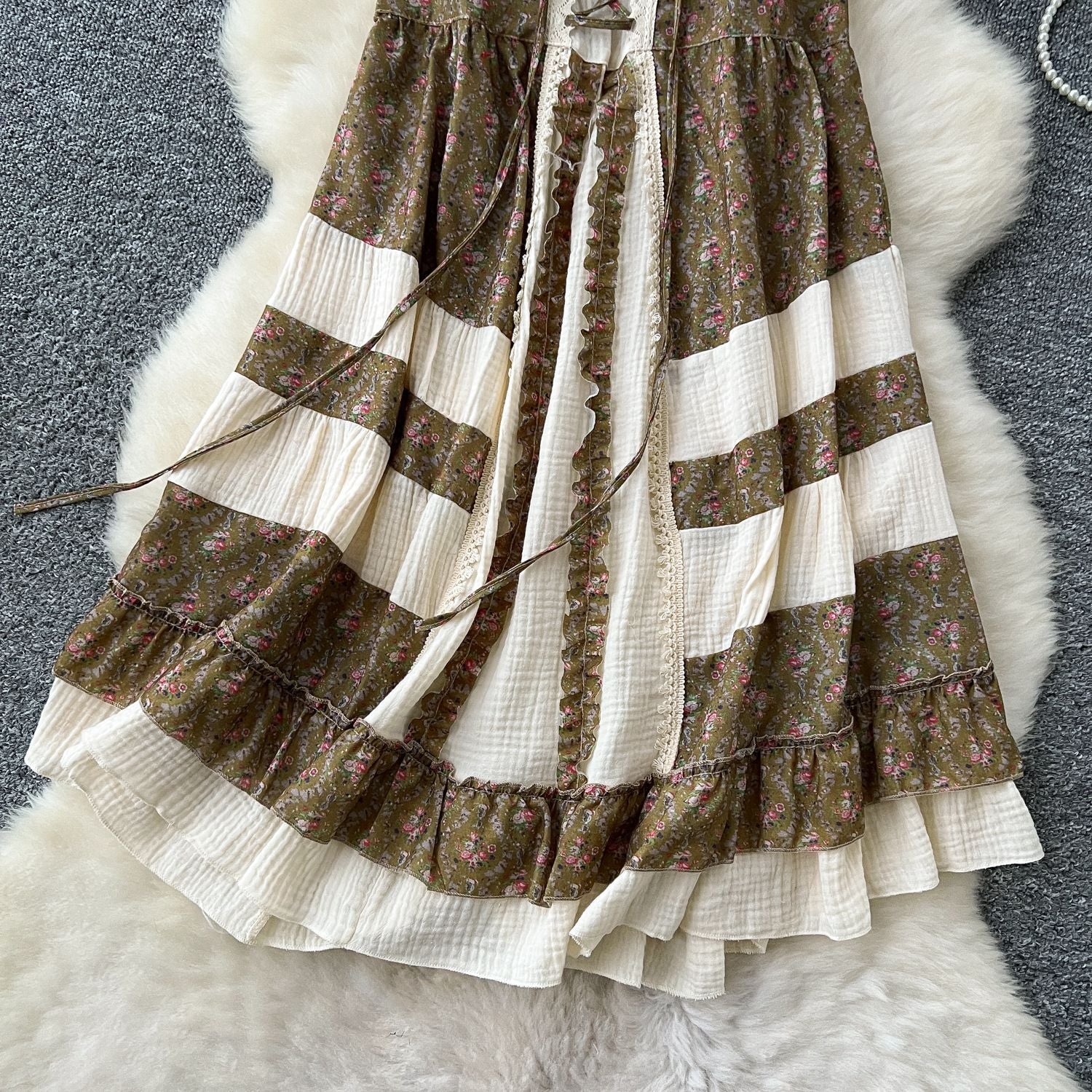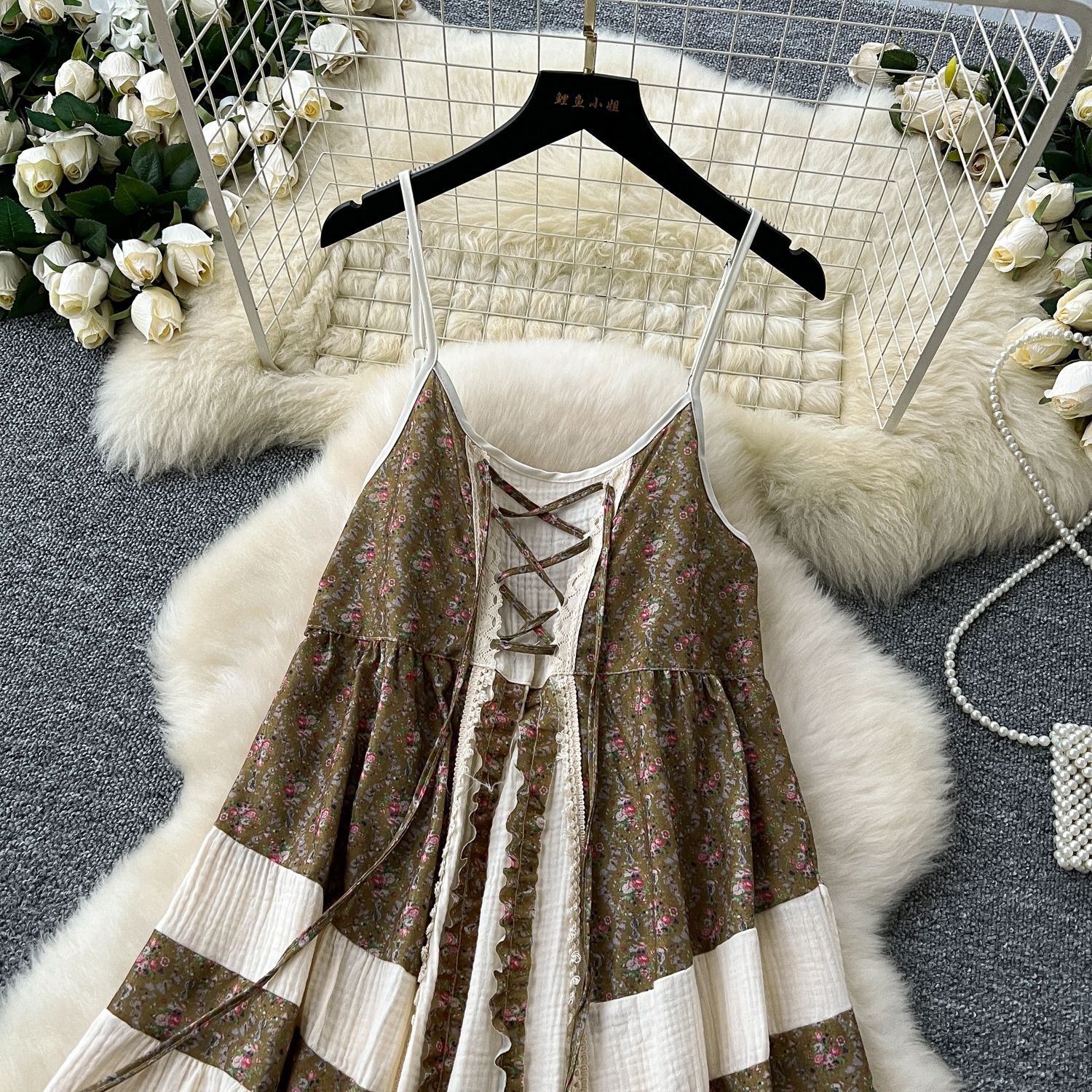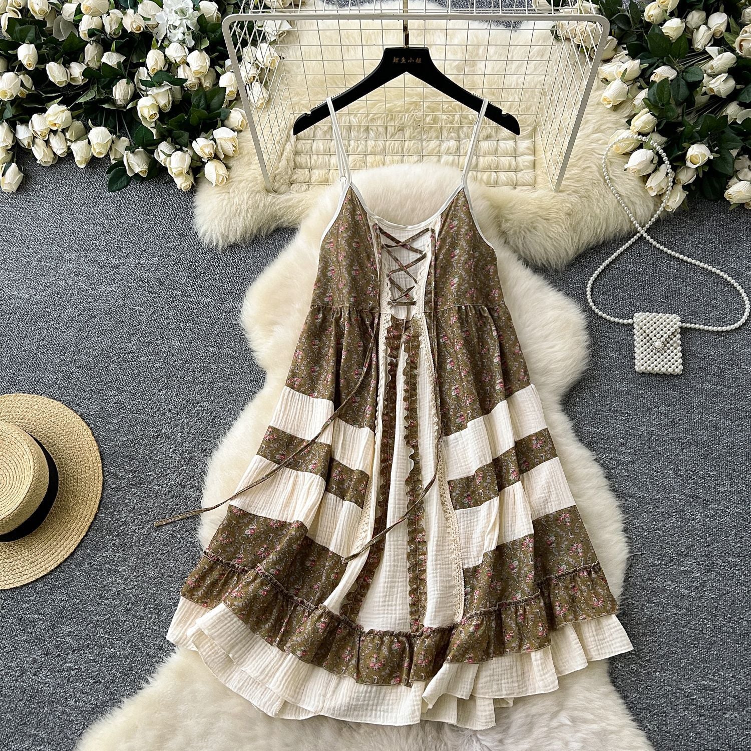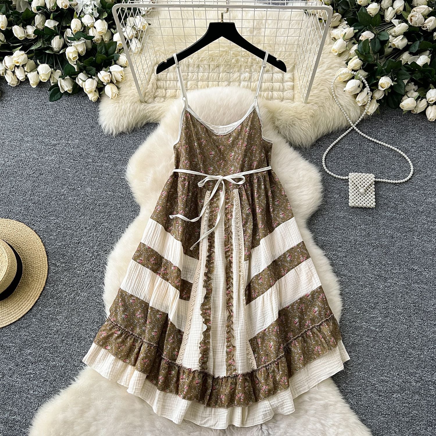 Tourism National Style Wearing Holiday Dress Retro Strap Design Spliced Flowers Hanging Loose Dress Skirt Skirt