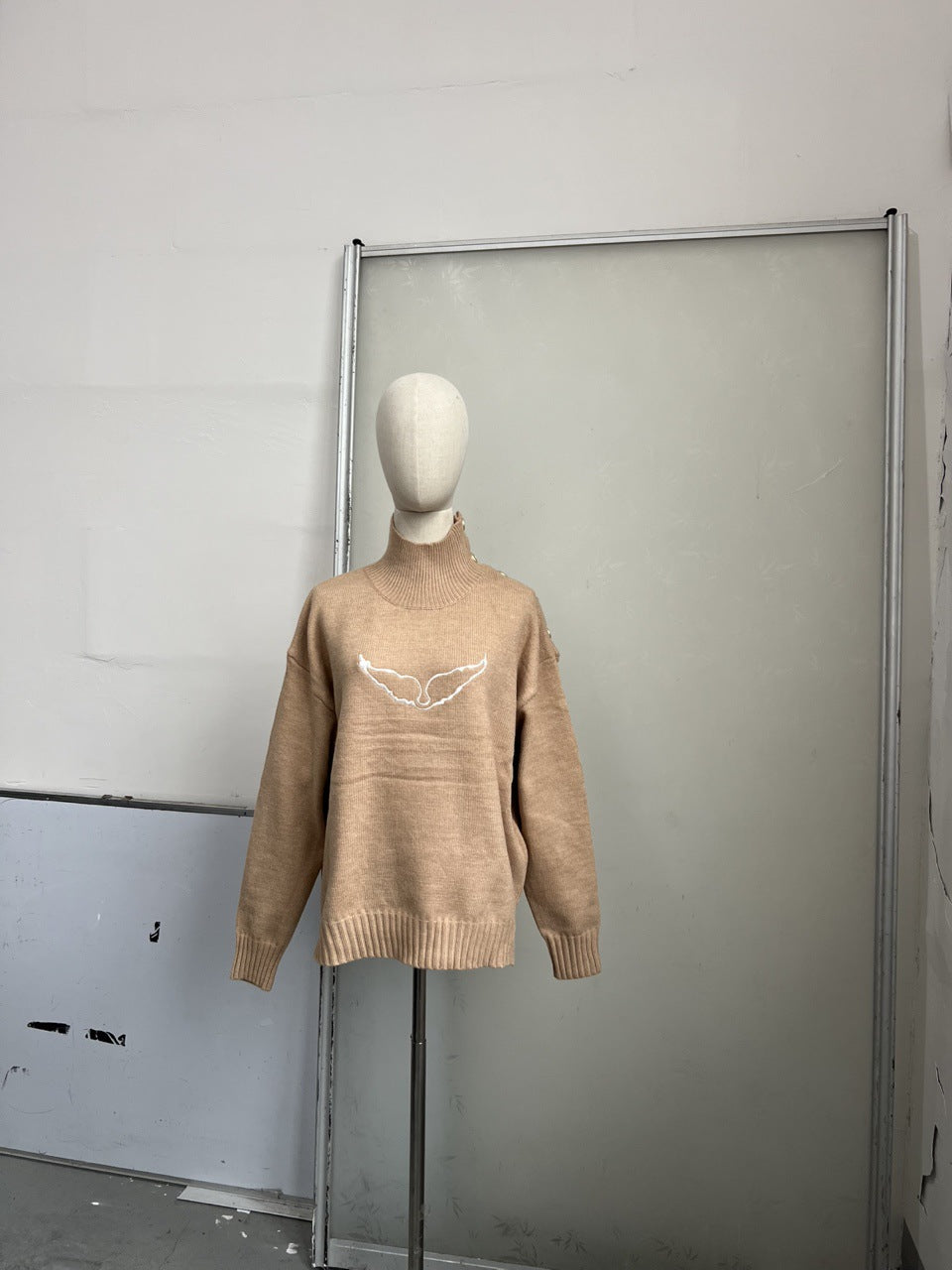 High-Collar Wings Embroidered Shoulder Button Solid Color High Round Collar Sweater 2025 Autumn And Winter New Fashion Real Shoot Girl