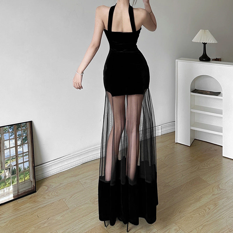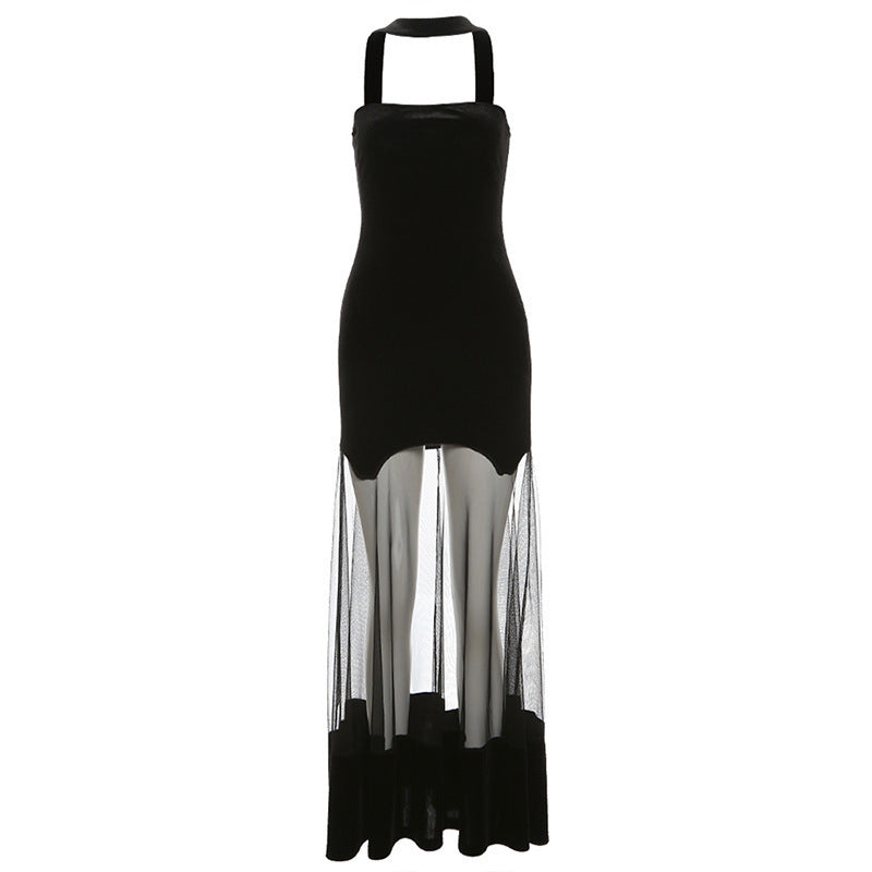 2025 Autumn And Winter New Women's Fashion Sexy Hanging Neck Bare Back Mesh Dress