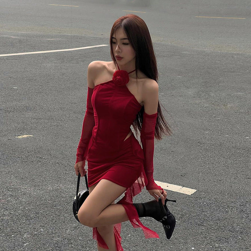 2025 Autumn And Winter New Women's Flowers Hanging Neck Sexy Bare Back Small Vest Temperament Mesh Bag Hip Skirt Suit Woman