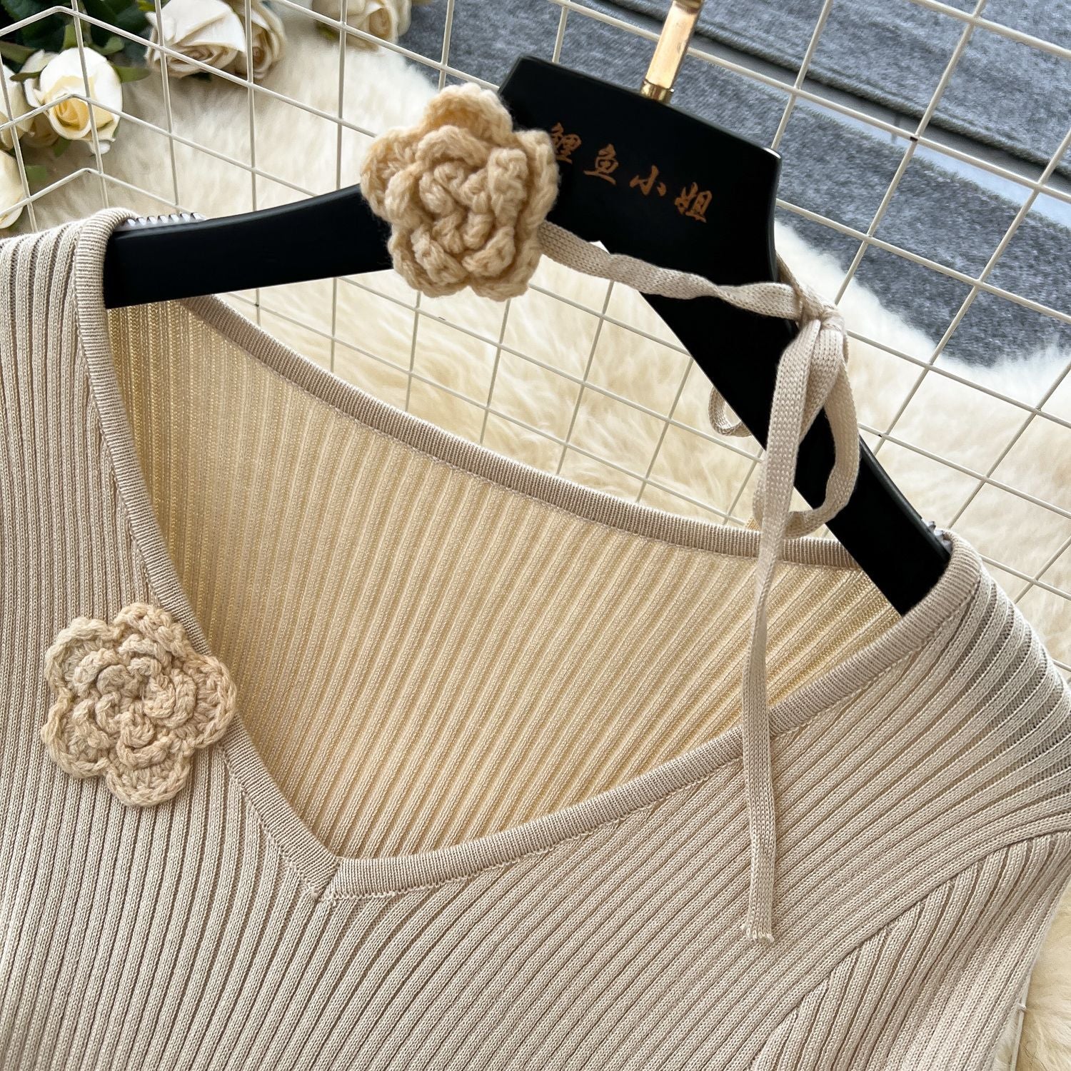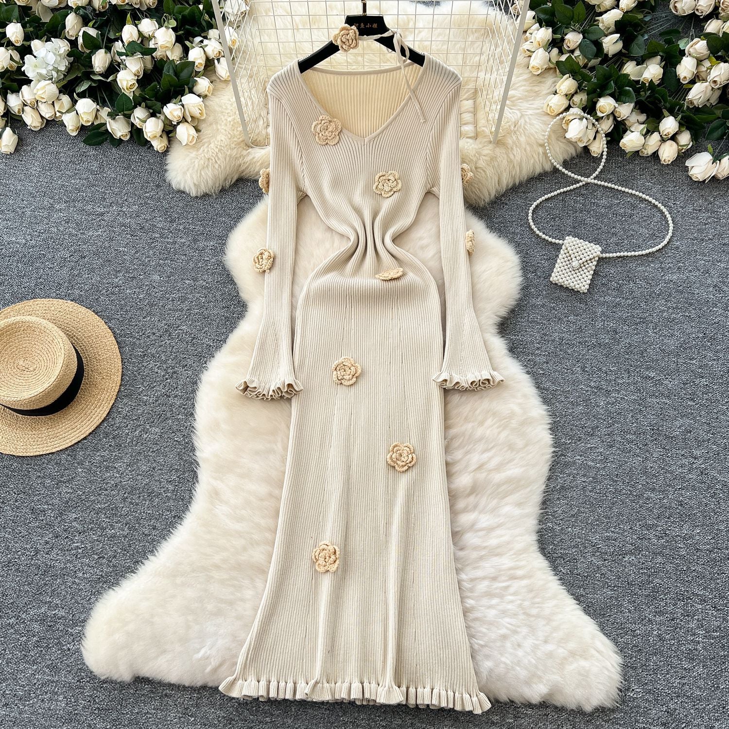 Atmosphere Temperament Three-Dimensional Flowers V-Neck Long-Sleeved Dress Women Slim Thin Inside Sweater Skirt Autumn And Winter New