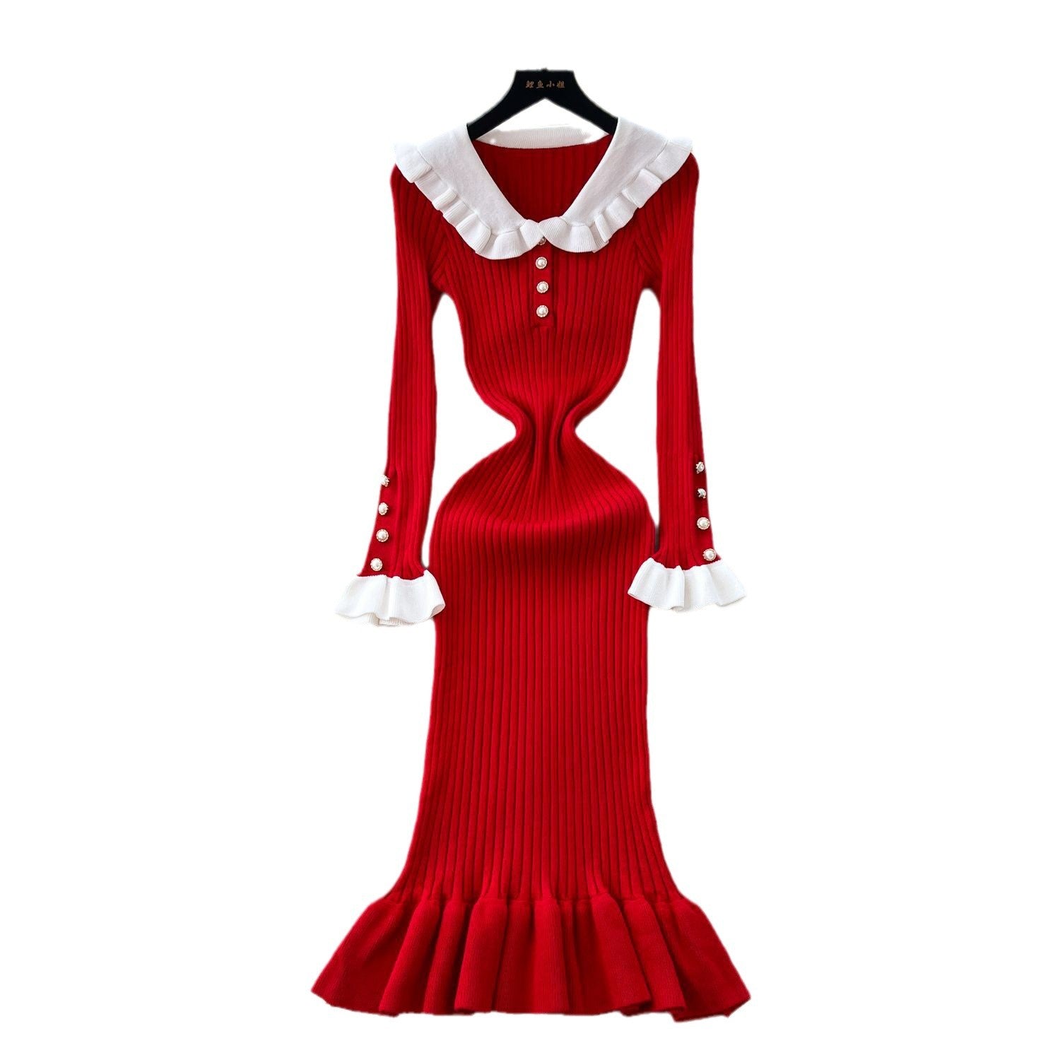 Autumn New Retro Bumpy Dolls To Receive Waist Knitted Dress Female Elastic Temperament Lotus Leafy Dress
