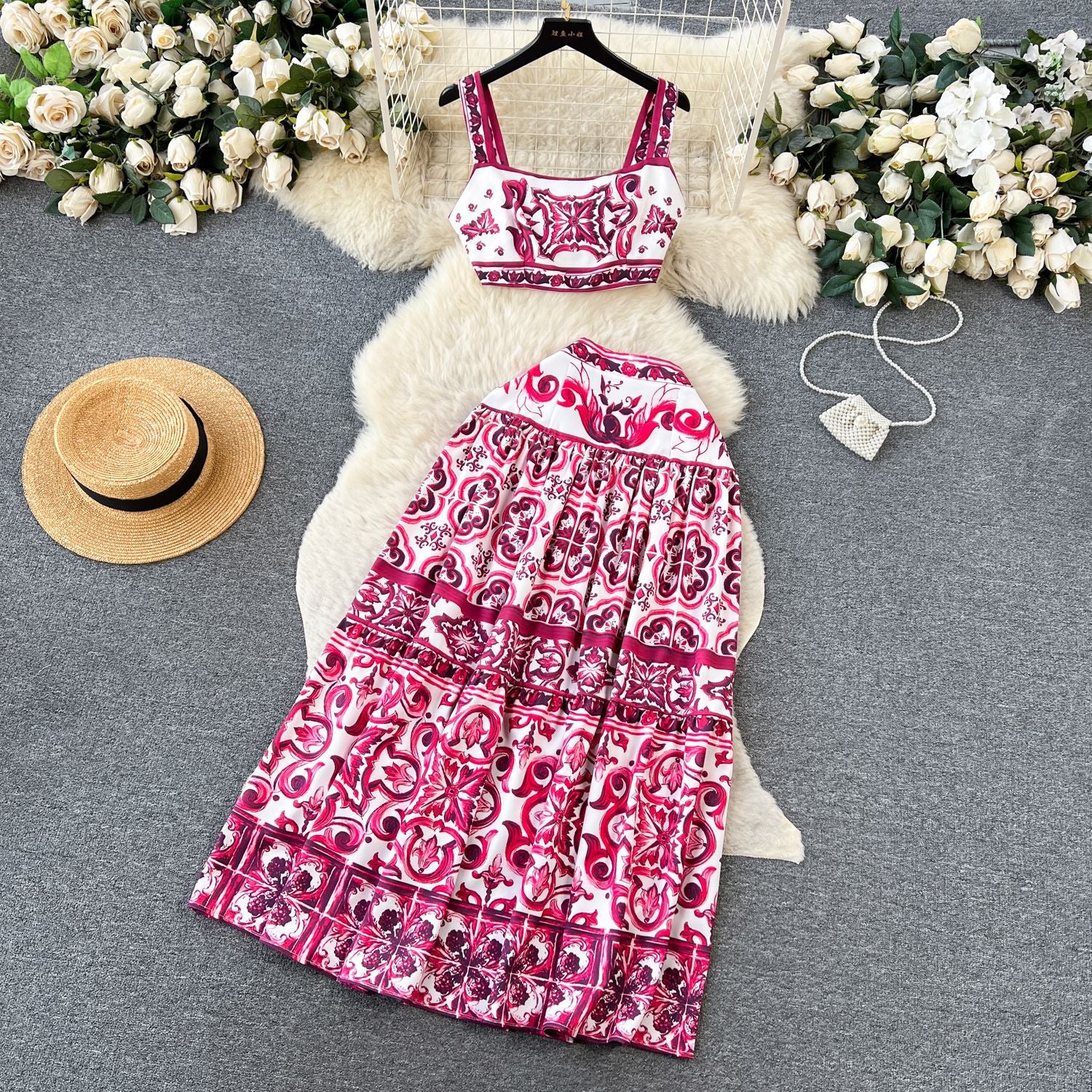 Blue And White Porcelain Printing Set Of Women In Summer Pure Desire To Bare Belt Slings Small Vest + High Waist Mid-Dress Skirt