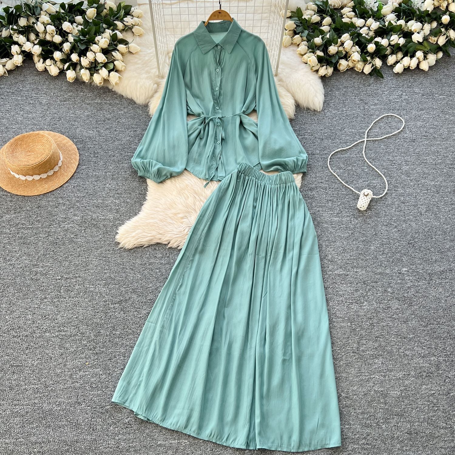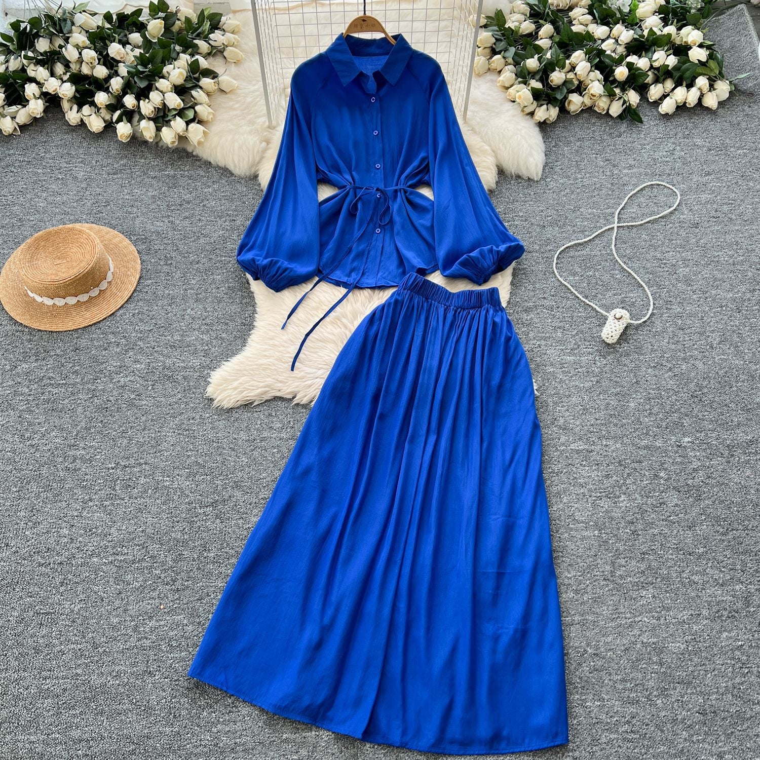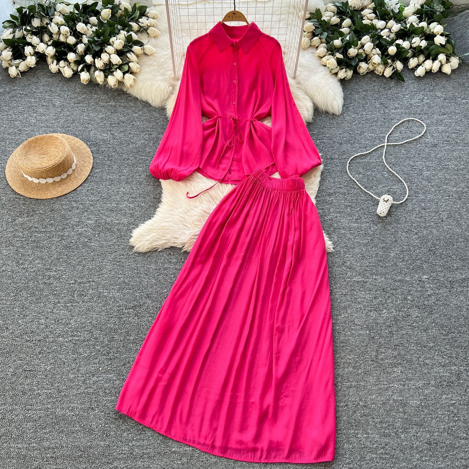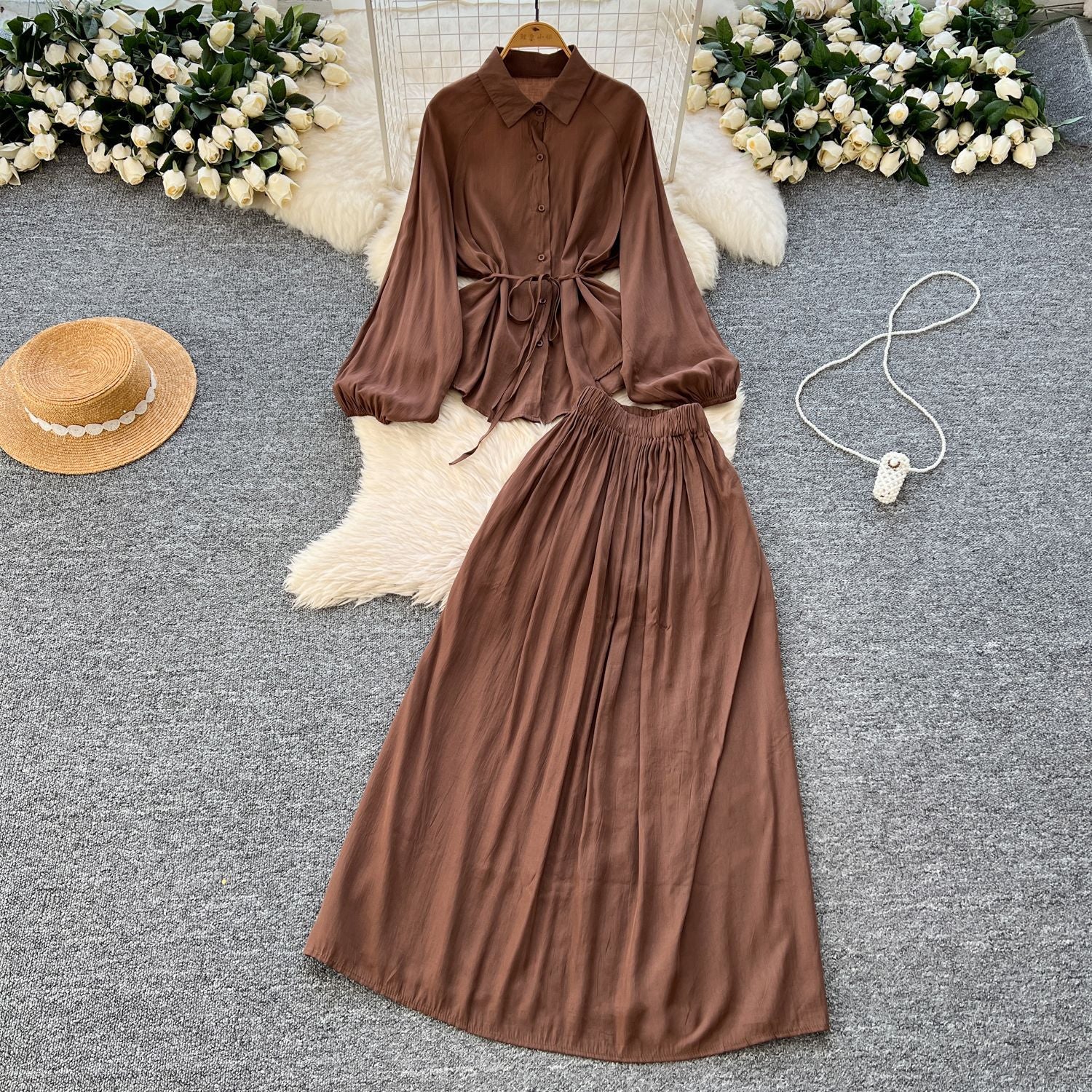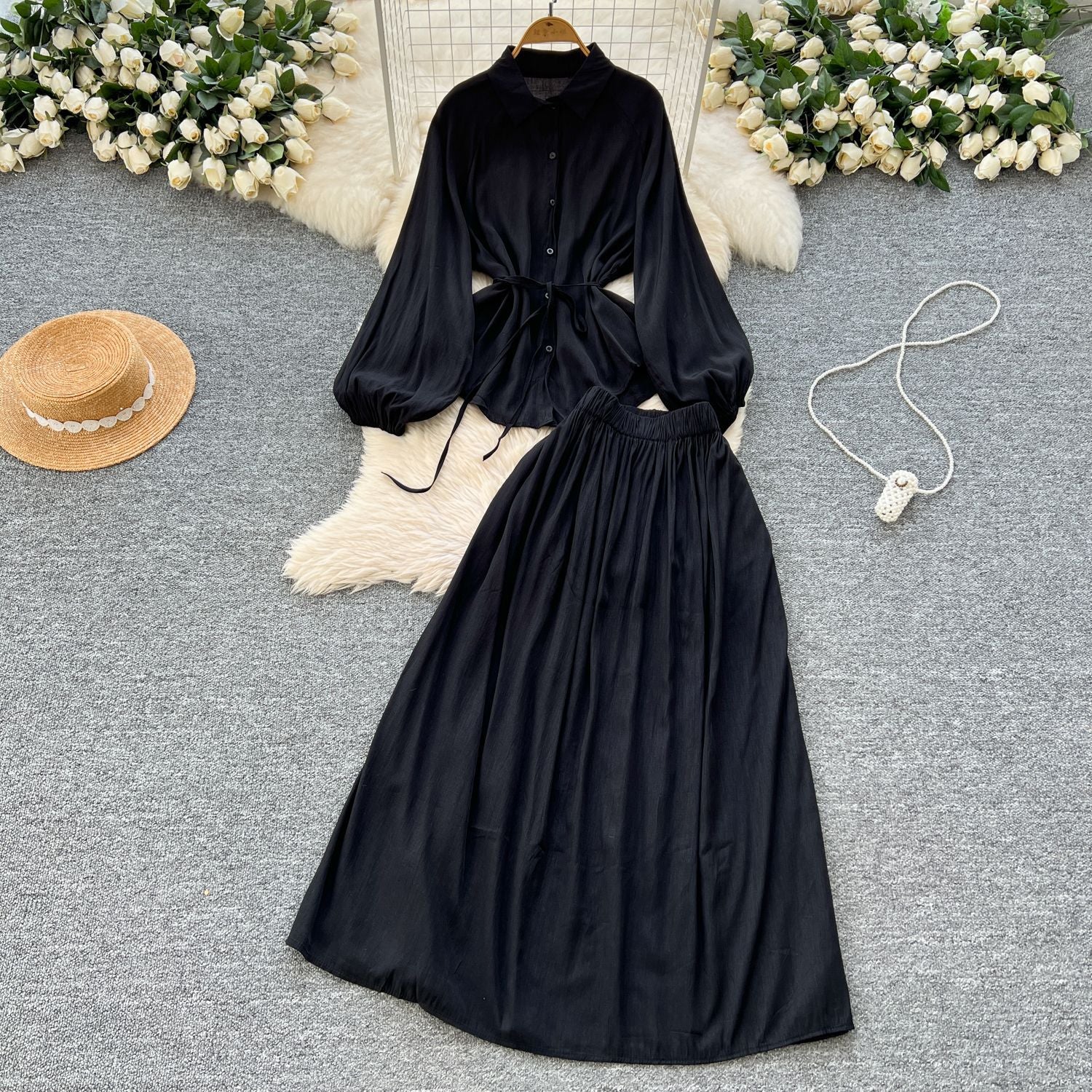 Extremely Simple Style Solid Temperament Suit Women's Spring Bubble Sleeve Strap Shirt + Tight Waist Slim Half Body Long Skirt