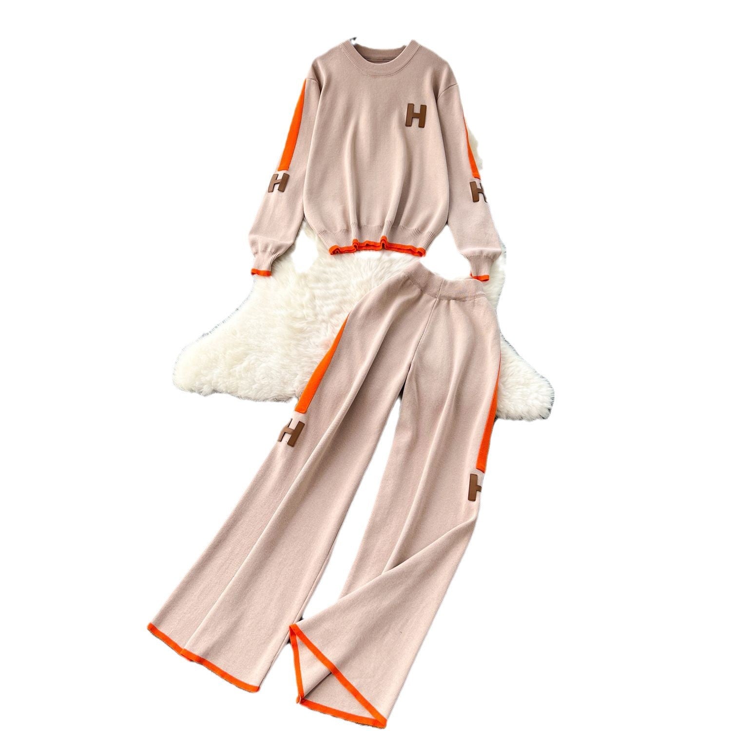 Fashion Letter Embroidered Knitted Shirt Long Sleeve Sweater High Waist Broad Leg Trousers Casual Sports Two-Piece Suit Woman