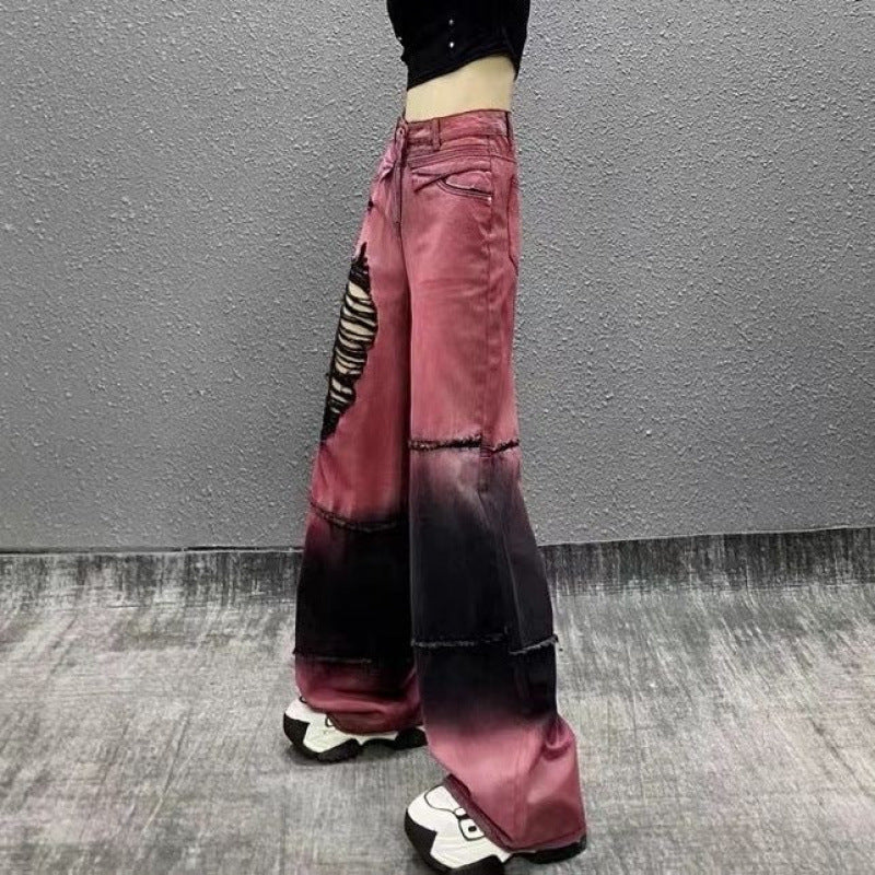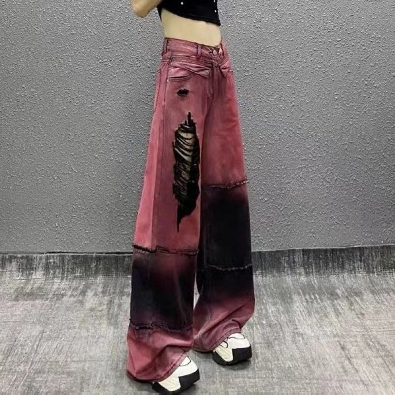 Fat Mm Ocean Color Ripped Jeans Women's Large Size Summer New High-Rise Loose Thin Straight Leg Pants