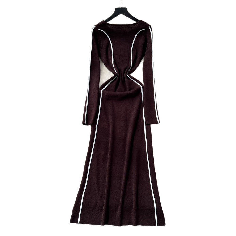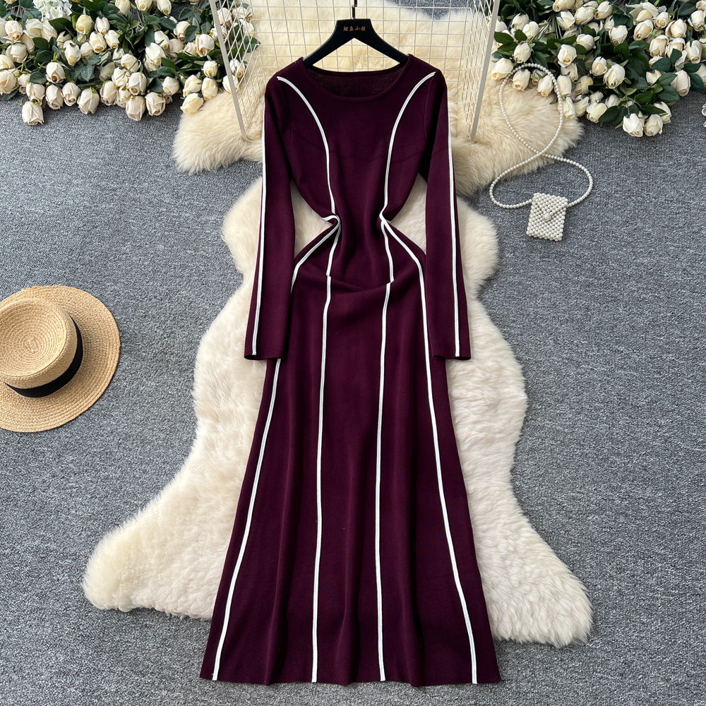 French High-End Sense Niche Fashion Side To Receive Waist Round Collar Long-Sleeved Sweater Dress Female Thin Dress