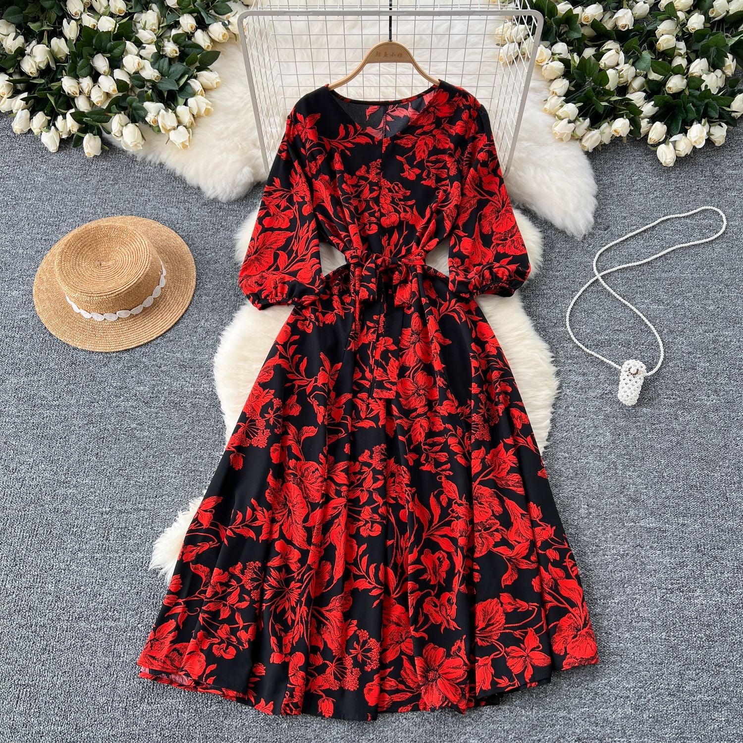 French Retro Fashion Print Dress Women Loose Strap To The Waist Thin A Word Big Pendulum Long Skirt