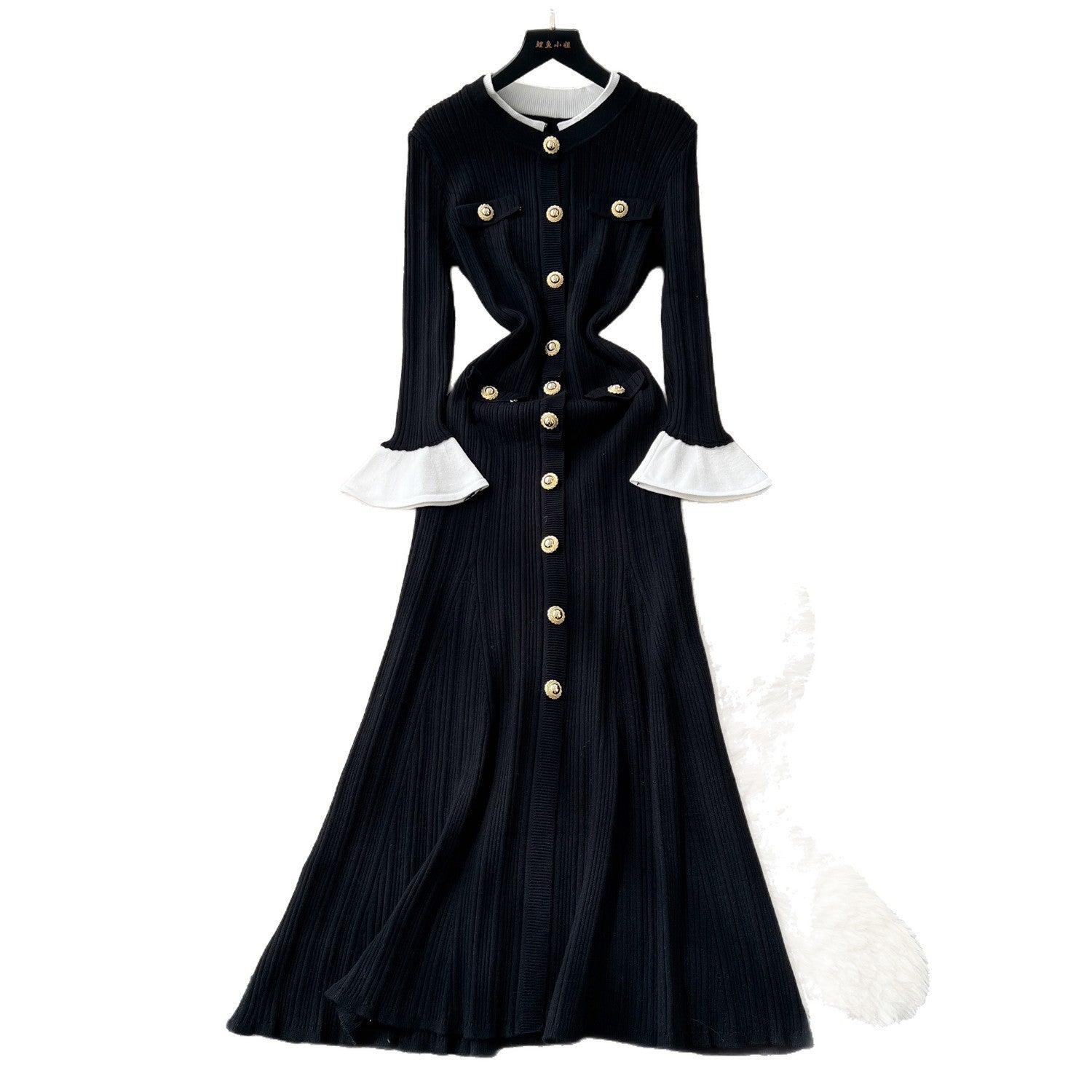French Small Fragrant Wind Bumpy Round Collar Horn Sleeve Single Buckle Waist Knitted Dress Women Autumn Body Sweater Dress