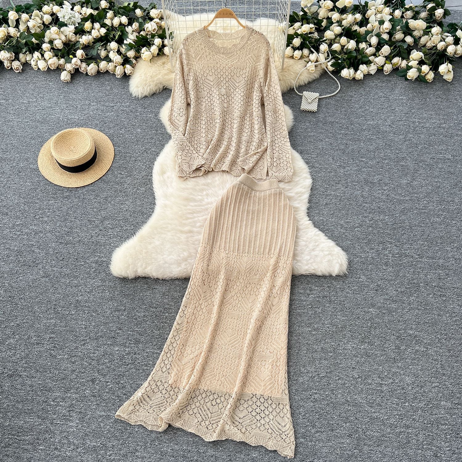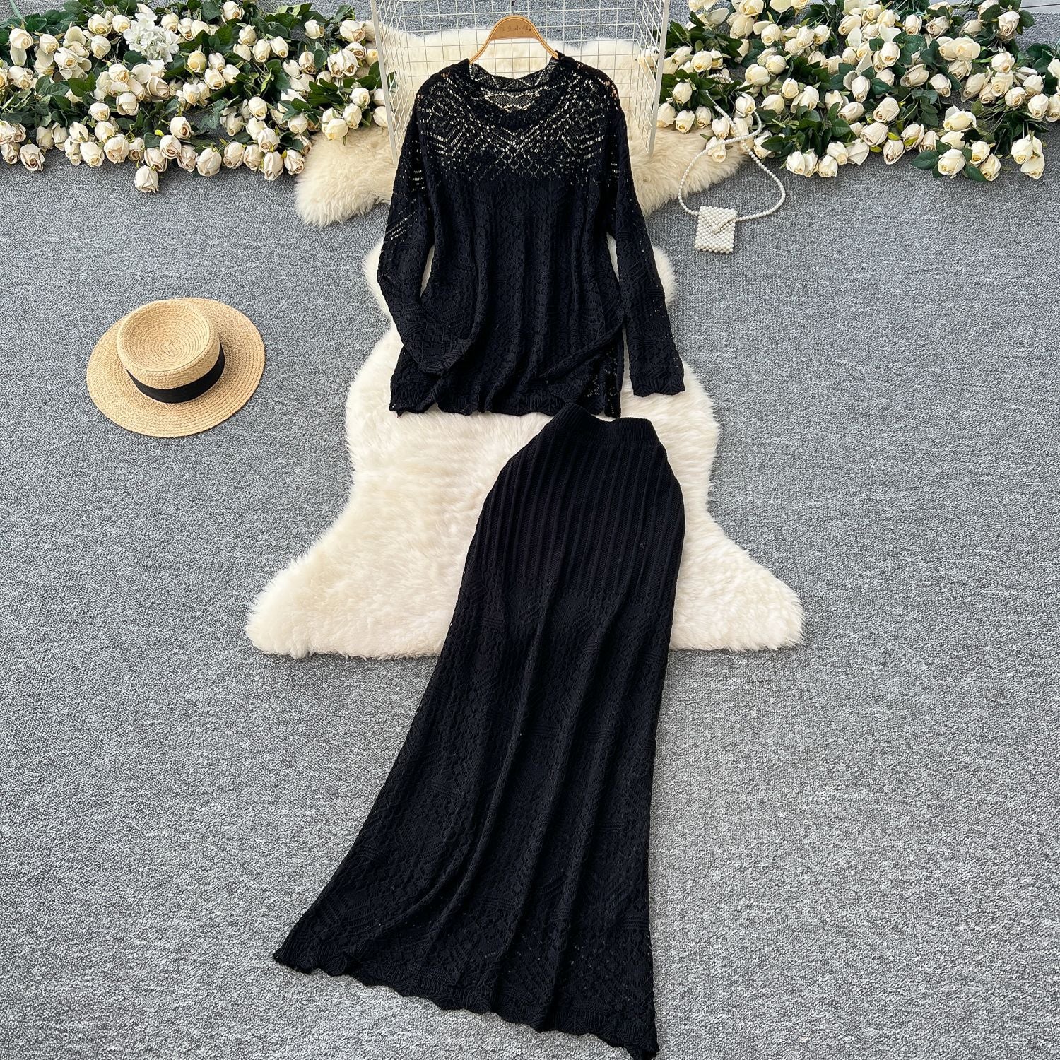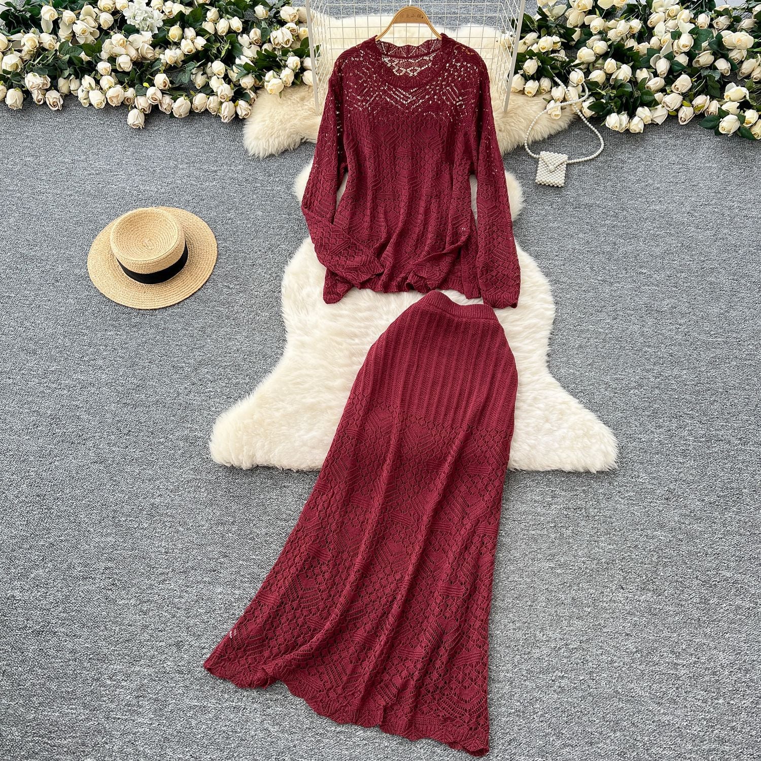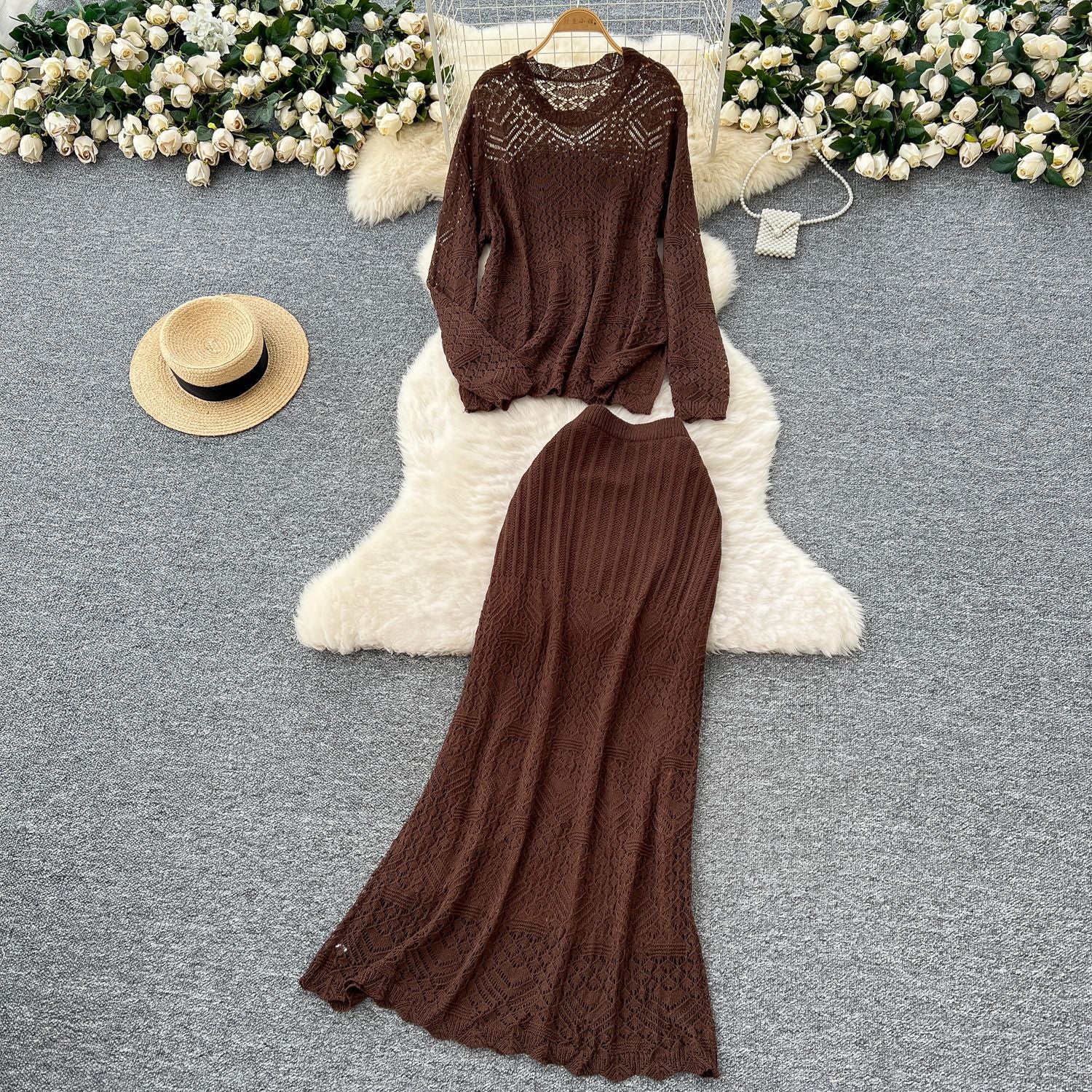 Gentle Wind High-End Sleek Crochet Knitting Set Of Women's Round Collar Long Sleeve Blouse High-Waisted Hip Skirt