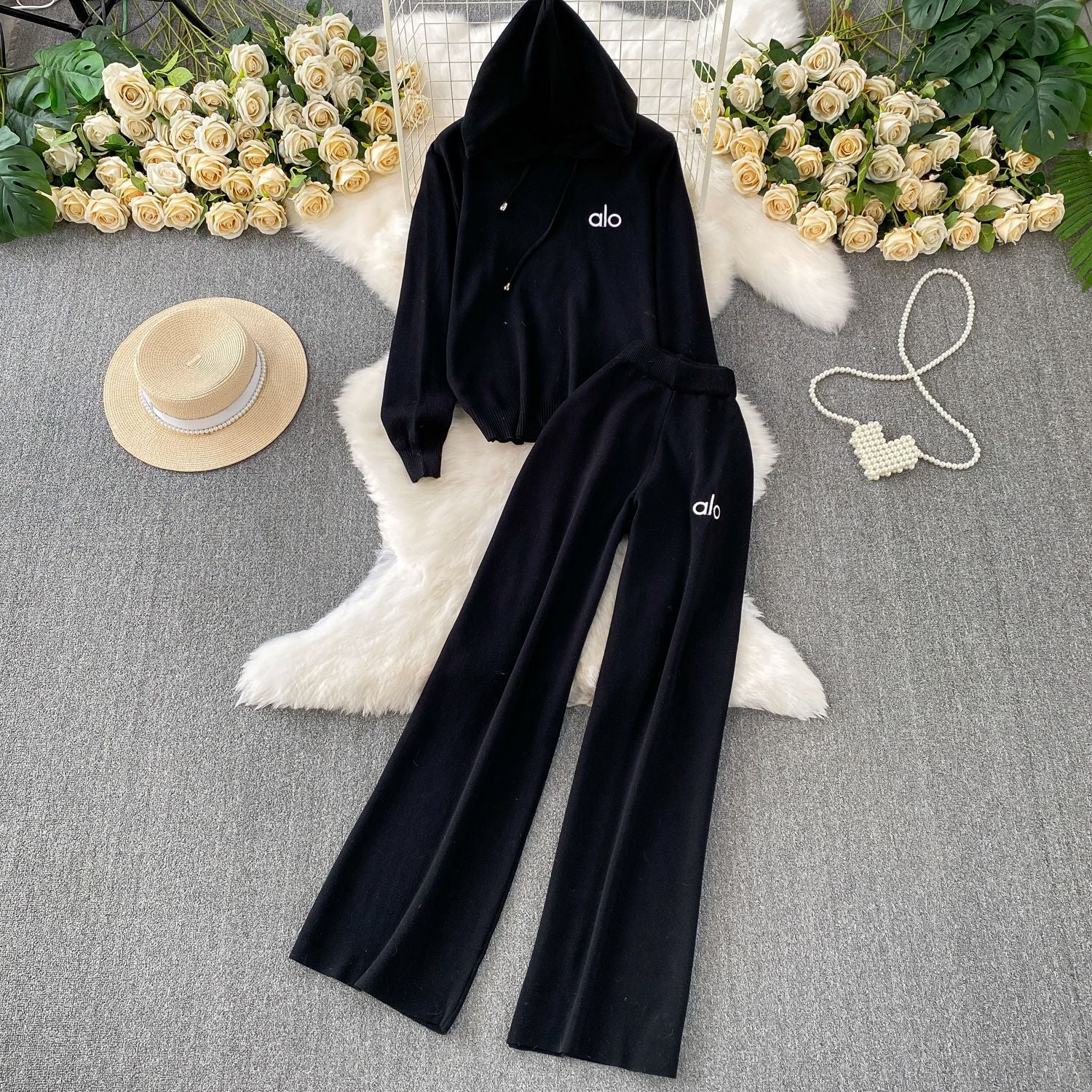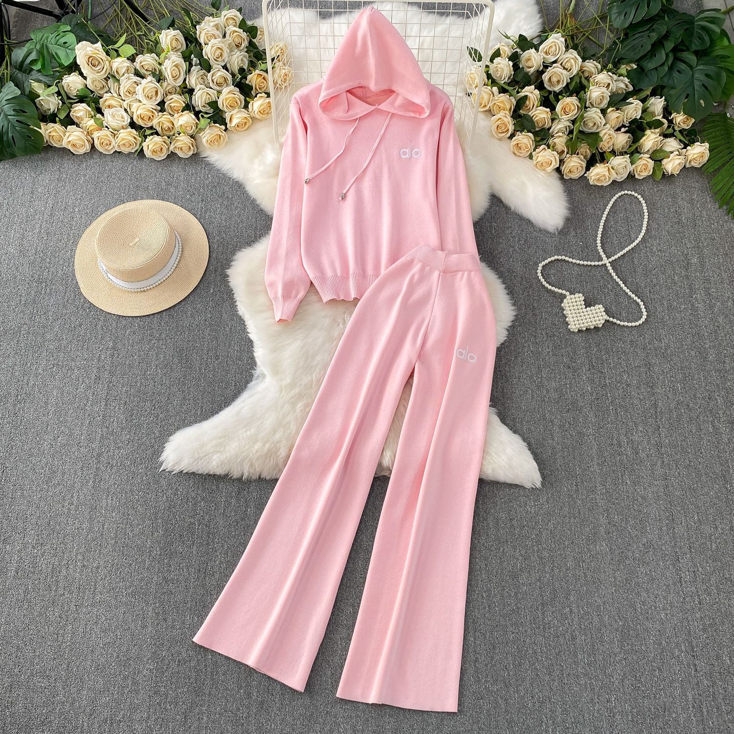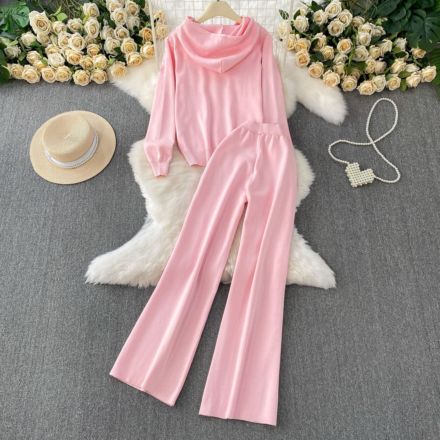 Gentle Wind Pink Tie With Thin Hooded Knitted Long-Sleeved Sweater High-Rise Broad Leggings Embroidery Set
