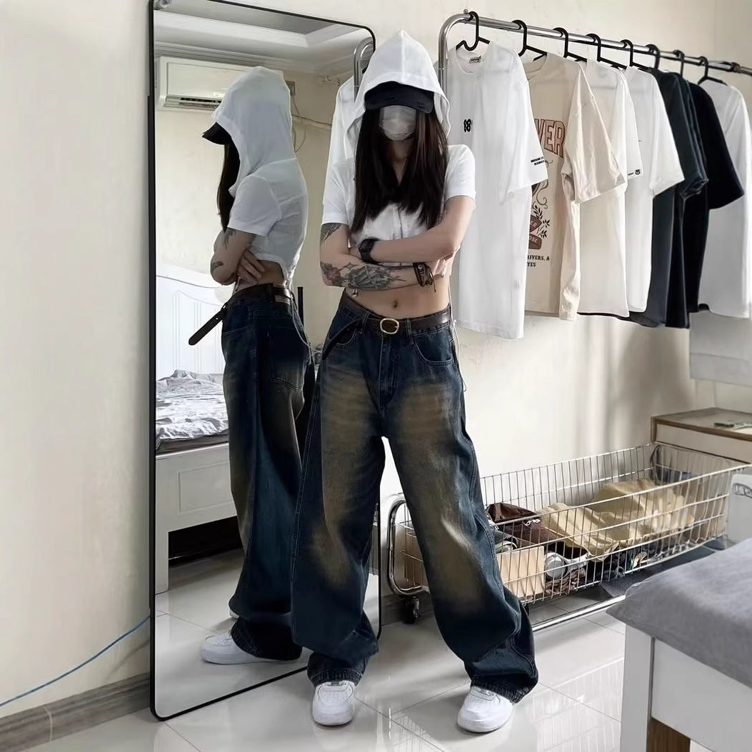 High Street Vintage Blue Straight Jeans Men And Women Loose-Hanging Feel To Do Old Fashion Broad-Legged Drag Pants Tide