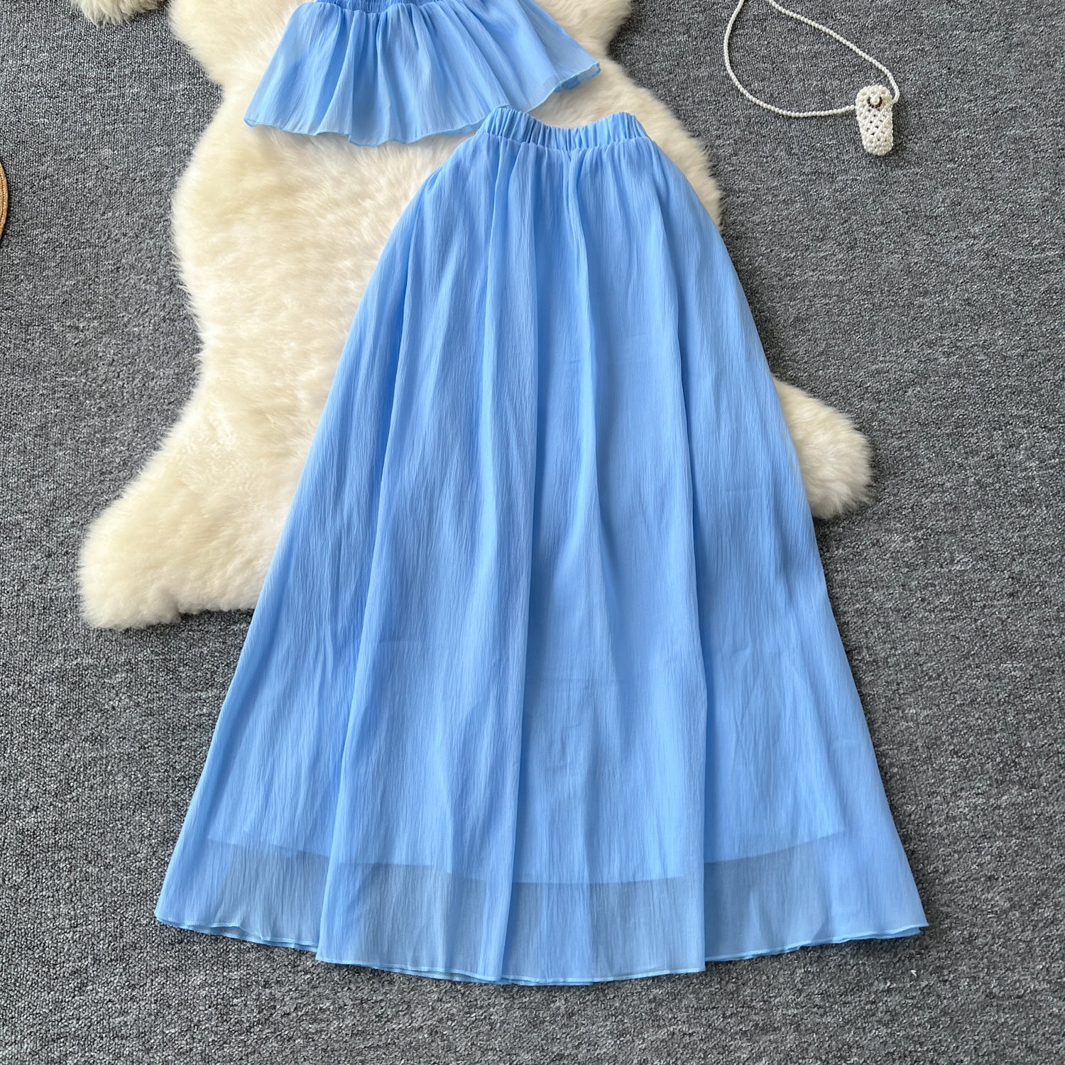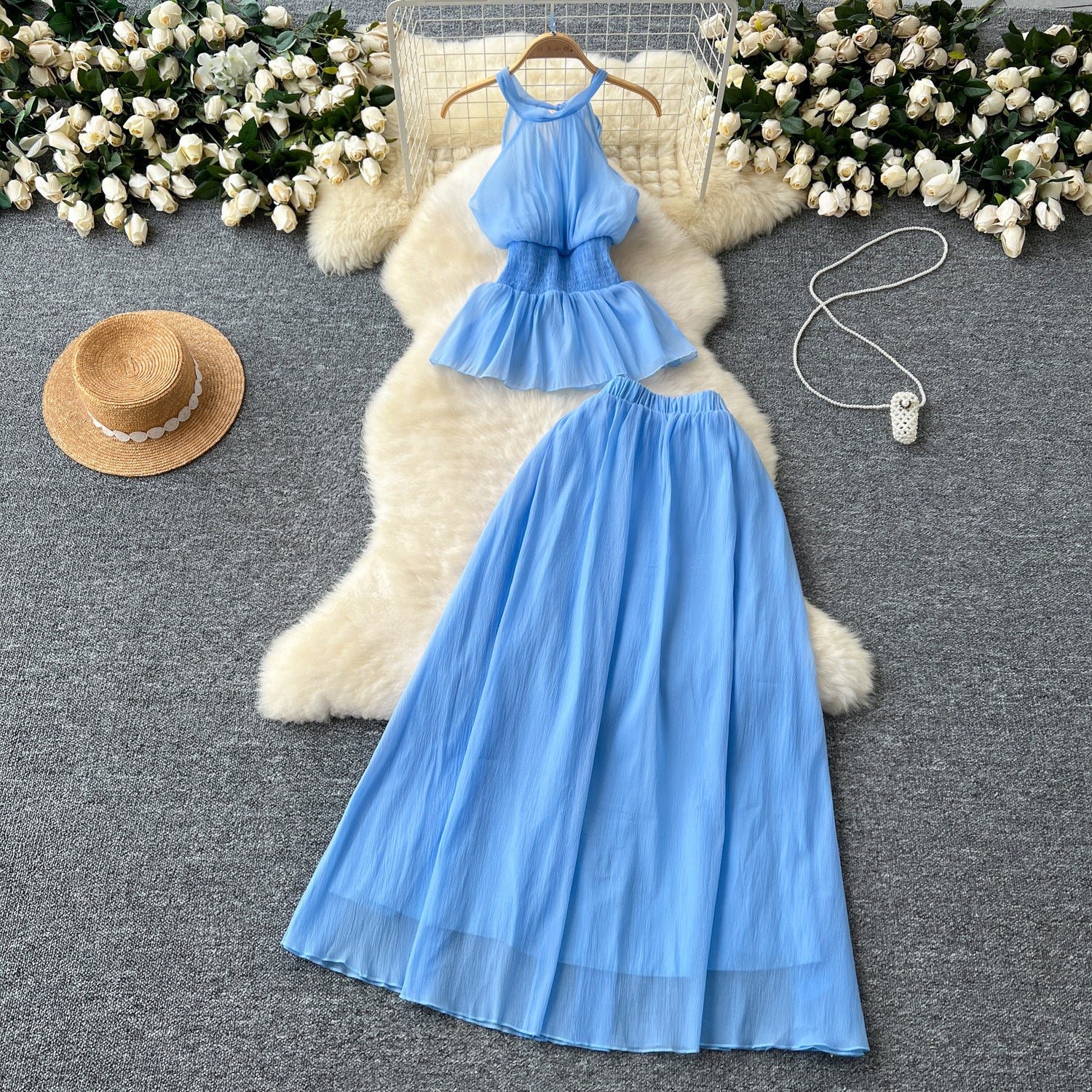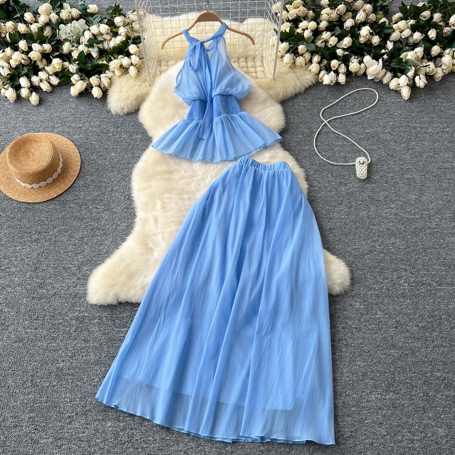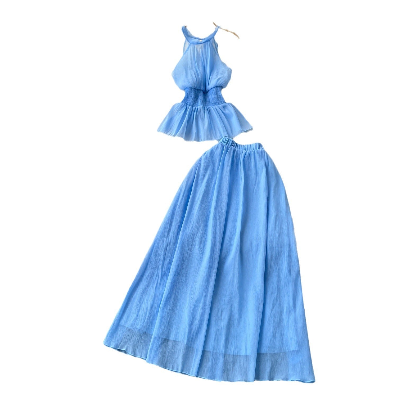 Holiday Style Suit Women's Summer French Waistless Sleeveless Hanging Neck Top High Waist Thin Half Skirt Two-Set