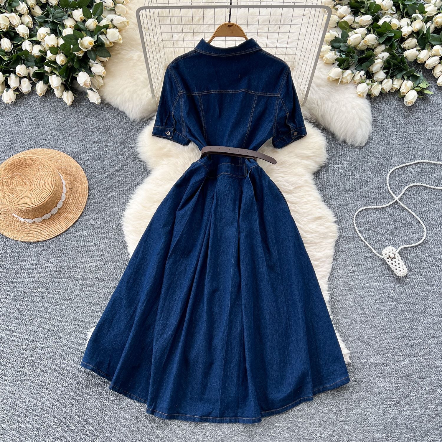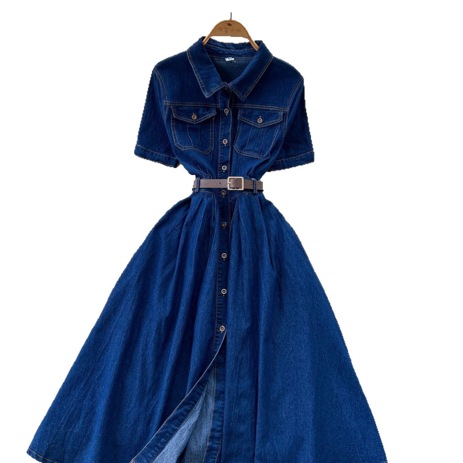 Korean Version Of Fashion Casual Denim Dress Women Retro Collar Short Sleeve Single Buckle Waist Swing Shirt Long Skirt