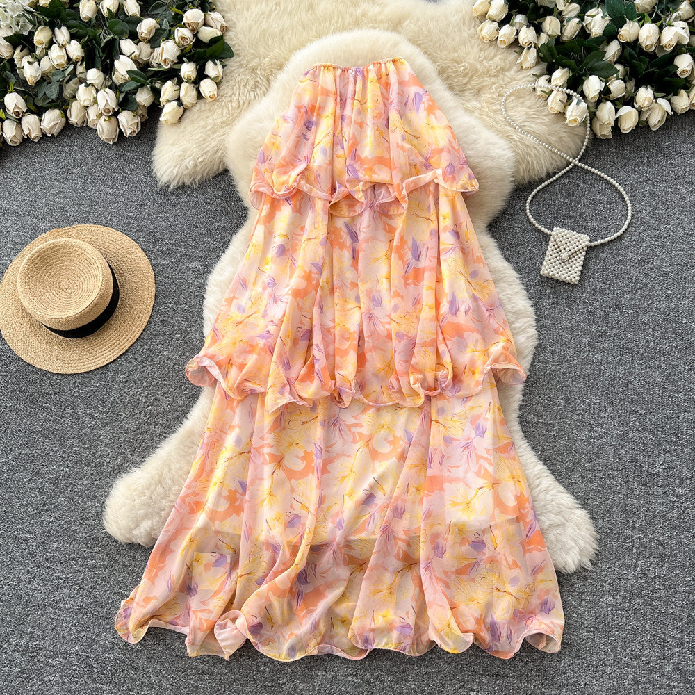 2025 Summer Dress New Niche Light Familiar Wind V To Receive Waist Thin Temperament French Pressure Folding Printing Chiffon Dress