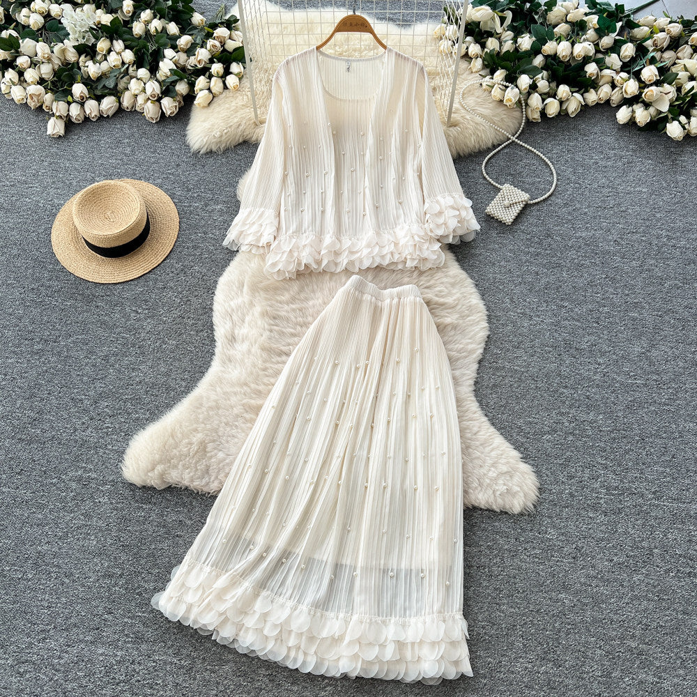 Design Sense Of The Color Short Sleeve Knitted Cardigan Top + High Waist Long Skirt Summer Wearing Two Sets