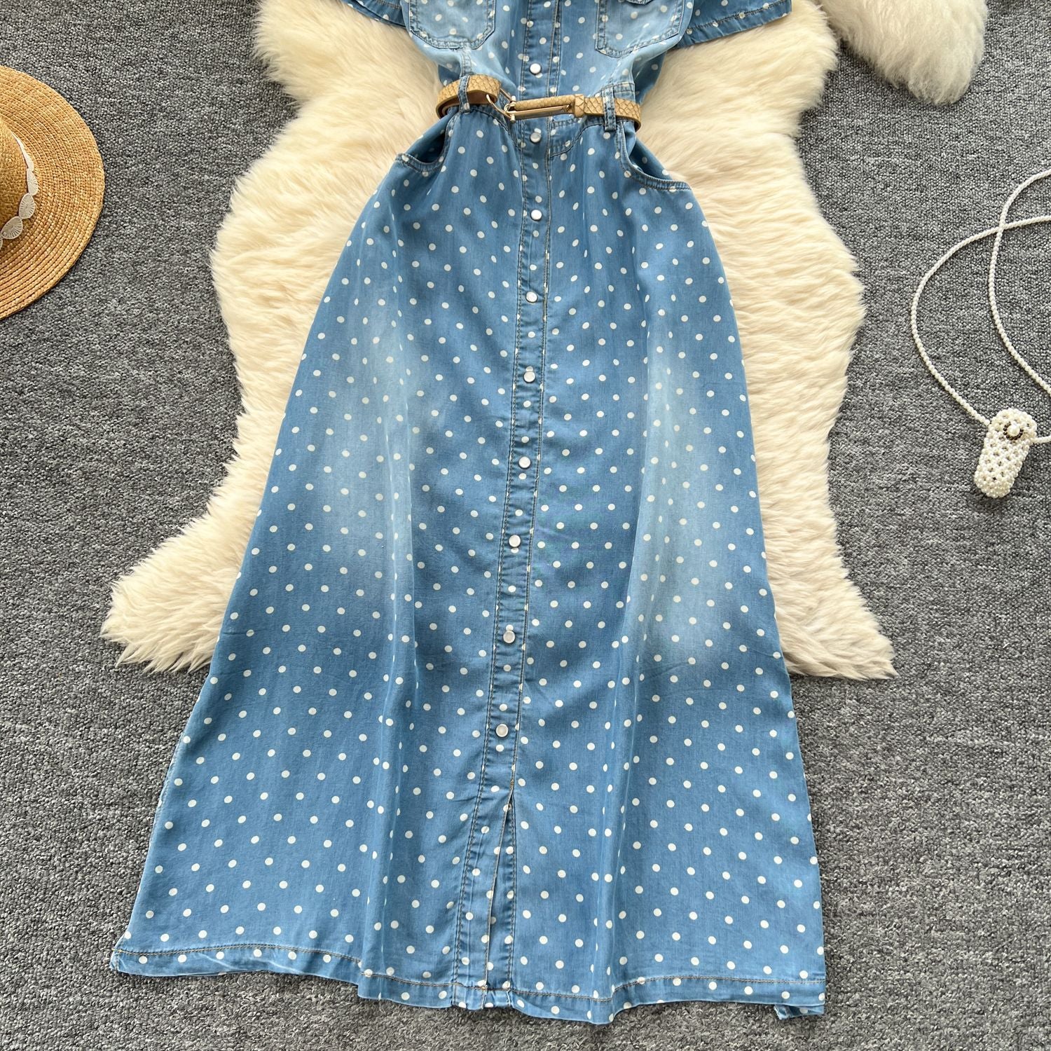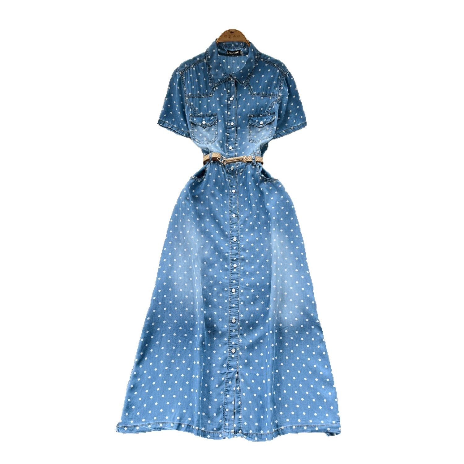 Light Familiar Style Niche Fashion Short-Sleeved Wave Dot Denim Dress Women's Waist Thin Temperament Elegant A-Word Shirt Skirt
