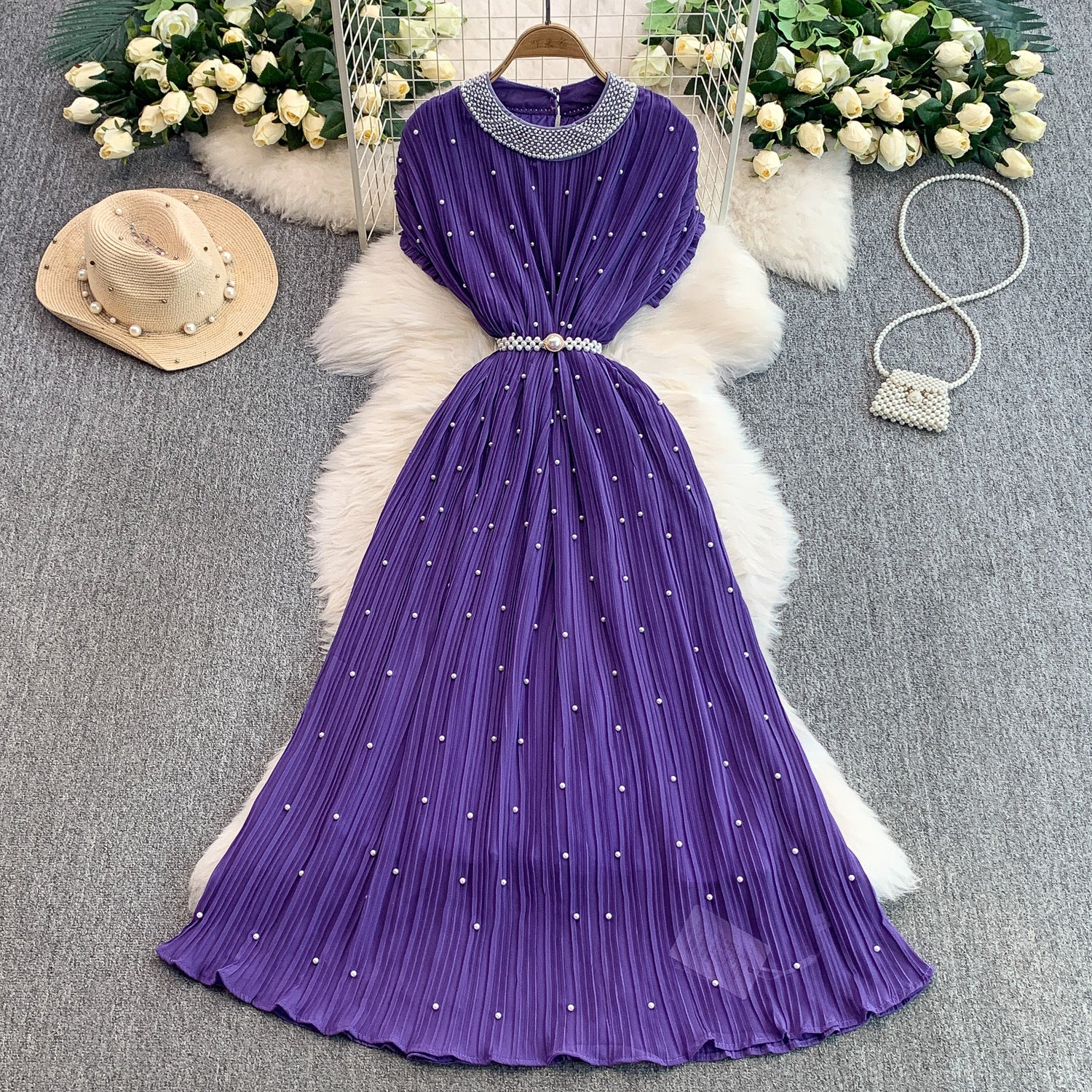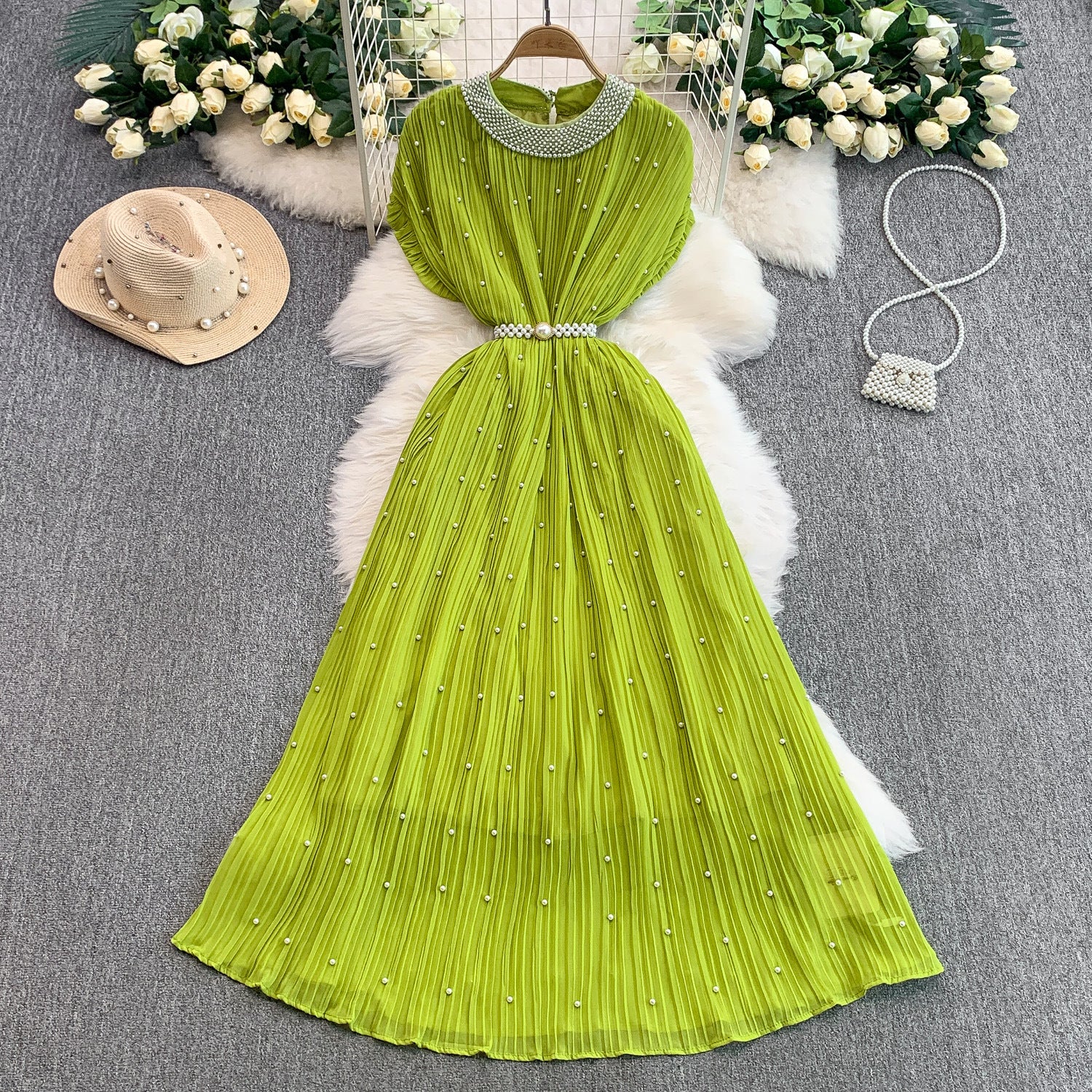 Light Luxury Famous Heavy Industry Nail Ball Collar Dress Women Summer Waist Thin 100 Fold Elegant Dress Dress Dress