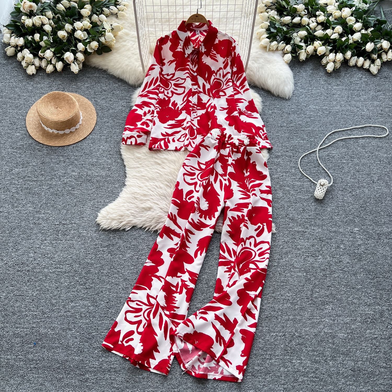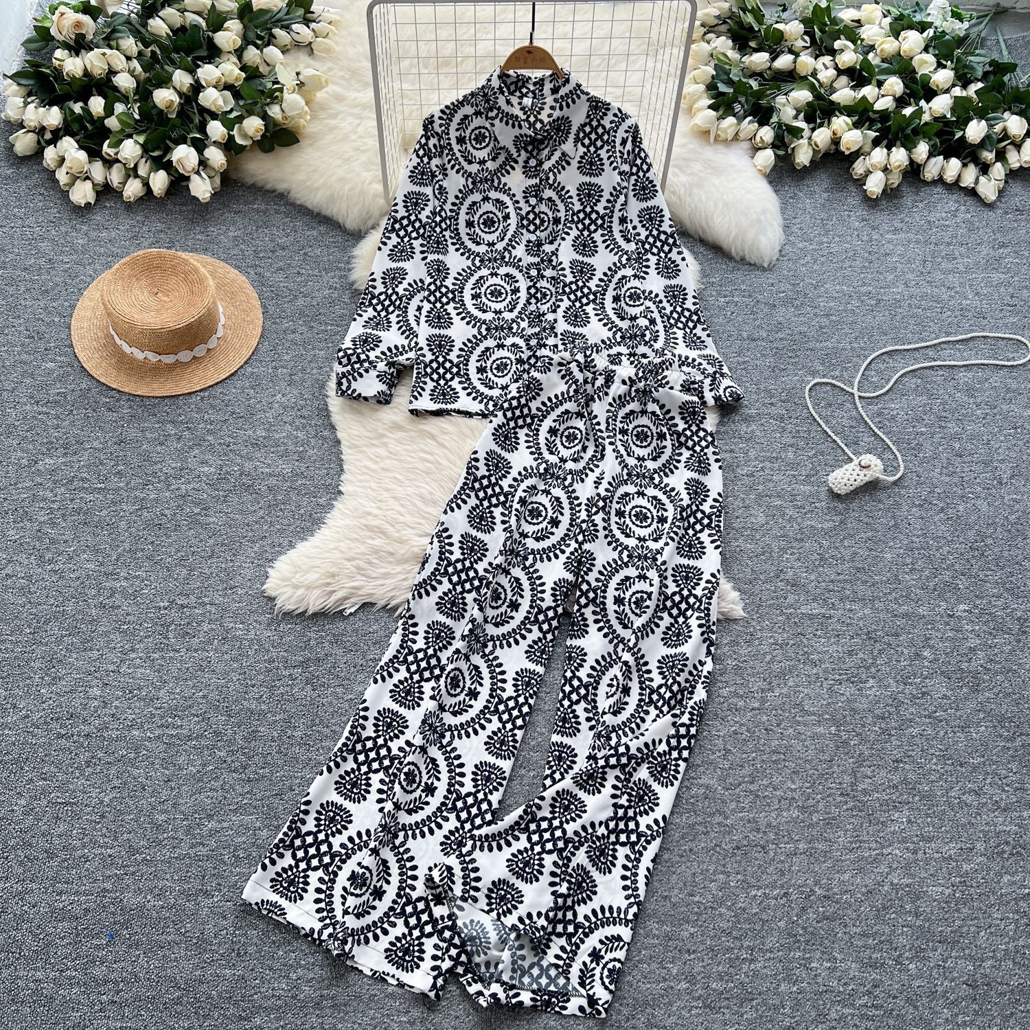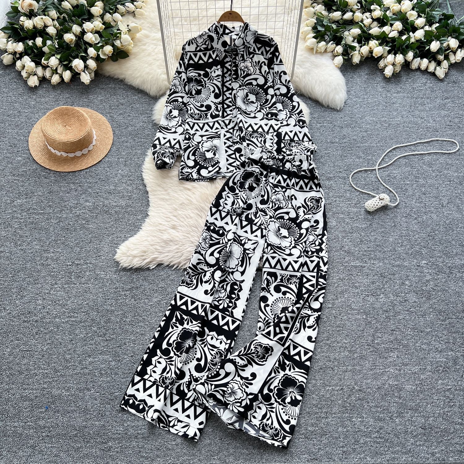 Lightly Familiar Wind Wearing A Female Fashionable Loose-Fitting Long-Sleeved Printed Shirt + High-Waisted Casual Broad-Legged Trousers Set