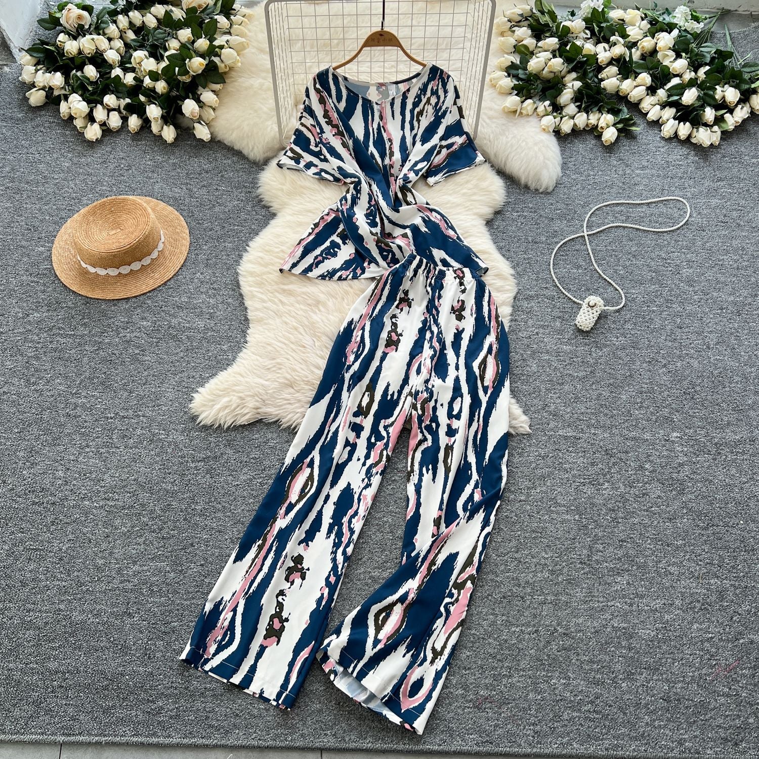 Lightly Mature Two Sets Of Women's Summer Dress Design Cross-Round Neckline Short-Sleeved Print Top High-Waisted Casual Broad-Legged Trousers