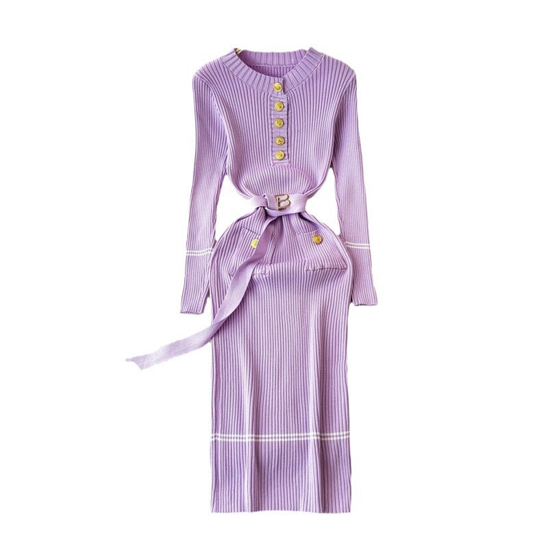 Small Fragrant High-End Autumn And Winter Round Collar With Thick Knitted Dress With Belts And Hips Skirt Sweater