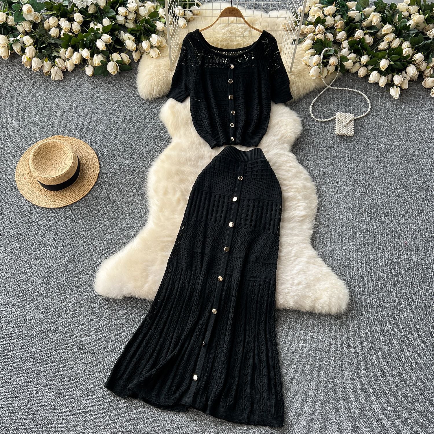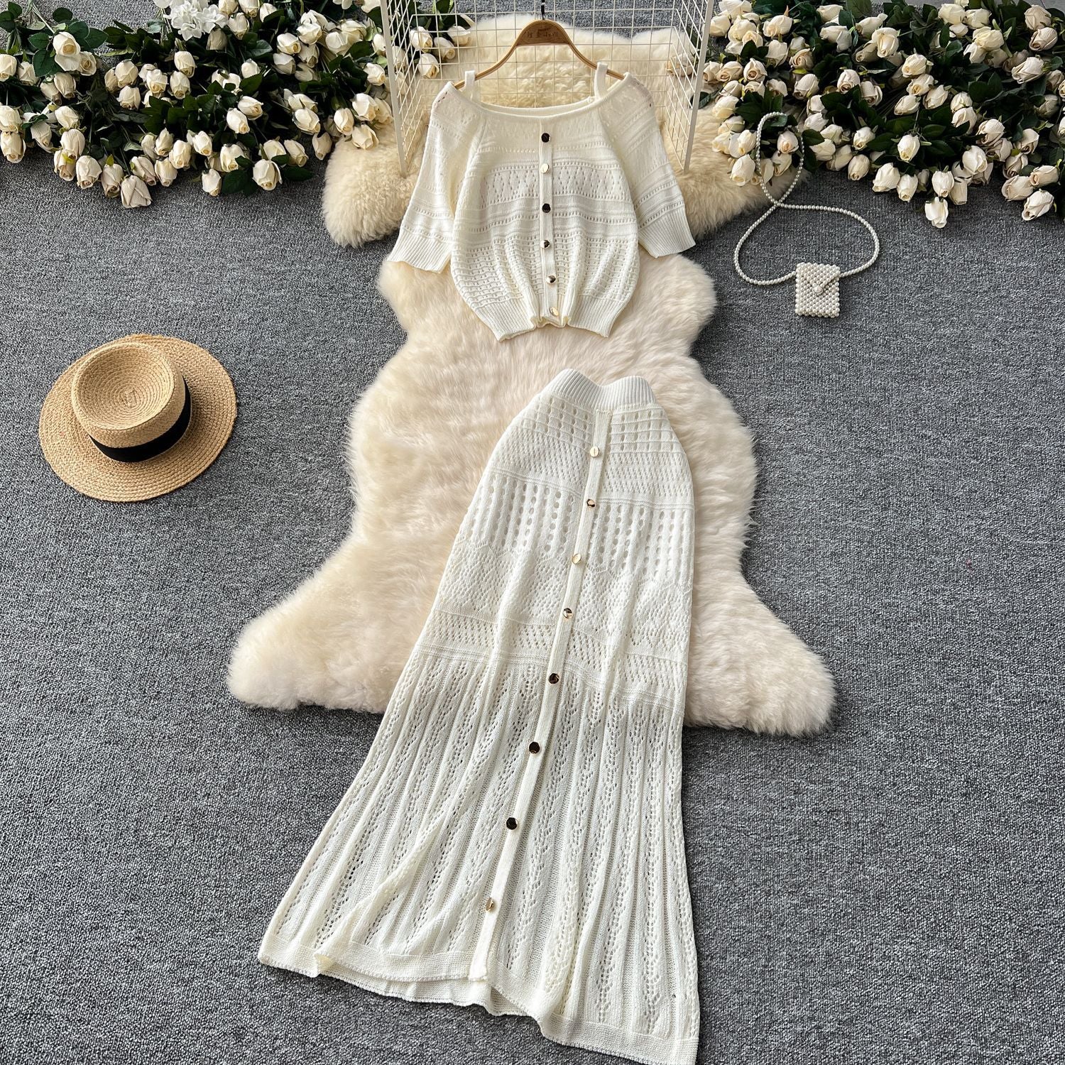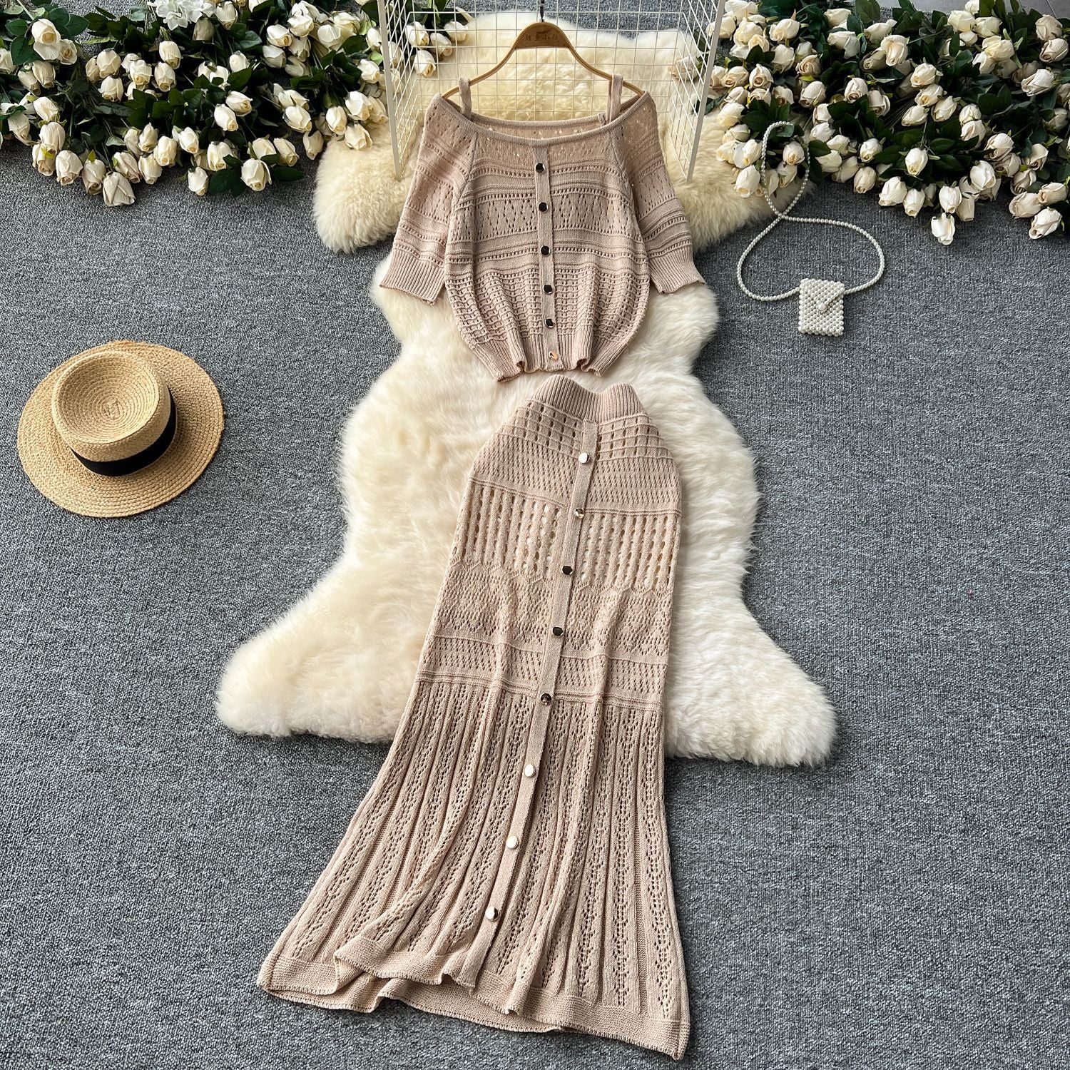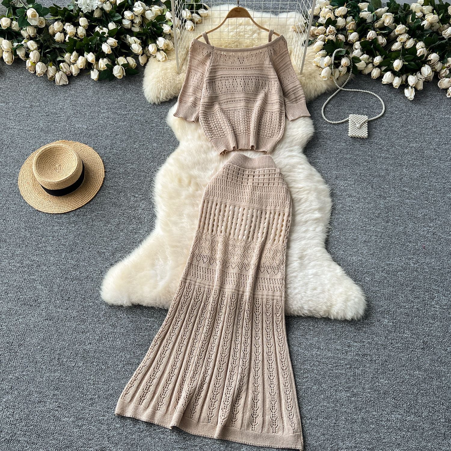 Small-Scale Vintage Hollow Crocheted Shoulder Sling Knitted Shirt Two Sets Of Women's Half-Dress