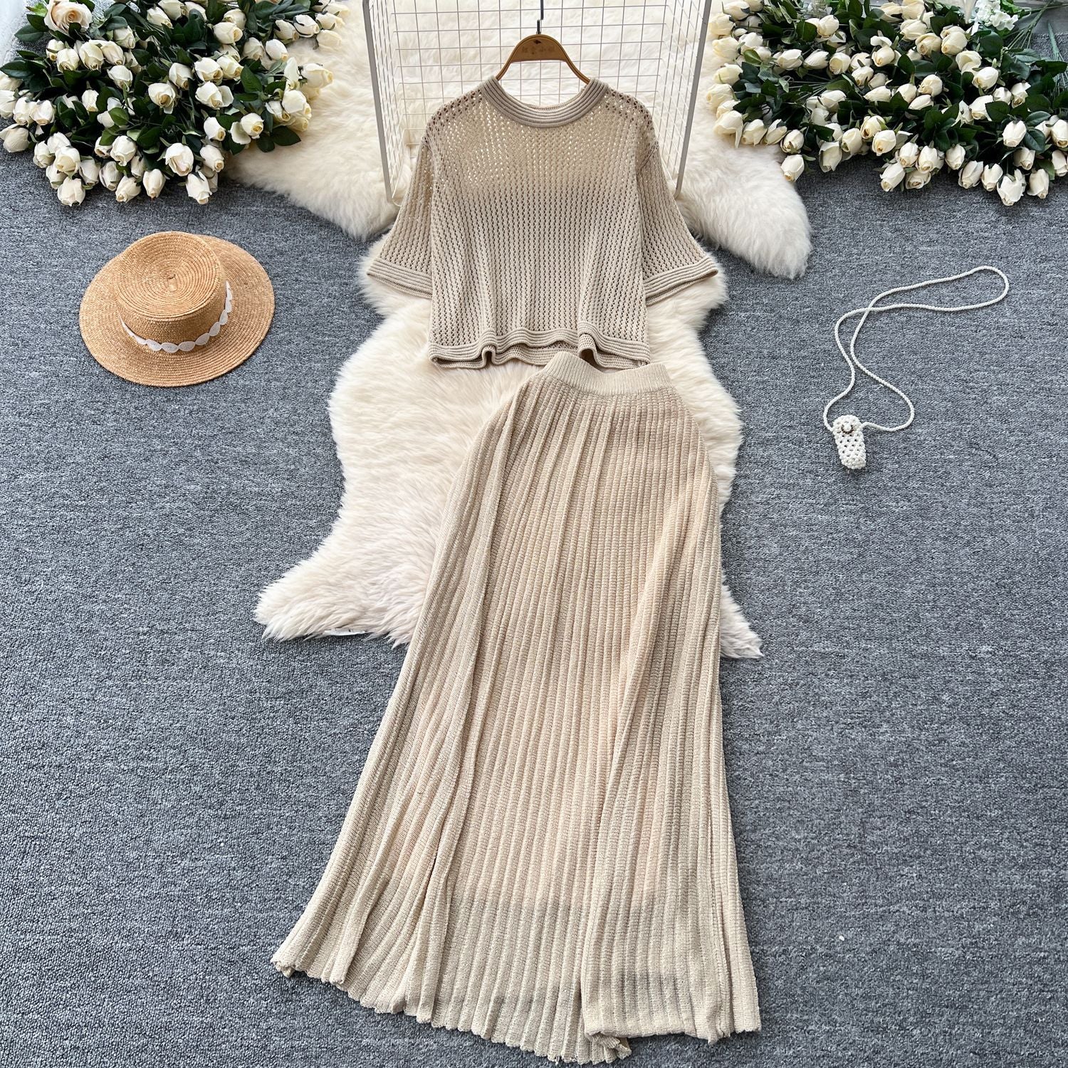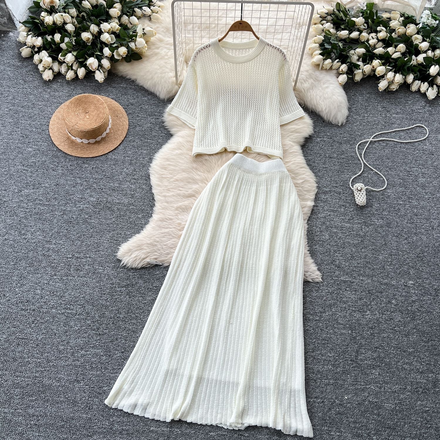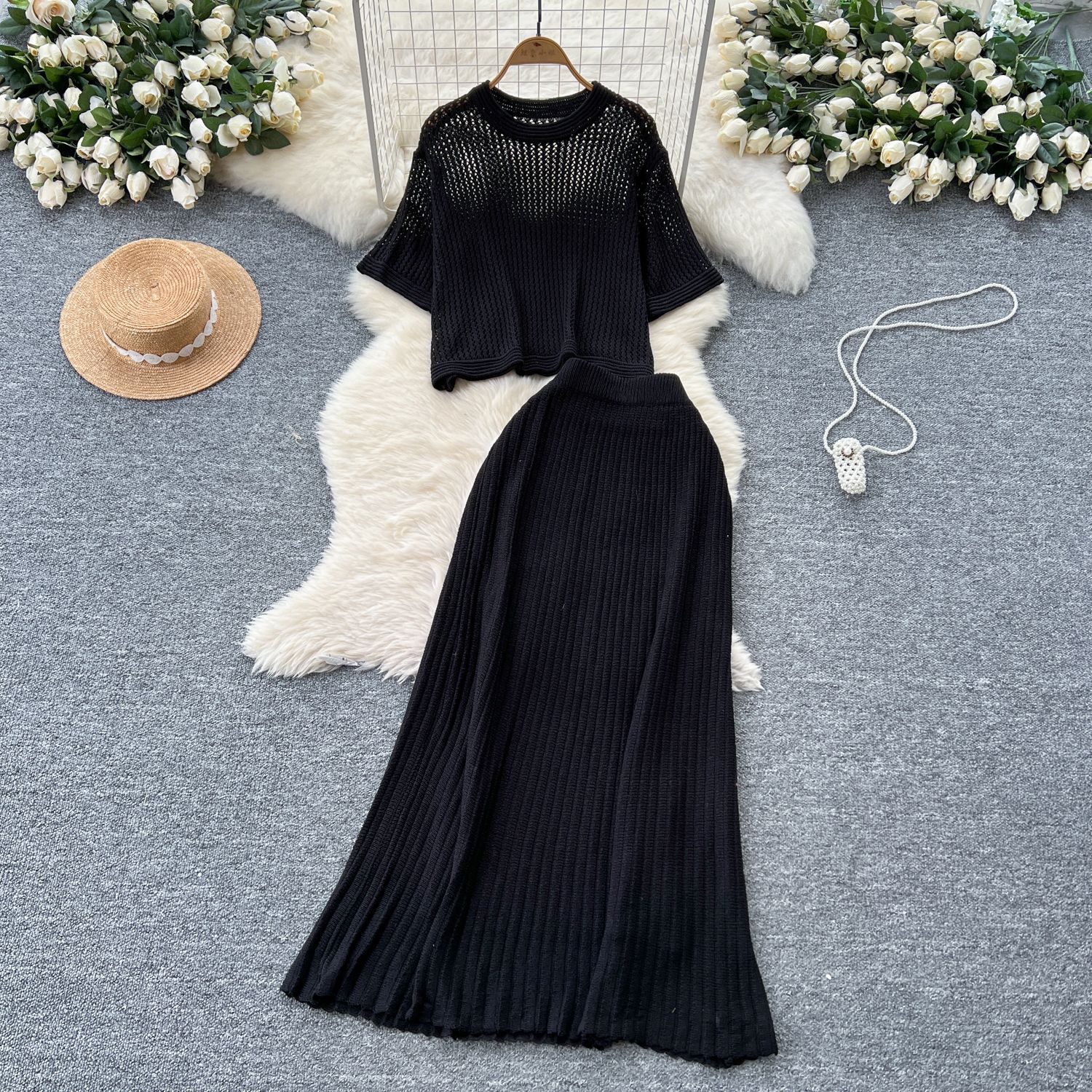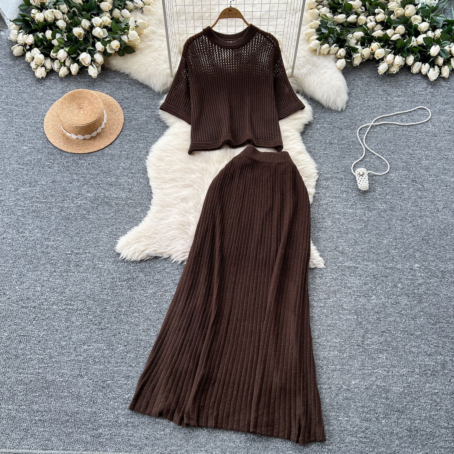 Design Sense Of The Color Short Sleeve Knitted Cardigan Top + High Waist Long Skirt Summer Wearing Two Sets