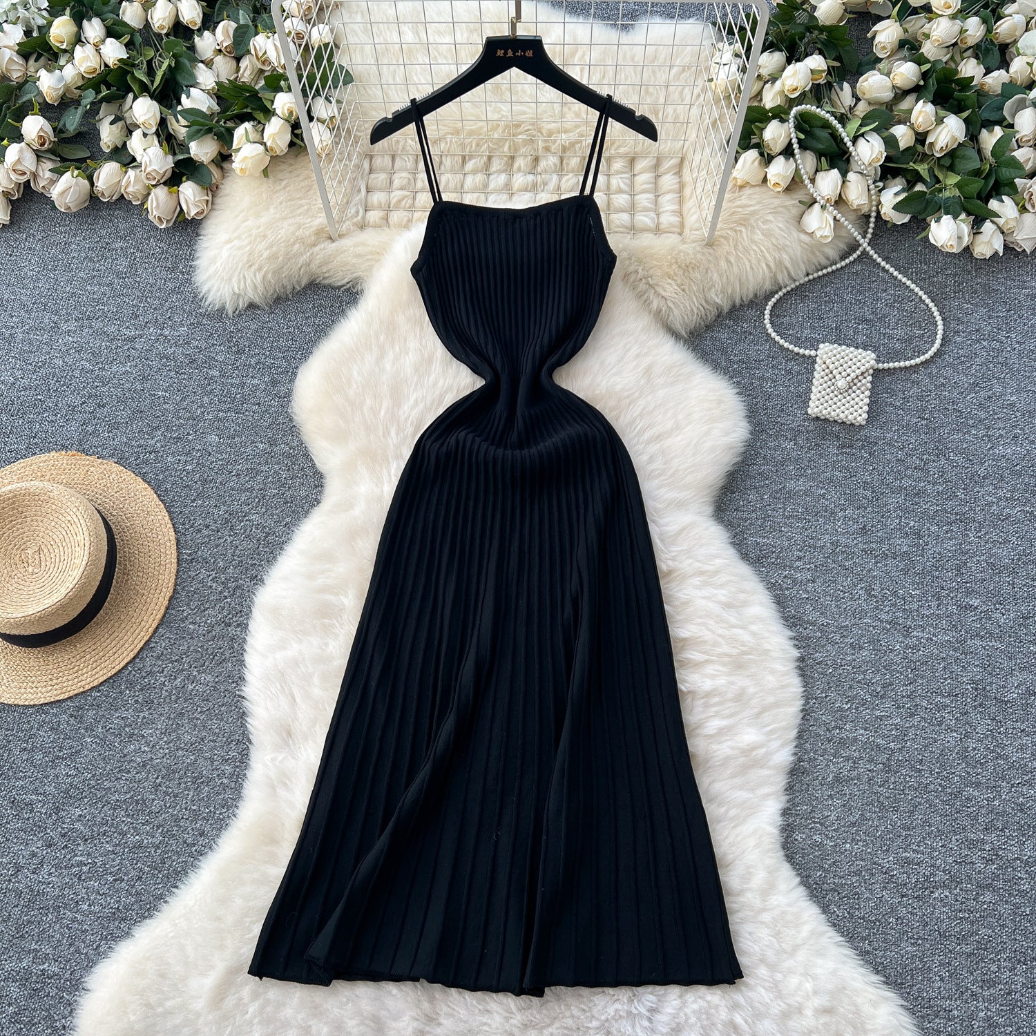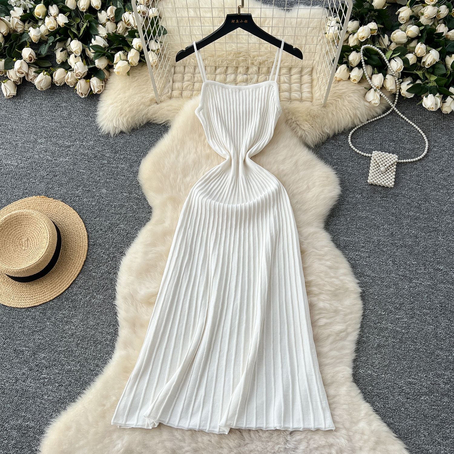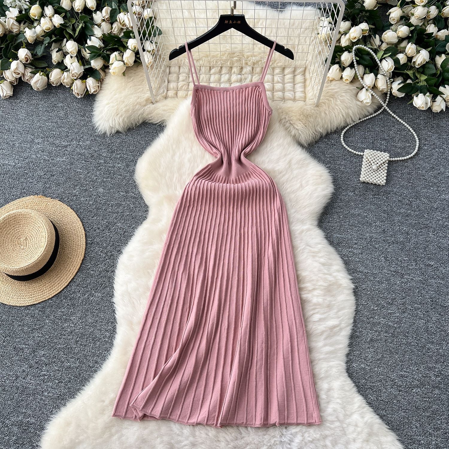 Summer Dress Women 2025 New Gentle Wind Temperament Slings Waists Thin Vertical Knitted Dress Inside The Long Skirt