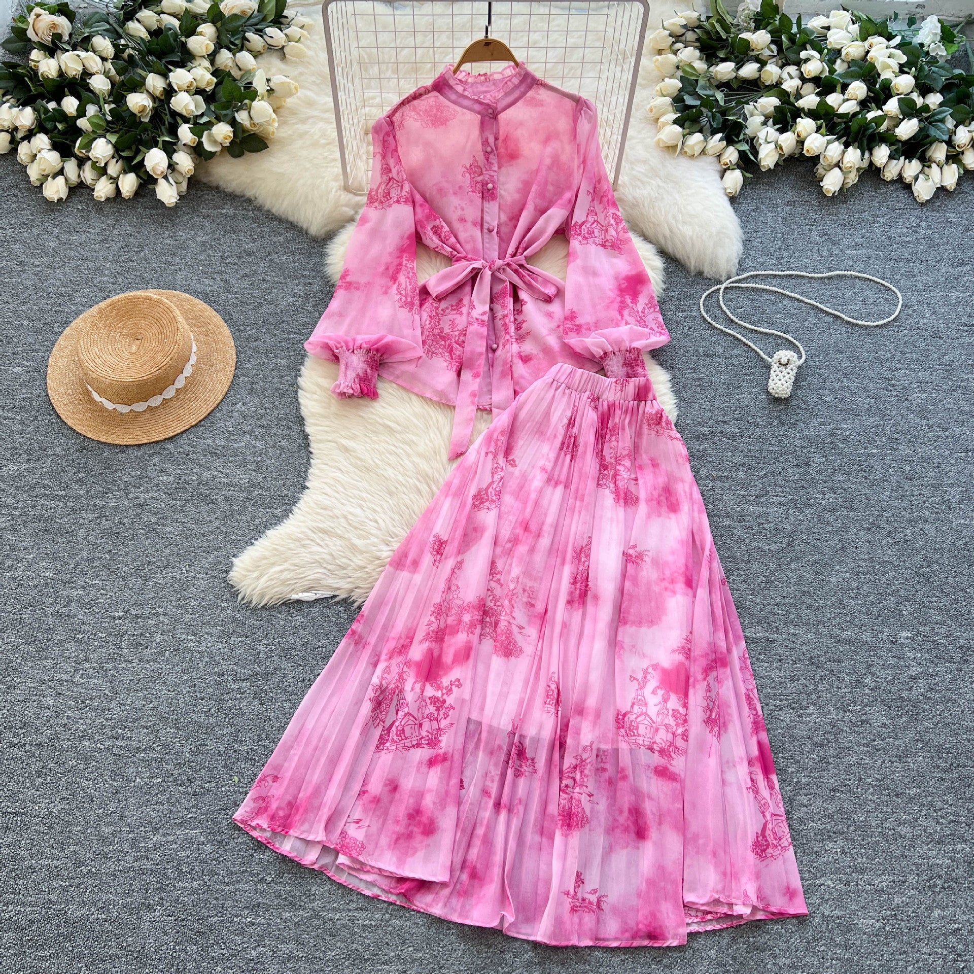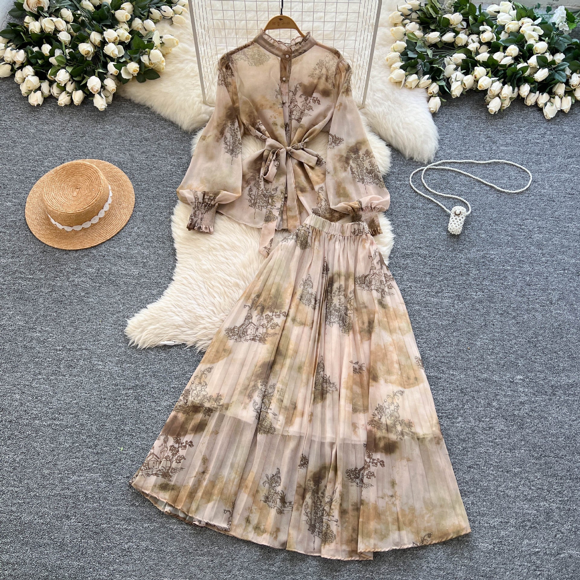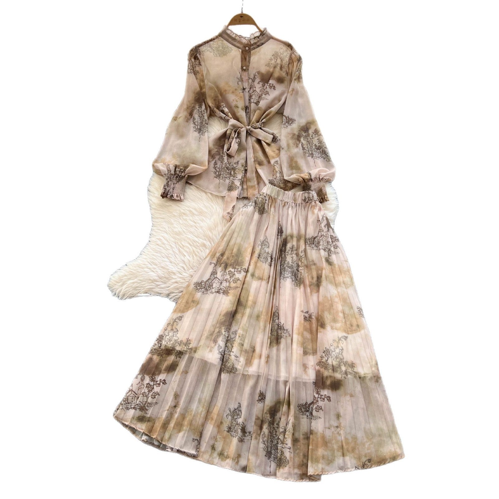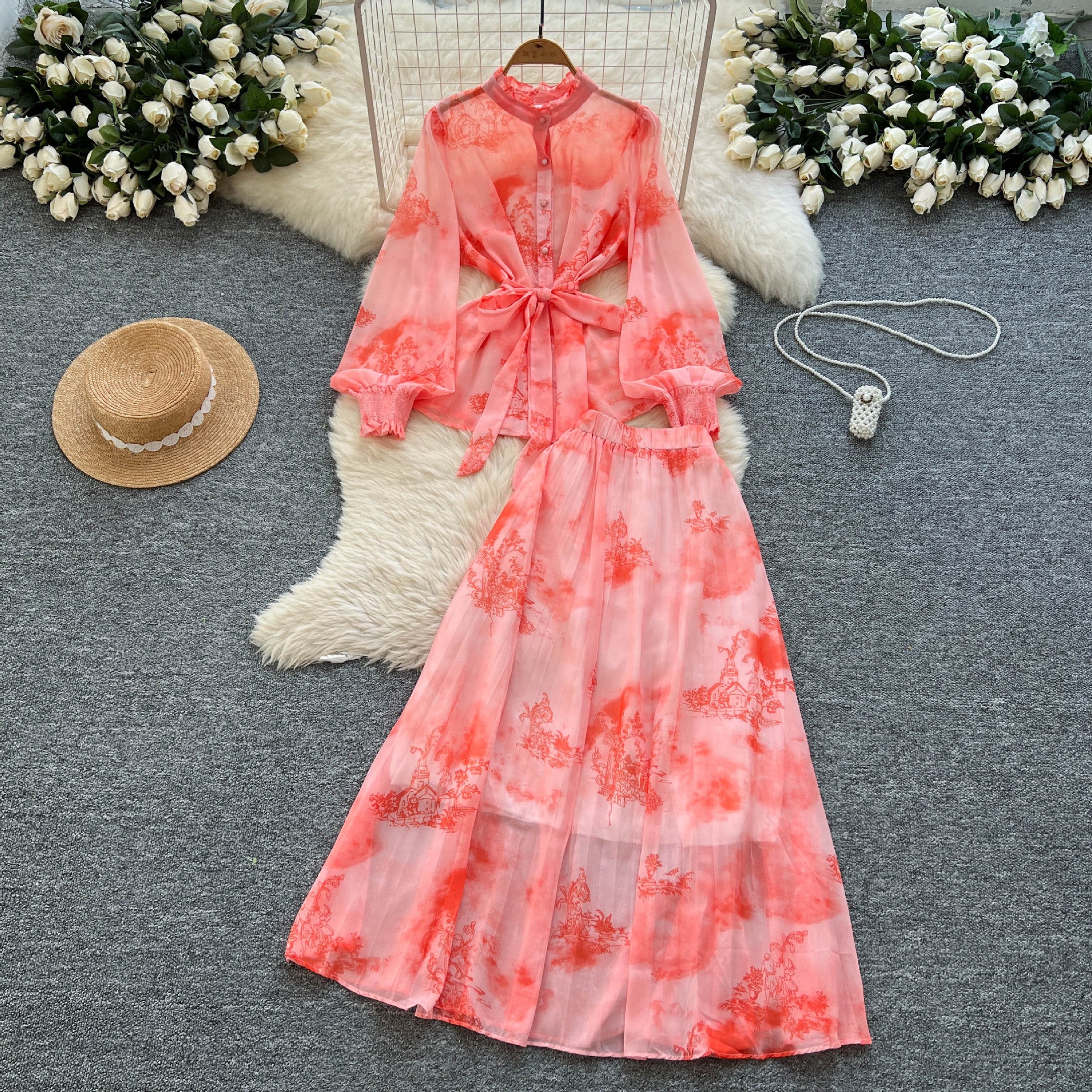 Temperament Two Sets Of Female High-Grade Style Straps To The Waist Lantern Sleeve Print Chiffon Top + High Waist Skirt