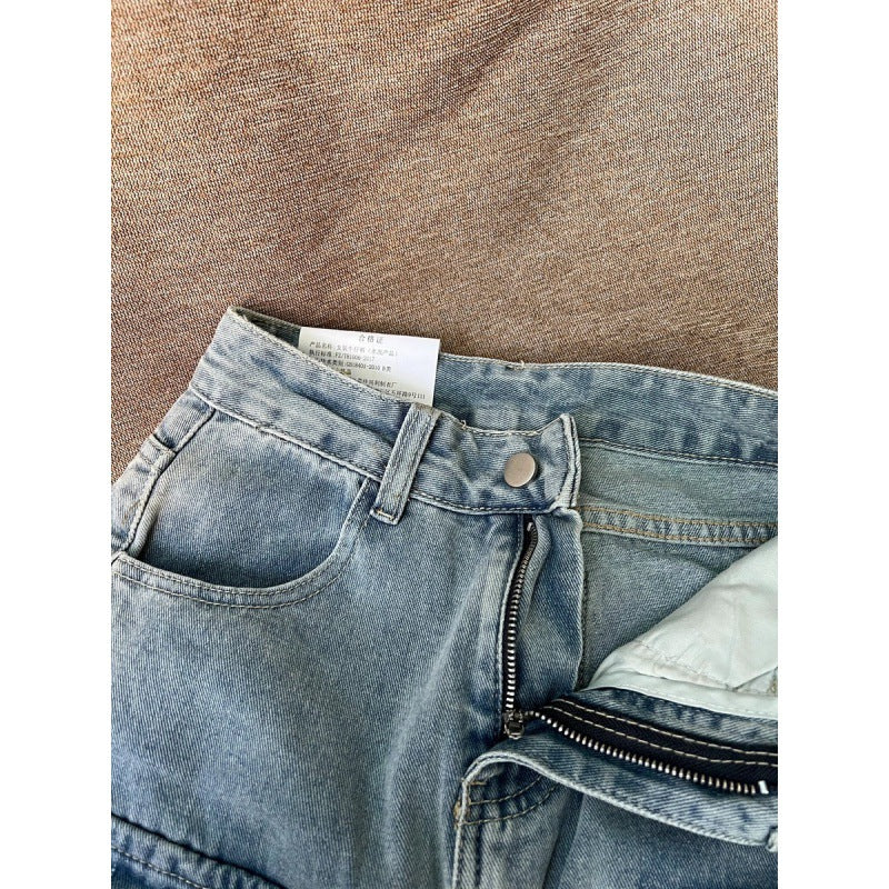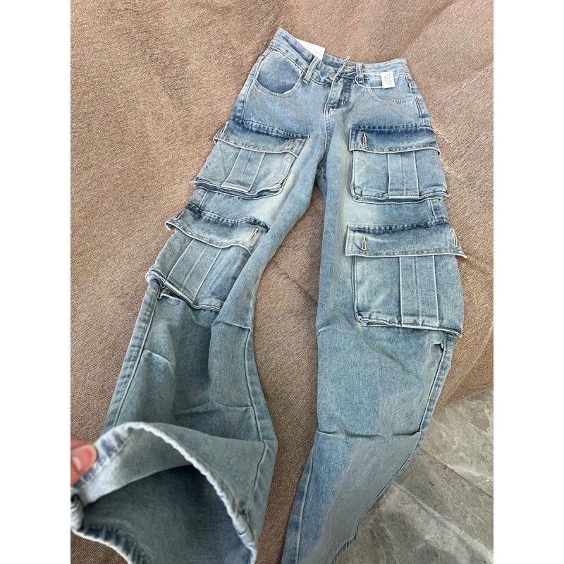 Vintage Multi-Pocket Workwear Jeans Women's Large Street Vibe High-Waist Broad Legs Casual Straight Pants