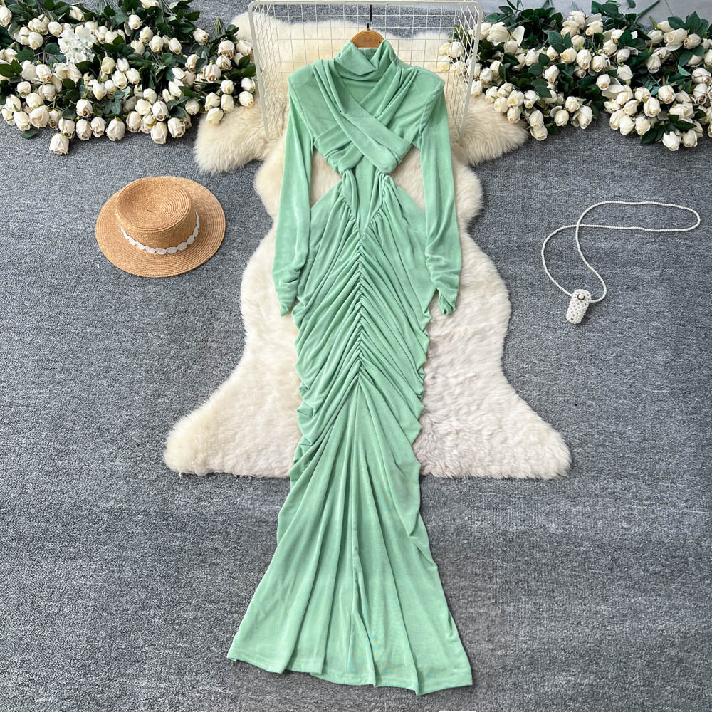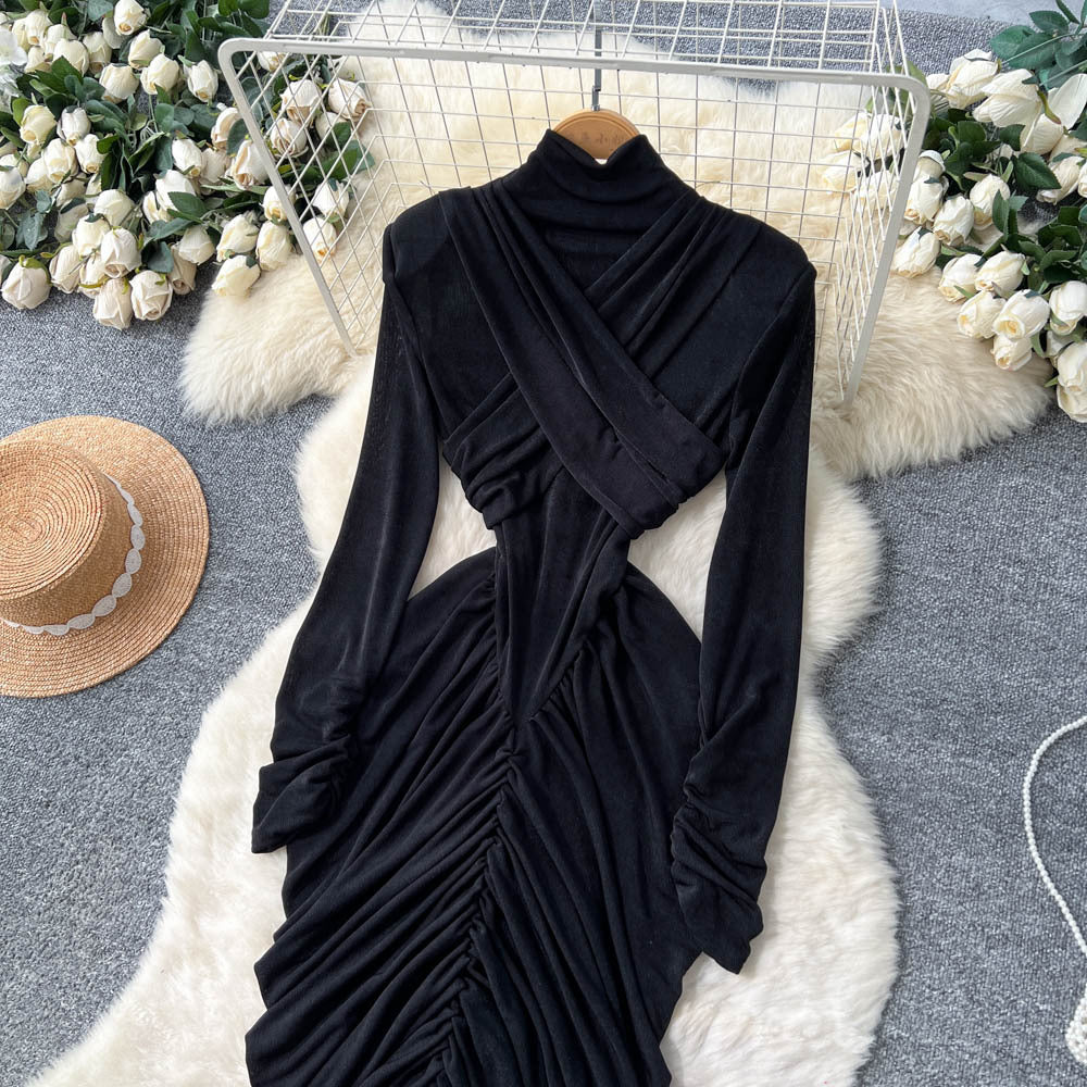 Women's Fashion Dress 2025 Autumn Design Feeling Cross-Folded Slim Top-Cuffed And High-Necked Dress