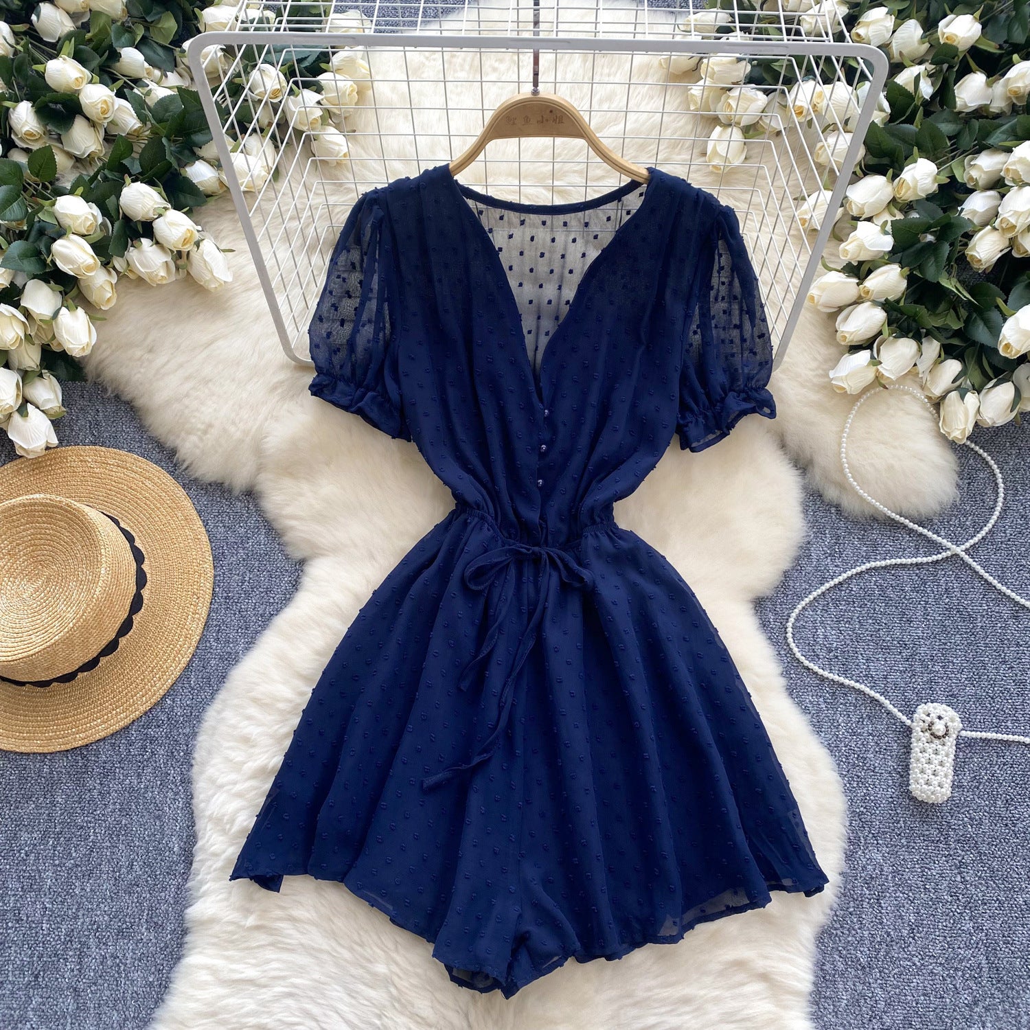 Women's Seaside Beach Pants Summer Dress New V-Neck Bubble Sleeves With Broad Legs Shorts