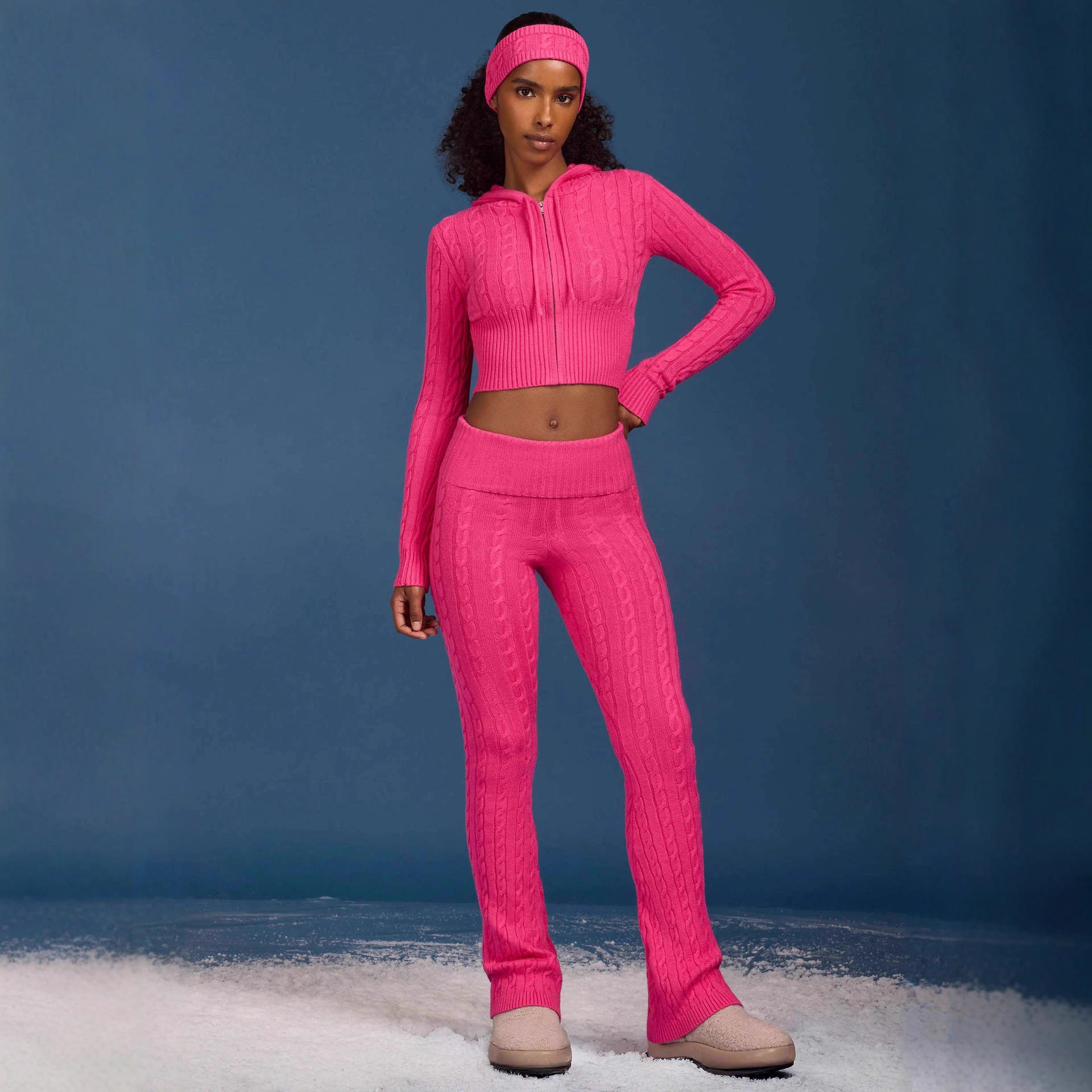 Women's Summer V-Neck Loose Knitted Cardigan Top + Broad Leg Trousers Set With Striped Hollow Set